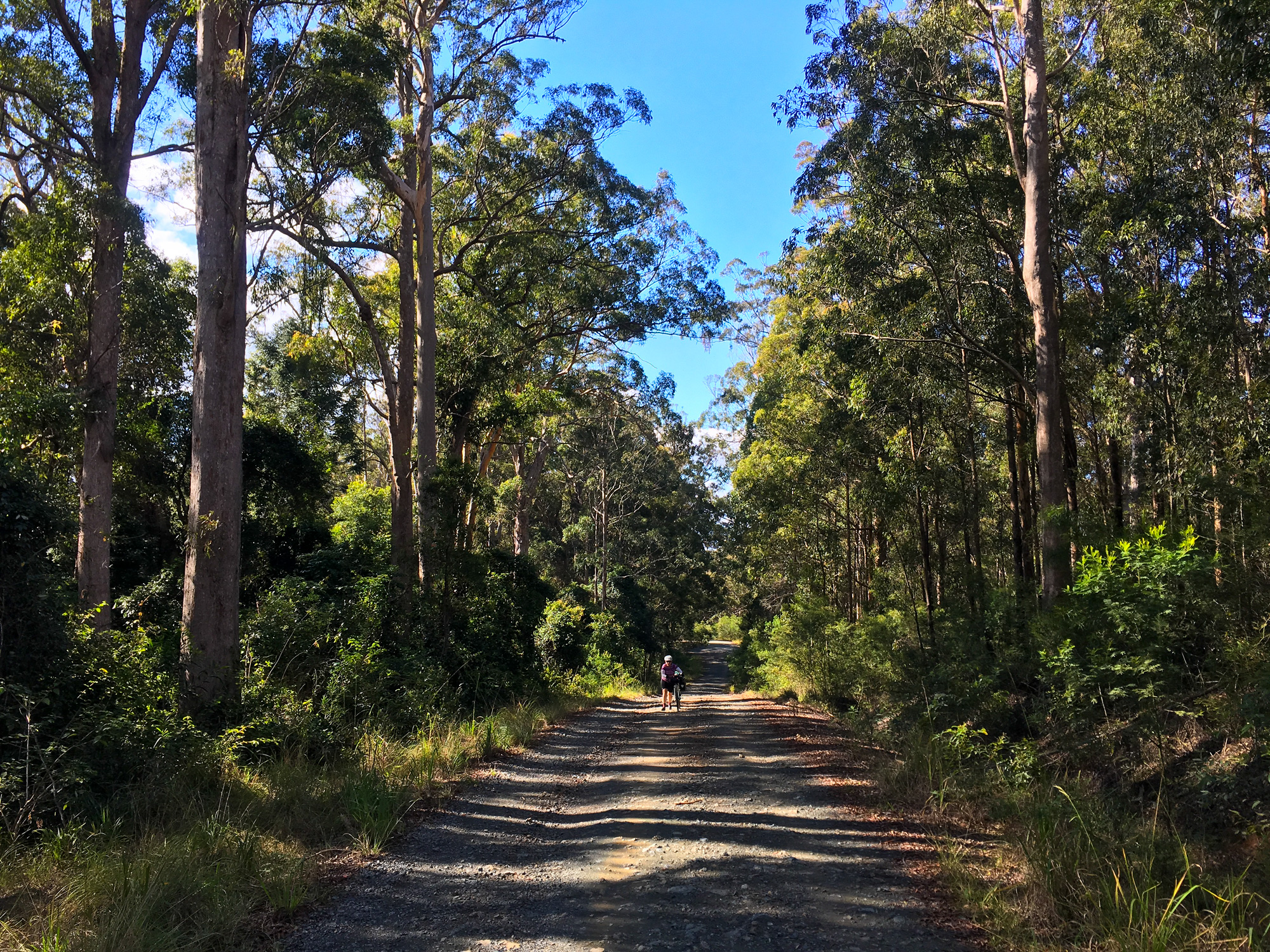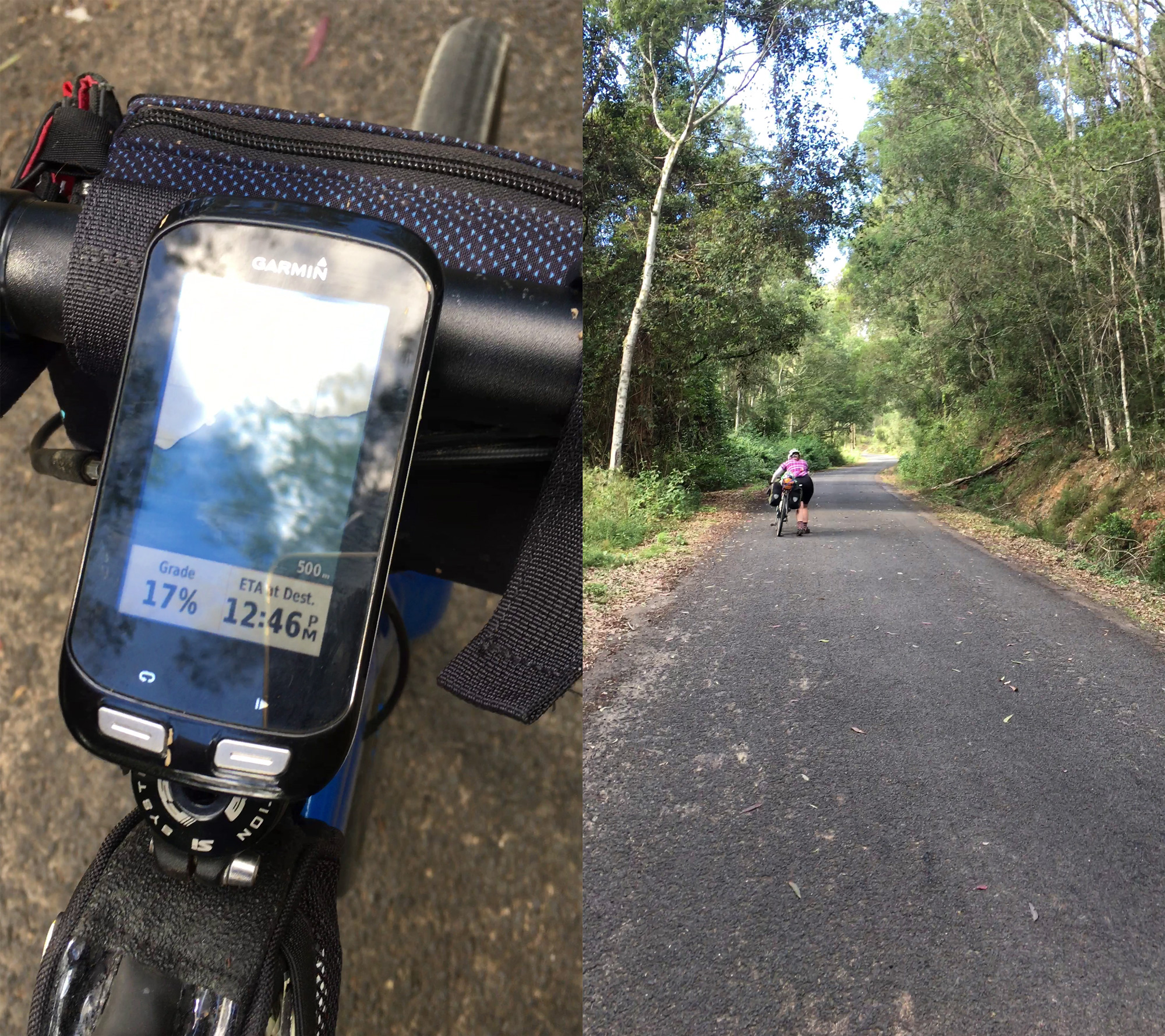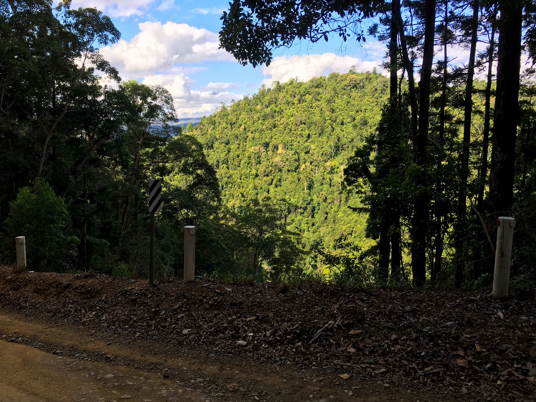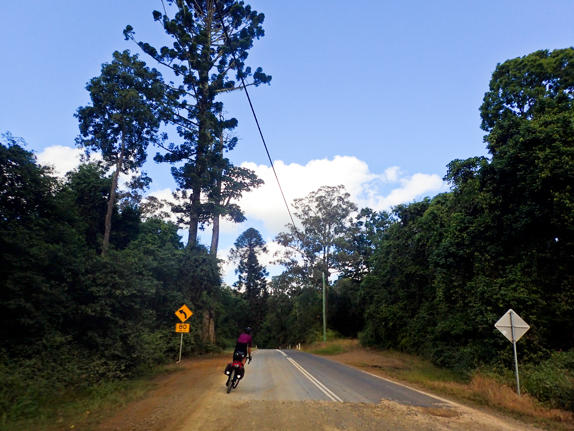 After a short walk to the top of the hill the tarmac road became gravel again with farm land on either side of the road before it was back into the thick forest of the Conondale National Park. When there wasn’t steep pinches it was quite nice riding around the rain forest with 30m tall trees – in some places trees were nearly double that height – lining both sides of the road – . But just like the road to Jimna we kept saying “Kenilworth is just around the corner”. By now Bronwyn was getting quite thirsty and had run out of water. As we crested one of the hills there were 2 SEQ Water workers having a break. I waved and hit the descent to get a photo of Bronwyn coming down. I waited. And waited…. and then she finally appeared before smashing it up the other side of the next steep pinch. We regrouped at the top and it turned out that she had got more water from the two blokes having a break. And that’s when we saw a cliff face appear on our Garmins as we approached an intersection. Was this the end of Sunday Creek Road and the descent into Kenilworth???
