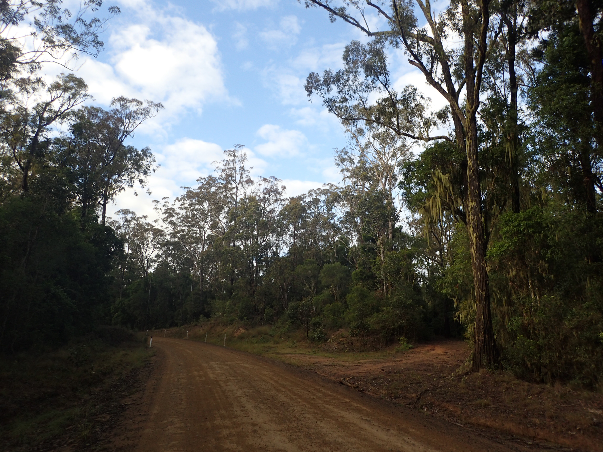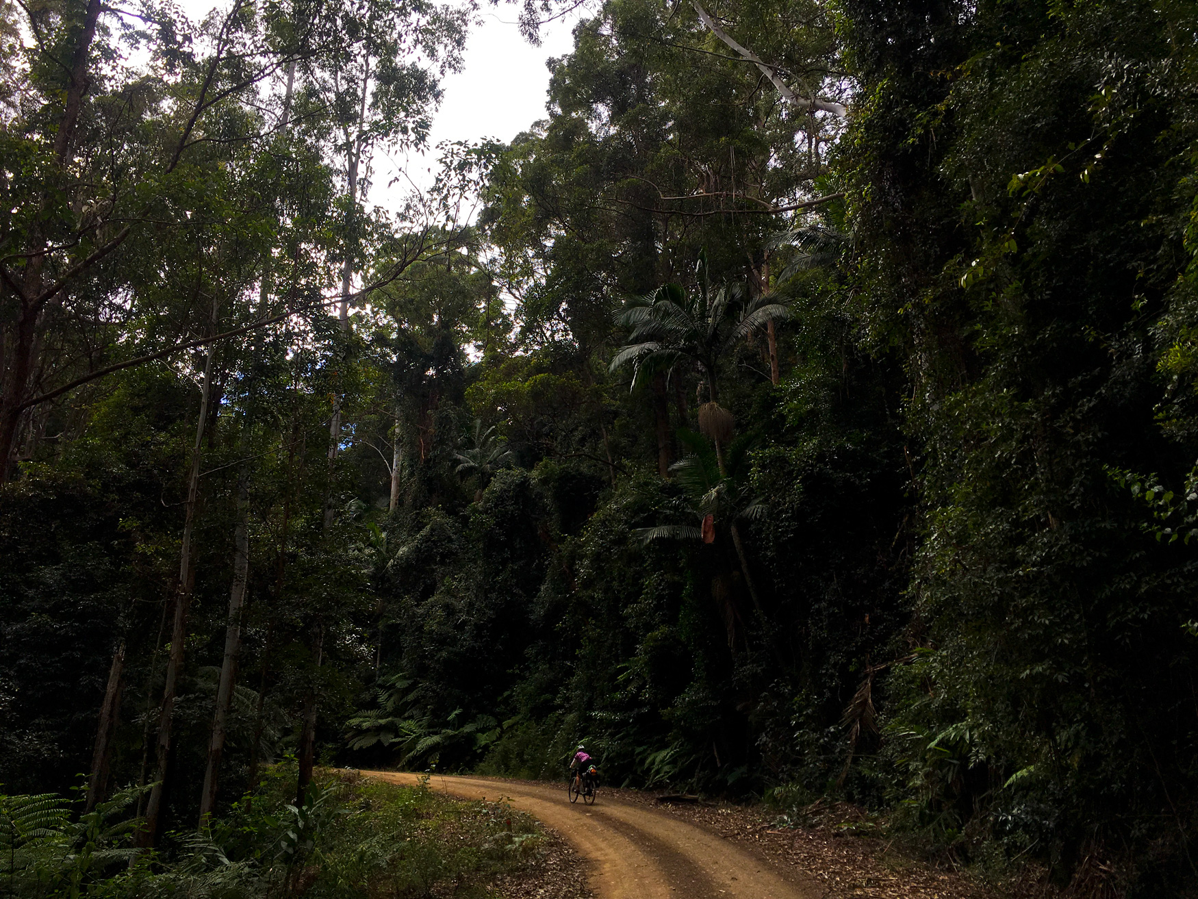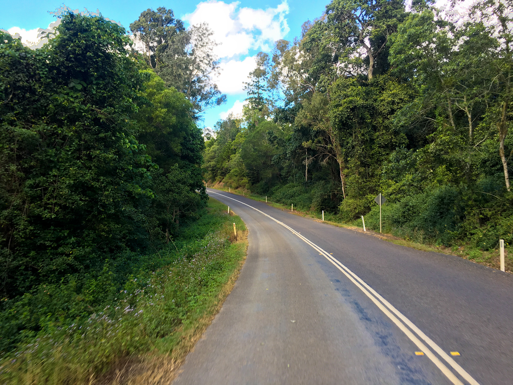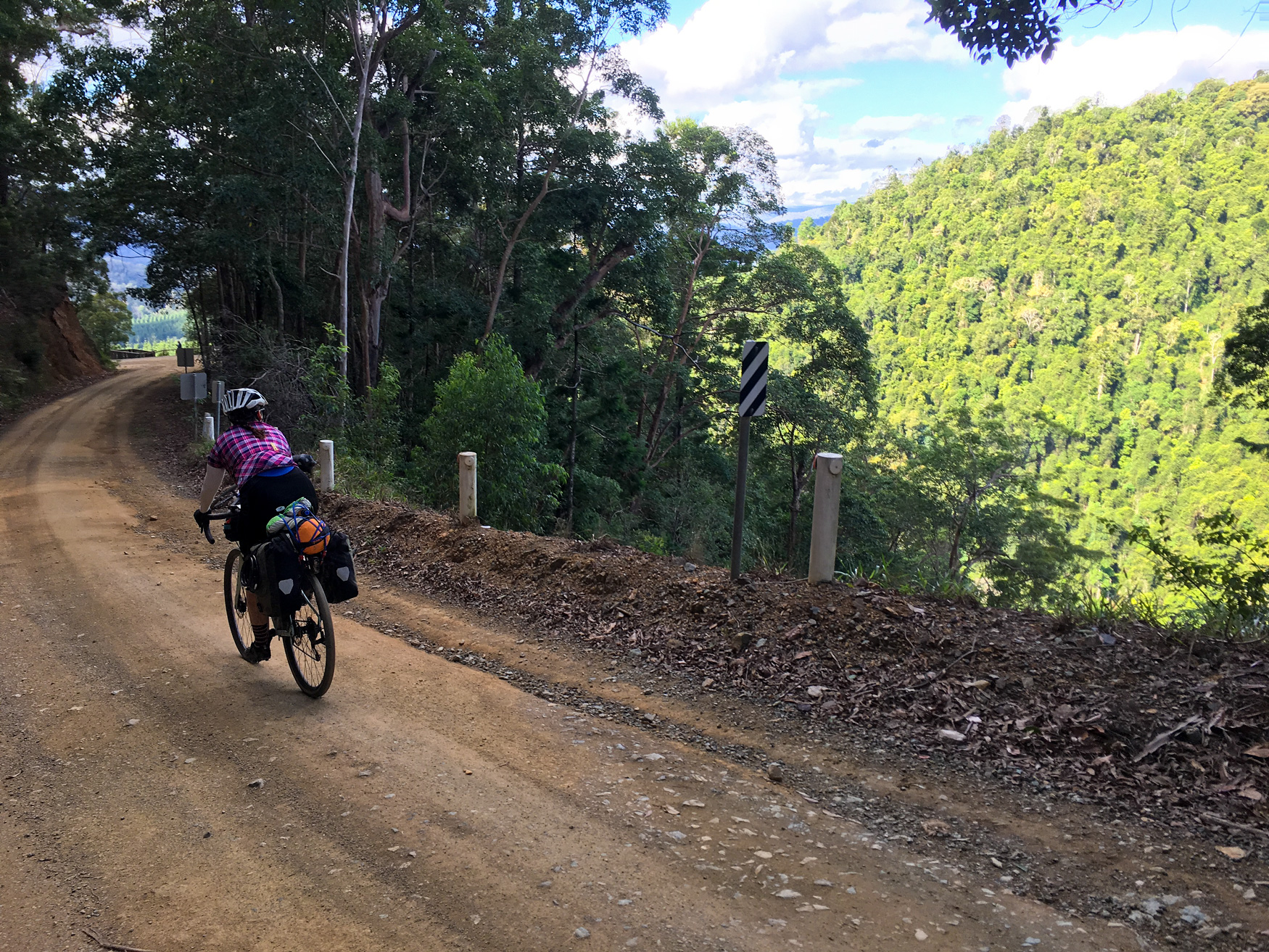 After a short walk to the top of the hill the tarmac road became gravel again with farm land on either side of the road before it was back into the thick forest of the Conondale National Park. When there wasn’t steep pinches it was quite nice riding around the rain forest with 30m tall trees – in some places trees were nearly double that height – lining both sides of the road – . But just like the road to Jimna we kept saying “Kenilworth is just around the corner”. By now Bronwyn was getting quite thirsty and had run out of water. As we crested one of the hills there were 2 SEQ Water workers having a break. I waved and hit the descent to get a photo of Bronwyn coming down. I waited. And waited…. and then she finally appeared before smashing it up the other side of the next steep pinch. We regrouped at the top and it turned out that she had got more water from the two blokes having a break. And that’s when we saw a cliff face appear on our Garmins as we approached an intersection. Was this the end of Sunday Creek Road and the descent into Kenilworth???