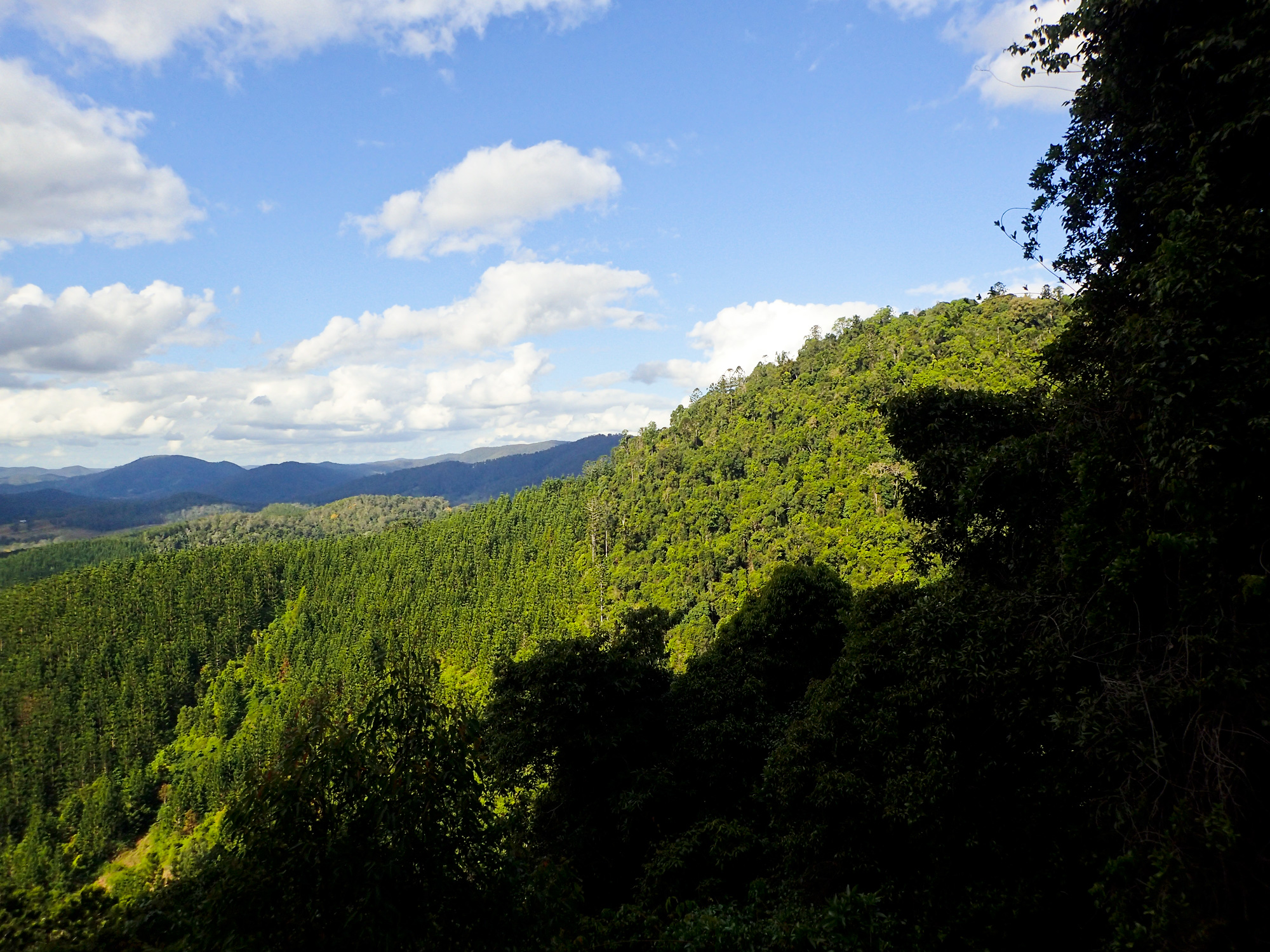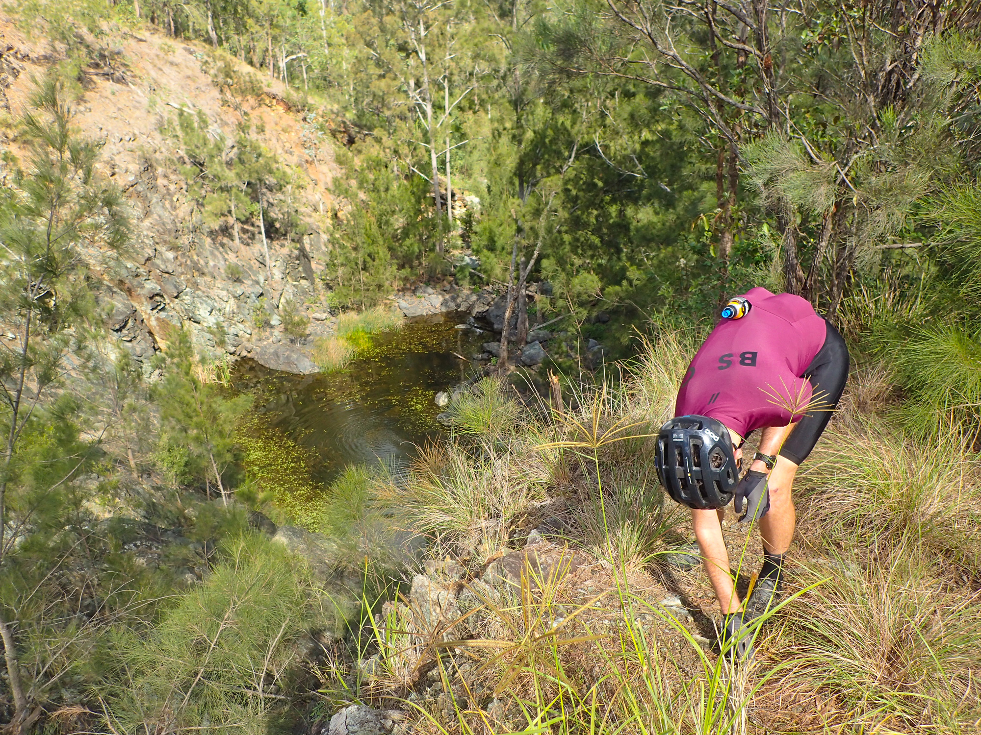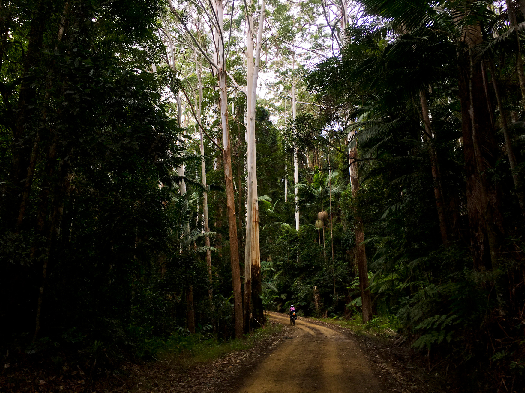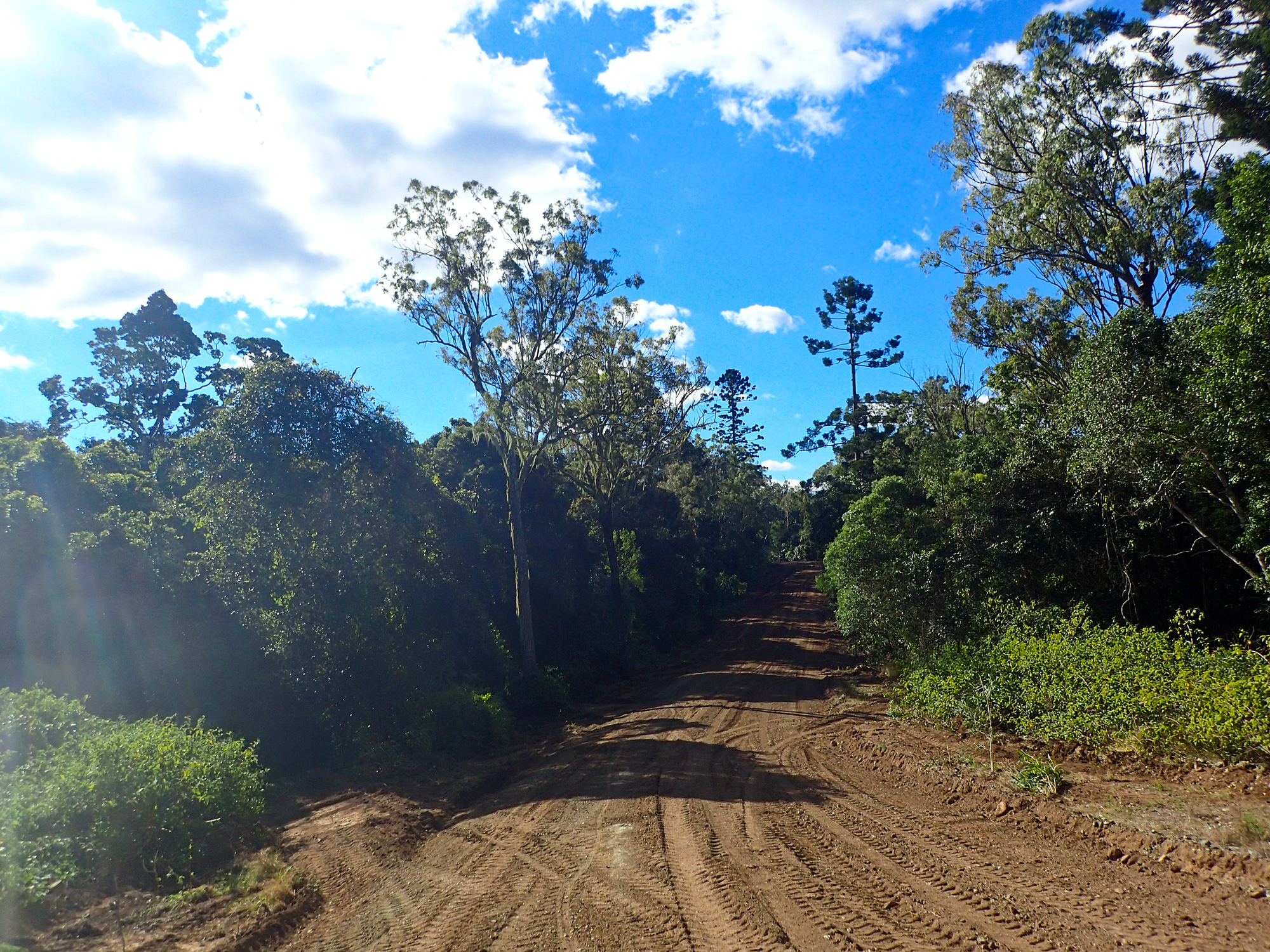 After a short walk to the top of the hill the tarmac road became gravel again with farm land on either side of the road before it was back into the thick forest of the Conondale National Park. When there wasn’t steep pinches it was quite nice riding around the rain forest with 30m tall trees – in some places trees were nearly double that height – lining both sides of the road – . But just like the road to Jimna we kept saying “Kenilworth is just around the corner”. By now Bronwyn was getting quite thirsty and had run out of water. As we crested one of the hills there were 2 SEQ Water workers having a break. I waved and hit the descent to get a photo of Bronwyn coming down. I waited. And waited…. and then she finally appeared before smashing it up the other side of the next steep pinch. We regrouped at the top and it turned out that she had got more water from the two blokes having a break. And that’s when we saw a cliff face appear on our Garmins as we approached an intersection. Was this the end of Sunday Creek Road and the descent into Kenilworth???