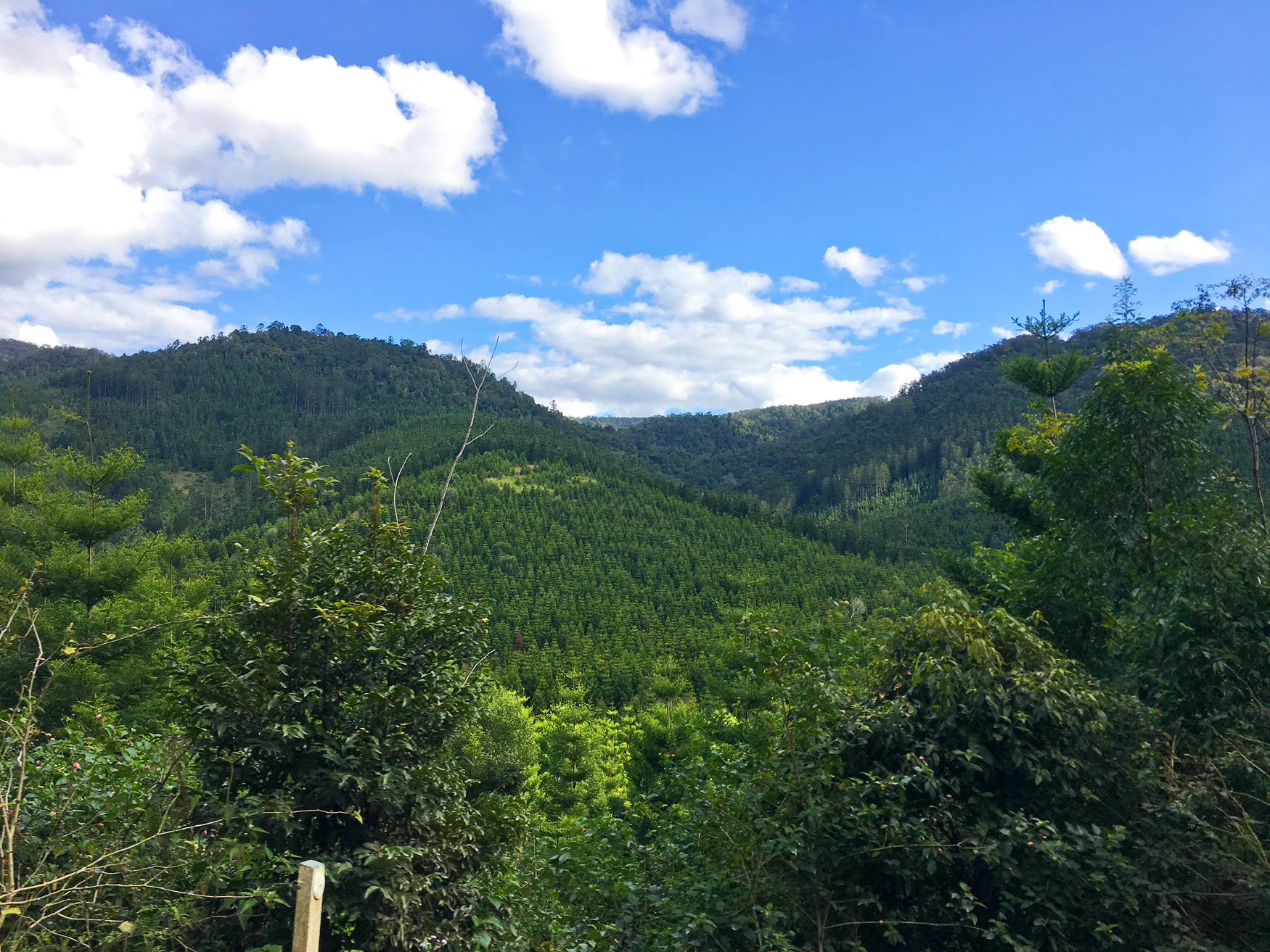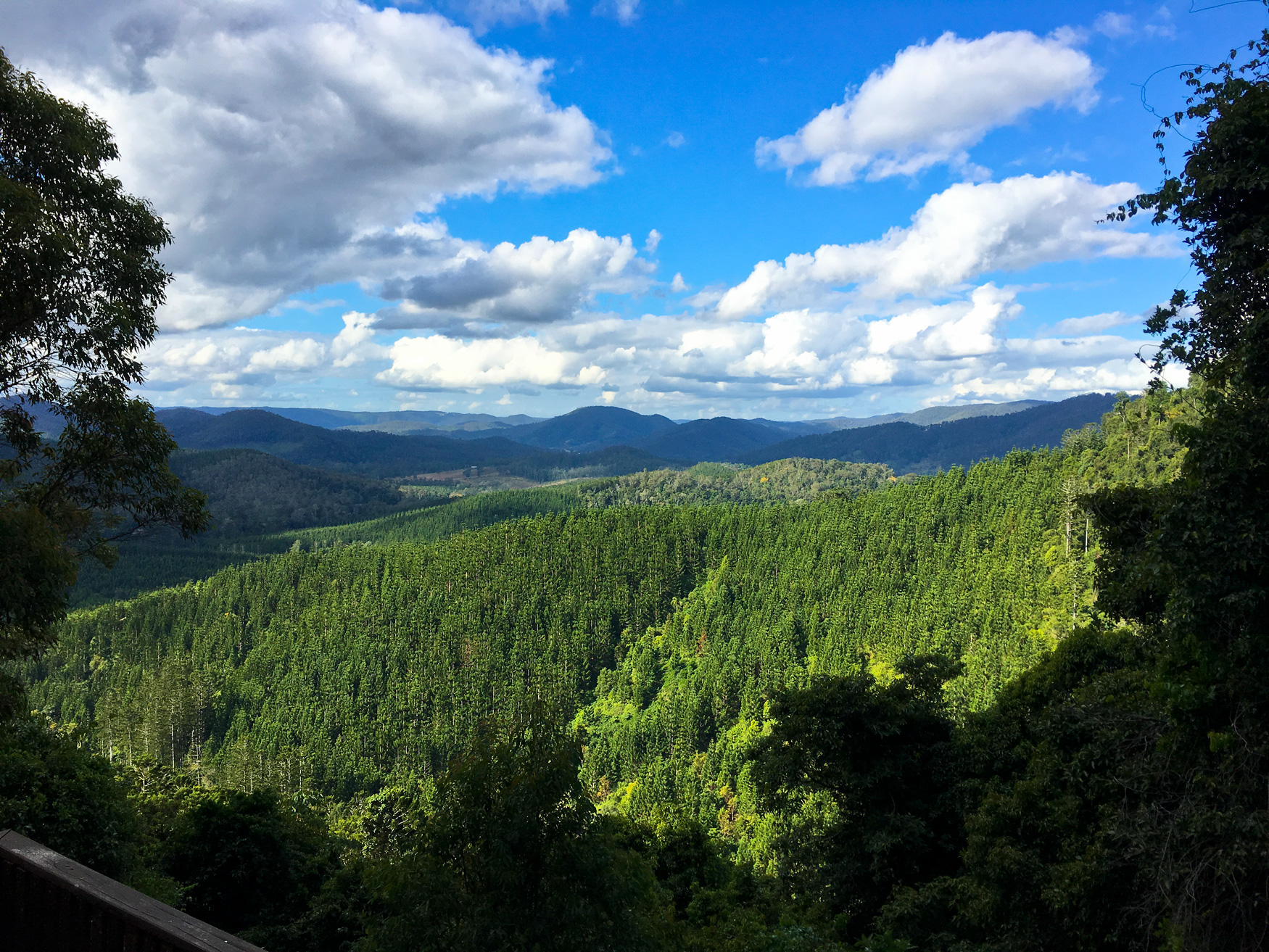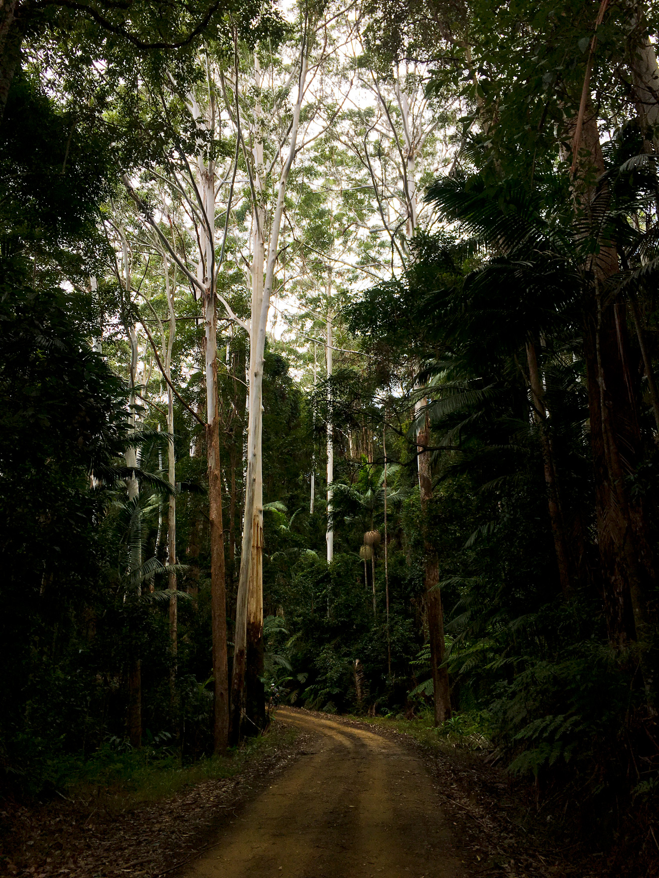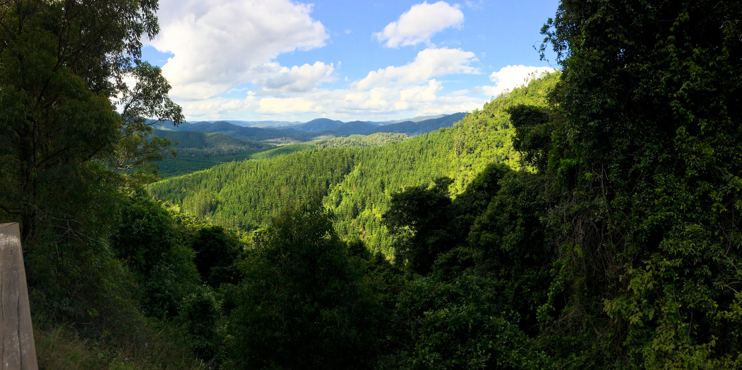 After a short walk to the top of the hill the tarmac road became gravel again with farm land on either side of the road before it was back into the thick forest of the Conondale National Park. When there wasn’t steep pinches it was quite nice riding around the rain forest with 30m tall trees – in some places trees were nearly double that height – lining both sides of the road – . But just like the road to Jimna we kept saying “Kenilworth is just around the corner”. By now Bronwyn was getting quite thirsty and had run out of water. As we crested one of the hills there were 2 SEQ Water workers having a break. I waved and hit the descent to get a photo of Bronwyn coming down. I waited. And waited…. and then she finally appeared before smashing it up the other side of the next steep pinch. We regrouped at the top and it turned out that she had got more water from the two blokes having a break. And that’s when we saw a cliff face appear on our Garmins as we approached an intersection. Was this the end of Sunday Creek Road and the descent into Kenilworth???