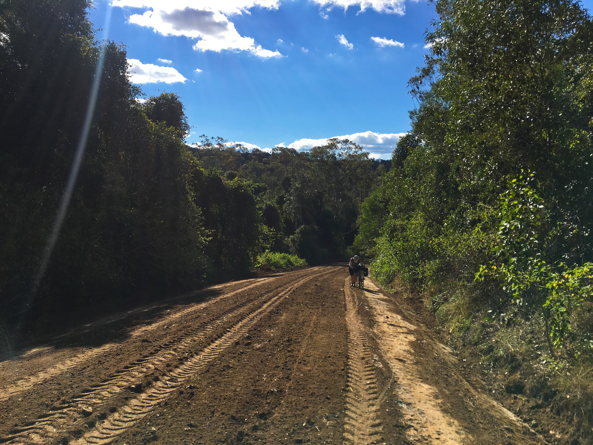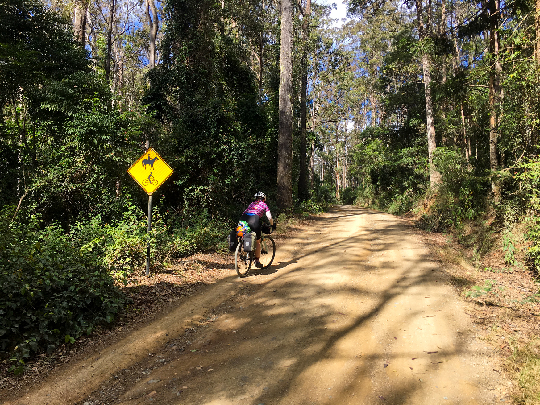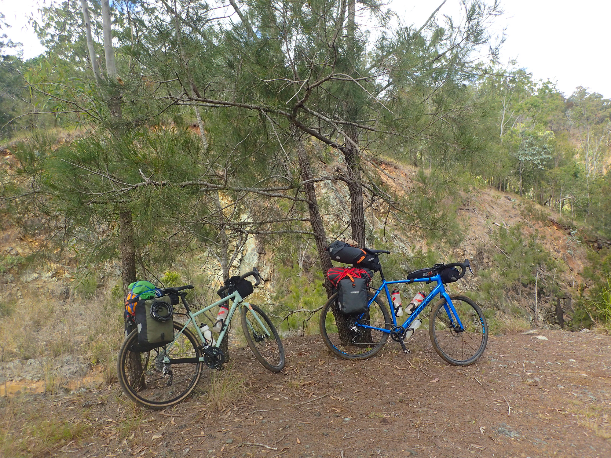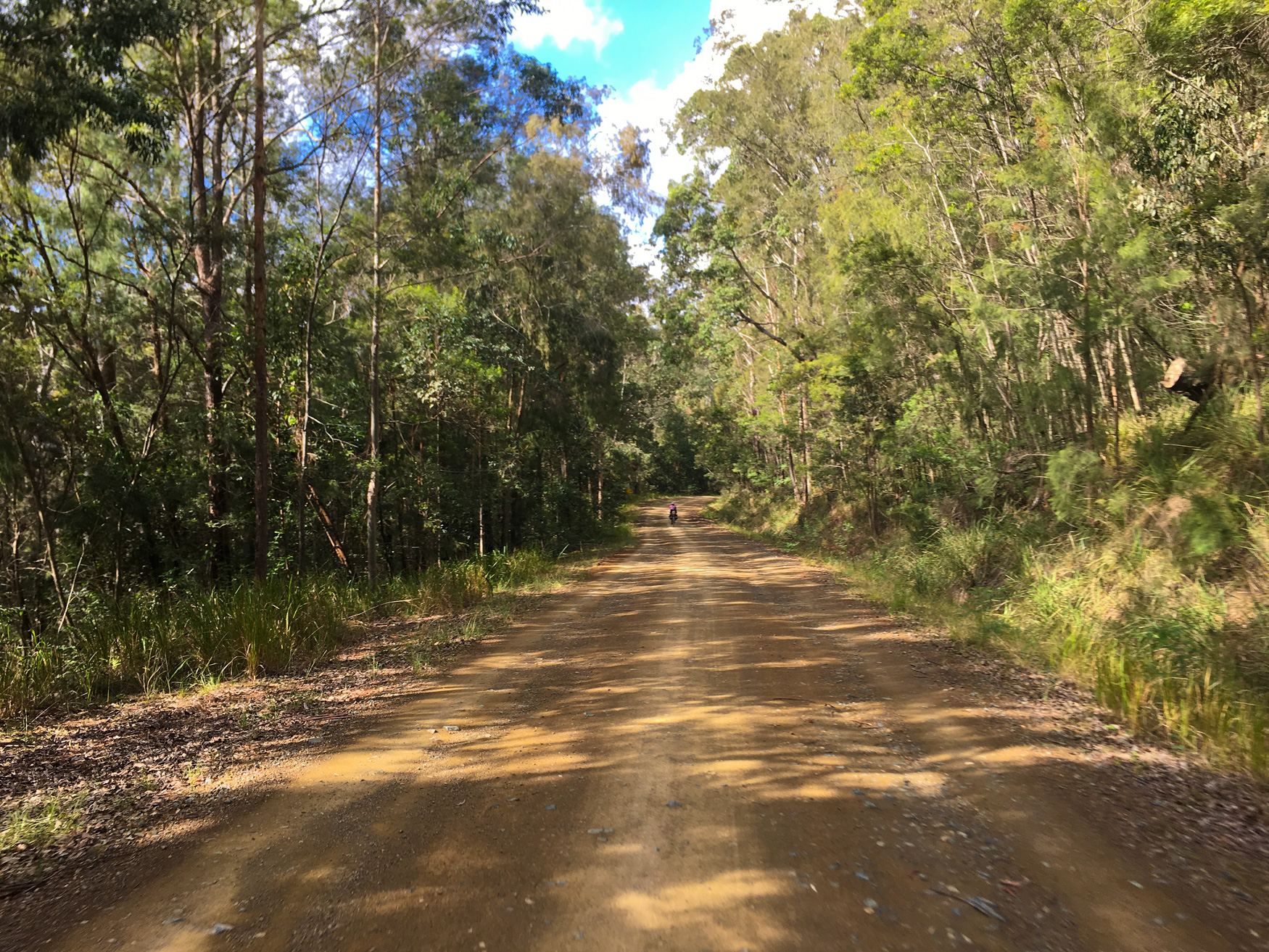 As we were travelling along dirt roads through multiple state forests we lost all track of time and where we were in relation to Jimna as there was no landmarks to gauge references because of the to the thick forest scrub. Jimna always seemed to be “Just around the corner”. But once the gravel road turned to tarmac that’s when we knew Jimna was actually just around the corner…. which we passed very quickly as we made our way down the hill to Sunday Creek road. This section of road was where all the elevation, steep climbs and steep descents were hiding. And that was confirmed a couple hundred meters after the turn off when we came to a 20% wall that wasn’t the ideal for our loaded gravel bikes.