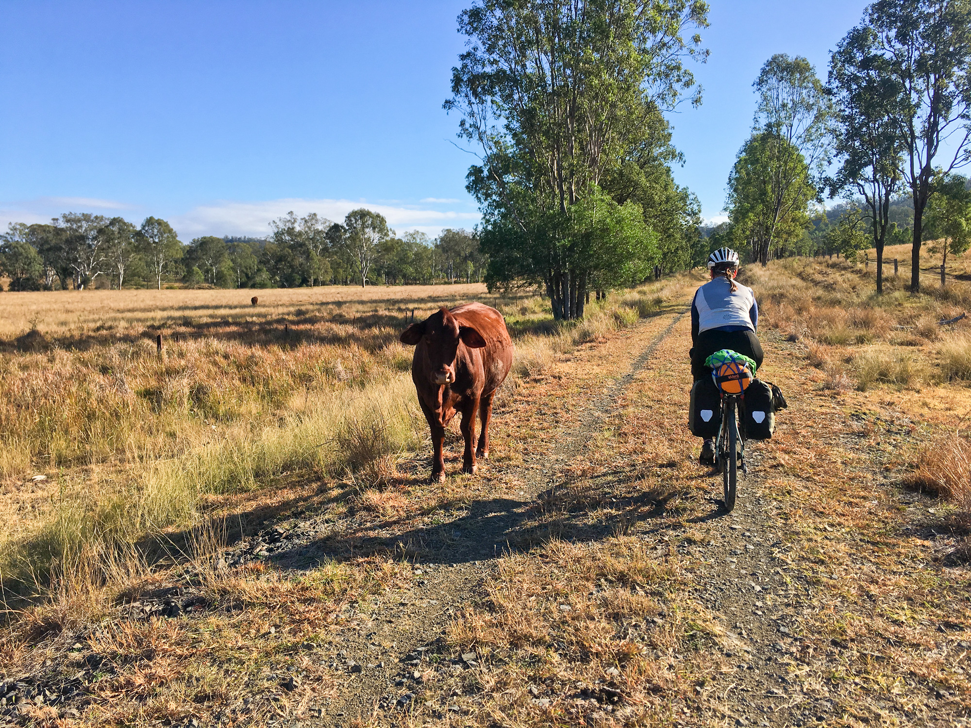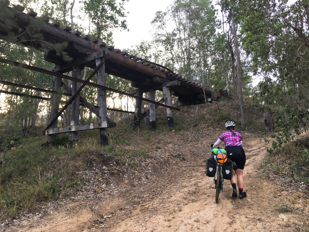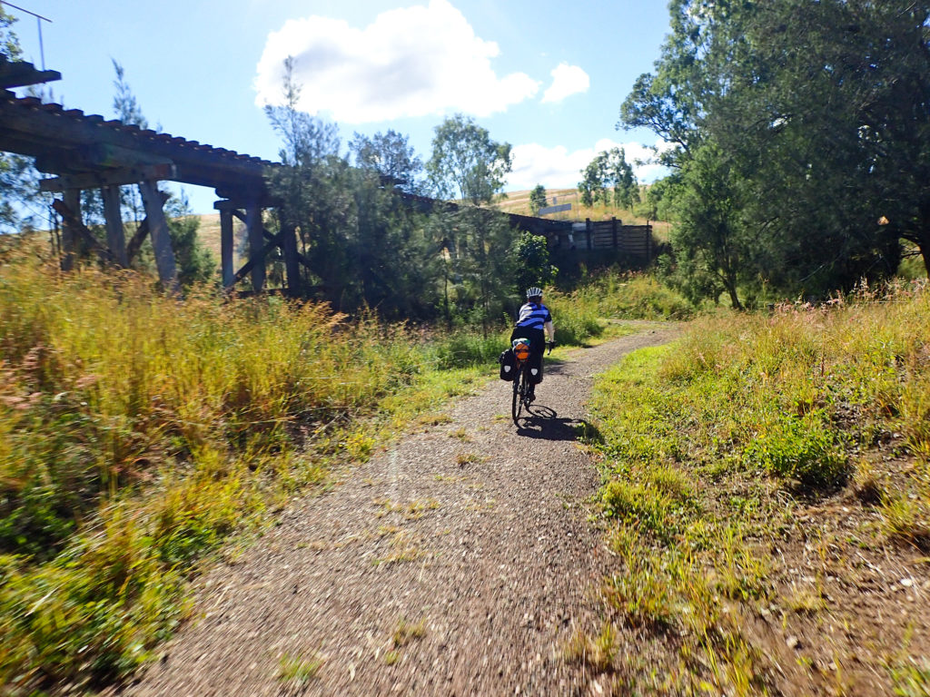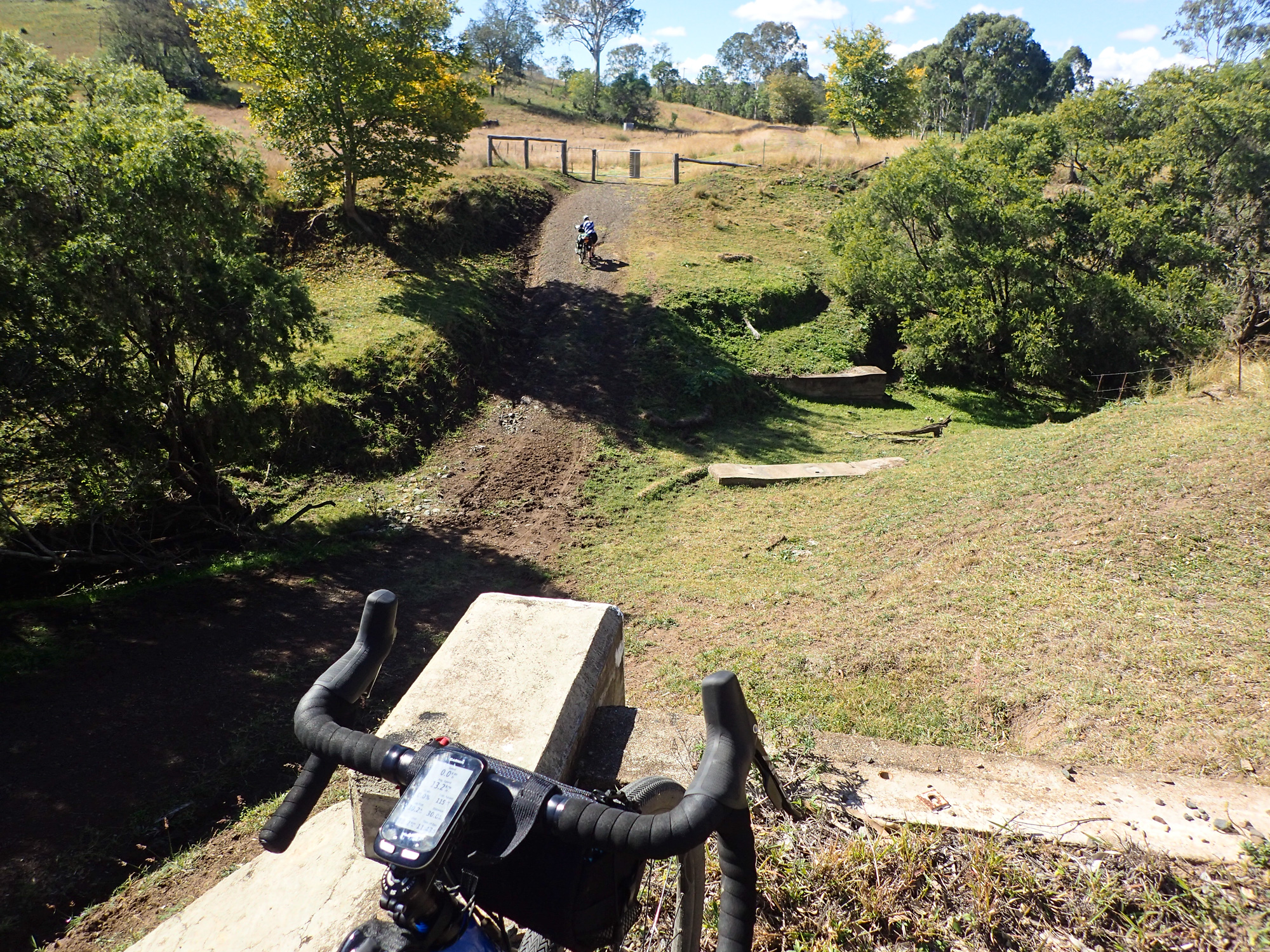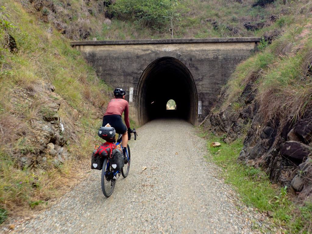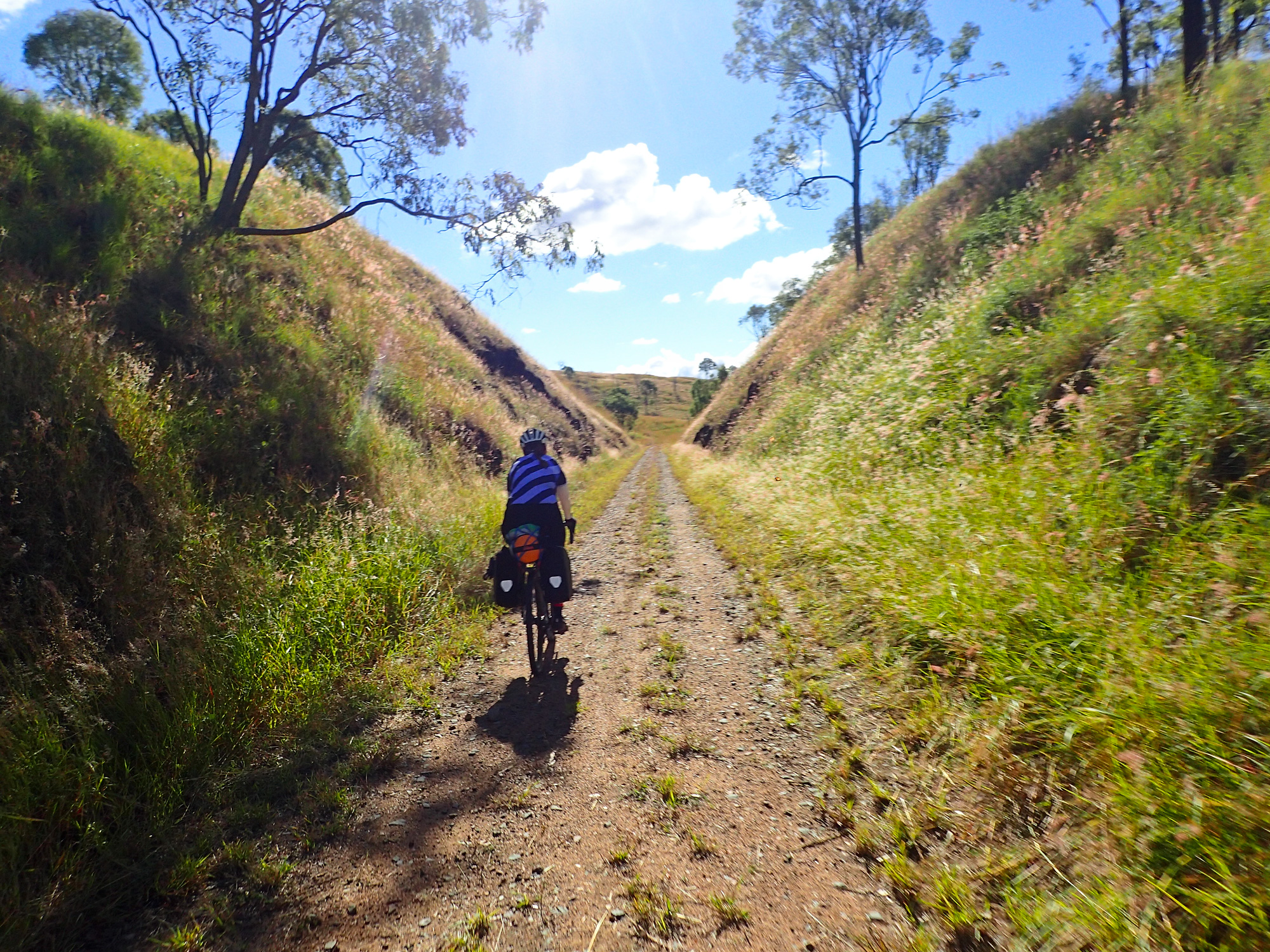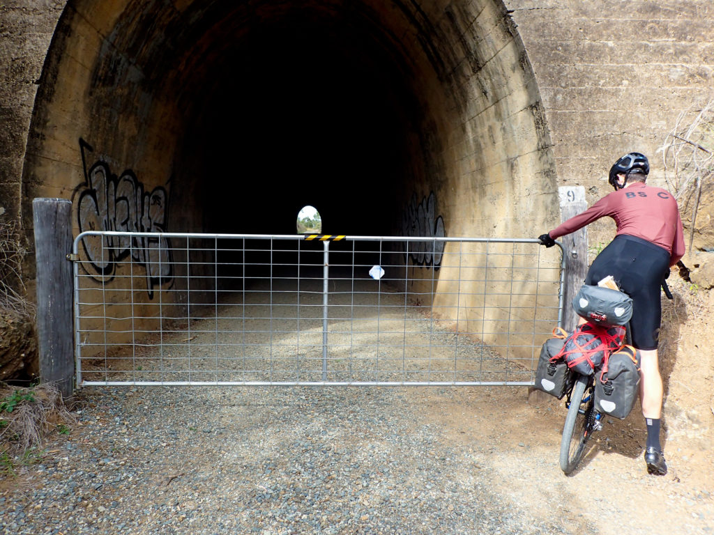 Day 2 saw us doing Esk-Yarraman which was 101km with 1061m of elevation gain. Since Esk is behind a mountain the sun doesn’t hit the town until about 8am in winter so its always very chilly. As a result we waited a little longer in our warm motel room before we set off. Once we did we only got moving for a couple hundred meters as we stopped at the bakery, got some sandwiches and had a light breaky ie sausage rolls before tackling the hardest section of the entire rail trail. The ballast section of Esk to Toogoolawah. It didn’t take too long before we had our first problem. Bronwyn stopped at the driveway for Mount View just outside of Esk to remove her jacket only to have the bike fall over as I just stood there taking photos and smiling 🙂 While the Esk-Toogoolawah section doesn’t that many major elevation gains, creek crossings or gates the sections that have ballast really takes a toll on your upper body/wrists/hands. So to avoid the bumps and sharp jolts you have to go faster which is easier said then done on a fully loaded gravel bike. Along the way we came across lots and lots of cows that graze along the trail. When we first did the rail trail they’d always run away from you. Now they just look at you or not bother at all. We arrived at Toogoolawah where we had a proper breakfast and recovered a bit after the ballast section. Not long later we departed for Moore. A year earlier the Toogoolawah to Moore section was constructed and had a good road base applied to the trail which is now starting to show signs of its age instead of its previous smoothness which you could ride a road bike on without a problem. This section of trail includes many creek crossings and the original 100m long Yimbun Railway Tunnel constructed in 1910 which is one of the very few tunnels left that can be traversed by foot in Queensland.