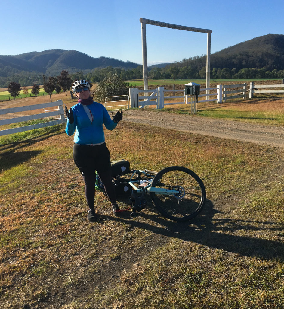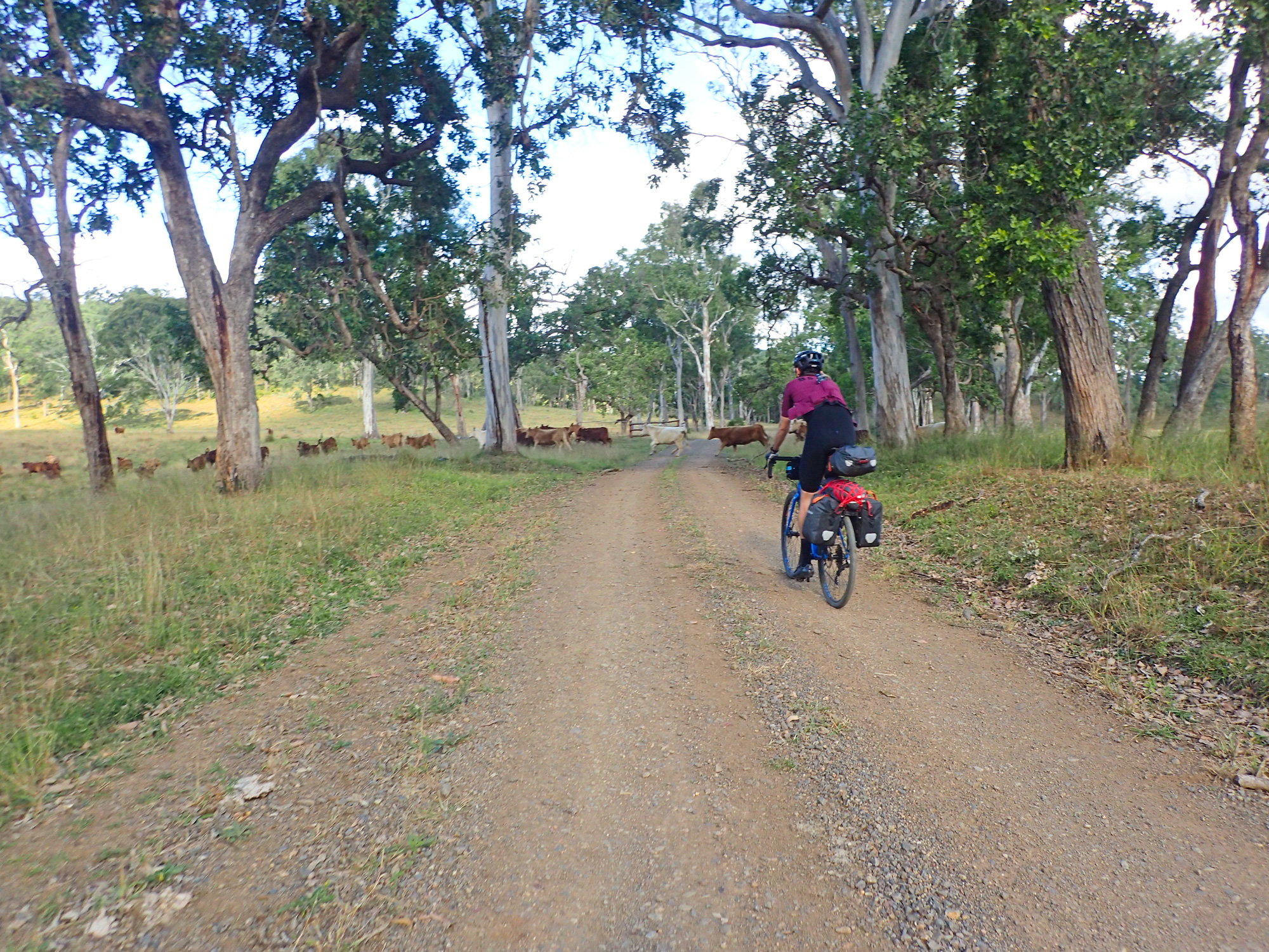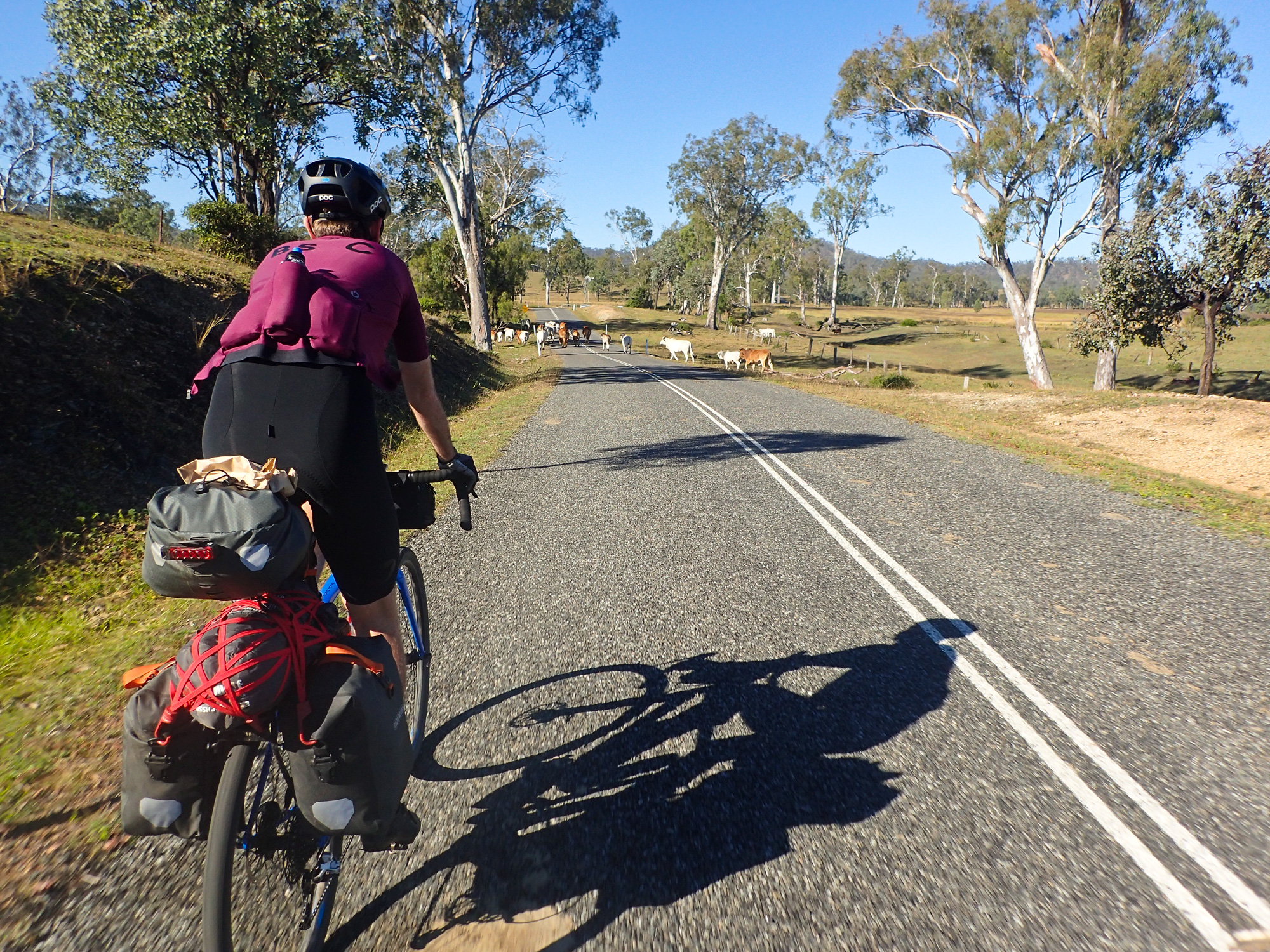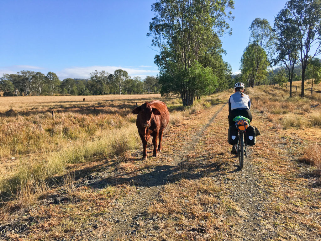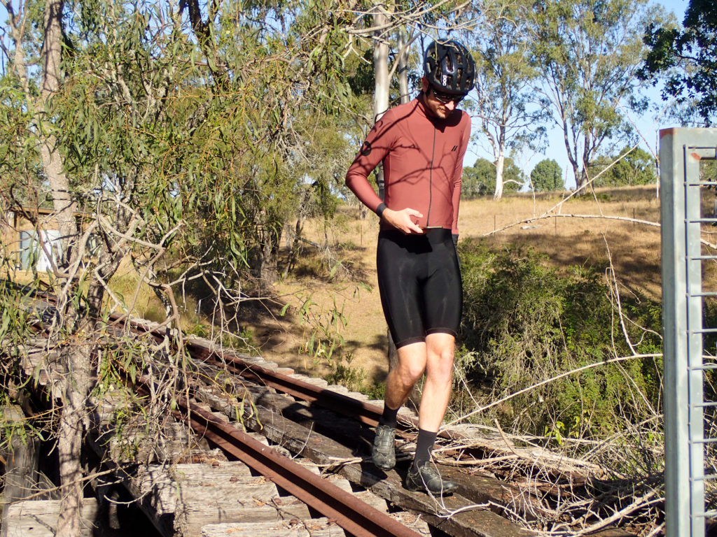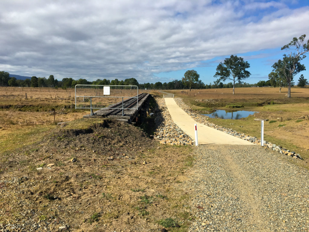 Day 2 saw us doing Esk-Yarraman which was 101km with 1061m of elevation gain. Since Esk is behind a mountain the sun doesn’t hit the town until about 8am in winter so its always very chilly. As a result we waited a little longer in our warm motel room before we set off. Once we did we only got moving for a couple hundred meters as we stopped at the bakery, got some sandwiches and had a light breaky ie sausage rolls before tackling the hardest section of the entire rail trail. The ballast section of Esk to Toogoolawah. It didn’t take too long before we had our first problem. Bronwyn stopped at the driveway for Mount View just outside of Esk to remove her jacket only to have the bike fall over as I just stood there taking photos and smiling 🙂 While the Esk-Toogoolawah section doesn’t that many major elevation gains, creek crossings or gates the sections that have ballast really takes a toll on your upper body/wrists/hands. So to avoid the bumps and sharp jolts you have to go faster which is easier said then done on a fully loaded gravel bike. Along the way we came across lots and lots of cows that graze along the trail. When we first did the rail trail they’d always run away from you. Now they just look at you or not bother at all. We arrived at Toogoolawah where we had a proper breakfast and recovered a bit after the ballast section. Not long later we departed for Moore. A year earlier the Toogoolawah to Moore section was constructed and had a good road base applied to the trail which is now starting to show signs of its age instead of its previous smoothness which you could ride a road bike on without a problem. This section of trail includes many creek crossings and the original 100m long Yimbun Railway Tunnel constructed in 1910 which is one of the very few tunnels left that can be traversed by foot in Queensland.