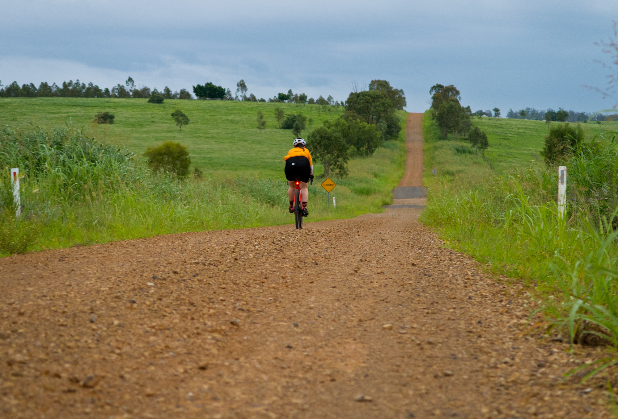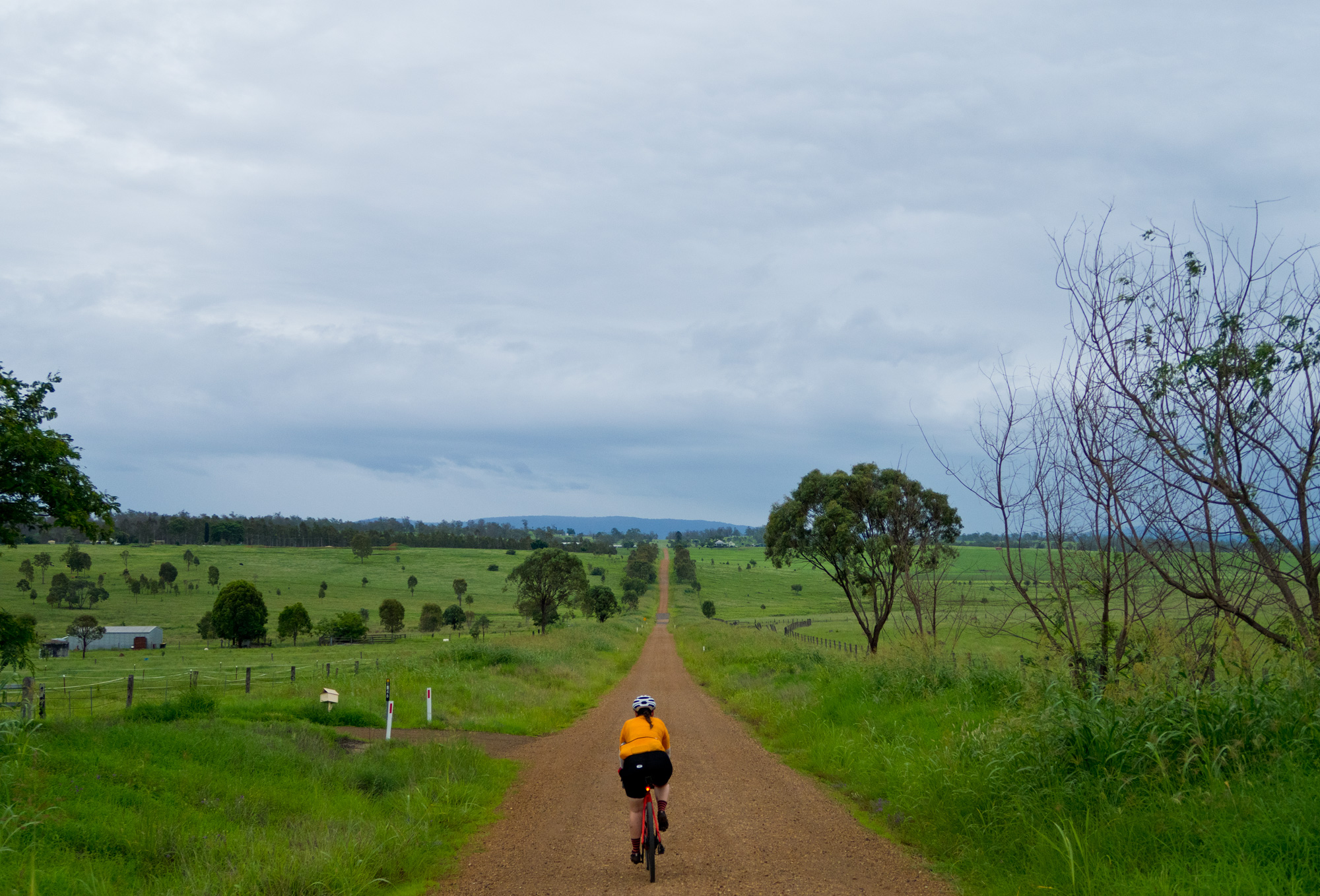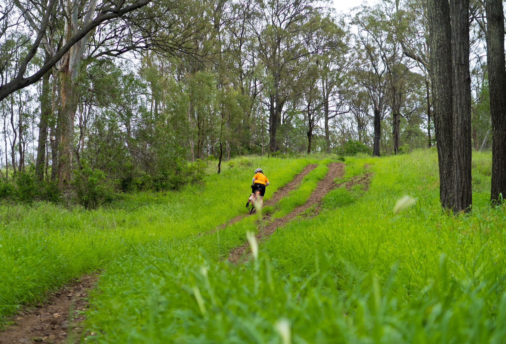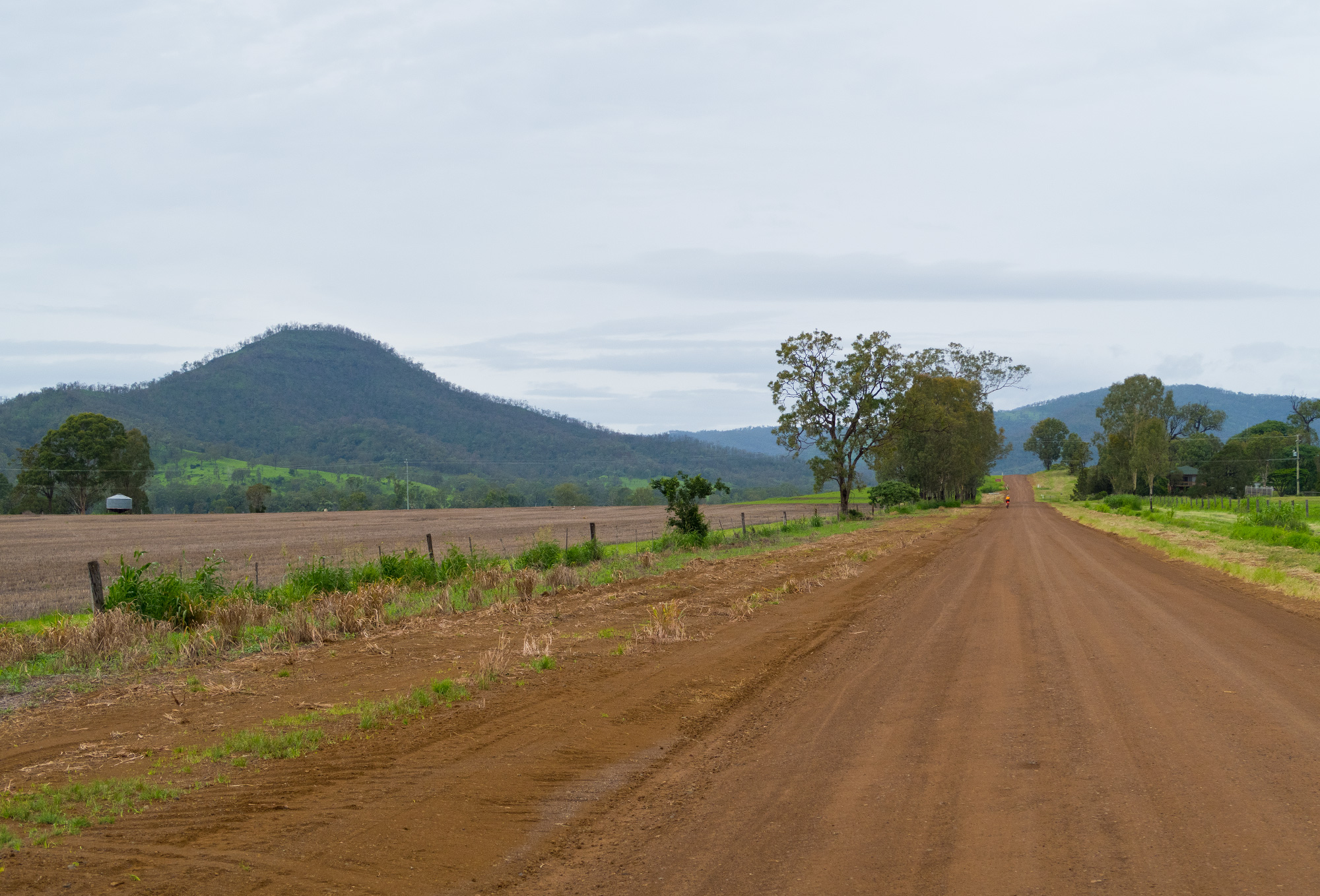 Eventually we made the way to the top of the climb. After removing the built up clay in the pedals, cleats and shoes we started out descent to the bottom of the valley. However it wasn’t to last very long. On the -10% and at times -15% gradients long ruts had formed and combined with the wet thick/tall grass made spotting them difficult which was made even worse with the slippery red clay. It wasn’t long until Bronwyn had her first couple moments shortly followed by a slow speed stack when she lost the front on some slippery clay. Luke quickly followed in a more dramatic fashion as he lost the front on one bit of slippery clay, into a long rut covered in grass, across the track into another rut and eventually losing the rear as it lost traction with the wet clay and spun around. We both decided to attempt the Mulgowie section another day when it wasn’t as wet on the steeper side. As we made our way back to Grandchester Mount Mort Road it still wasn’t stack free. One one -12% section Luke lost the bike on a soft section of clay when the front dug in and the rear slid out at low speed. Once we got back to the dirt road normal riding was resumed. The only problem we now had was avoiding eye level chunks of clay that were now being flicked off our wheels/bikes which was easily solved by grabbing a low hanging stick from a tree and scraping the clay off while riding. Once we got back onto Grandchester Mount Mort Road heading south it was 85% gravel roads over just about every single ridge line all the way back to Rosewood. You couldn’t see them all but when you got to the crest you knew there was another one just on the other side.