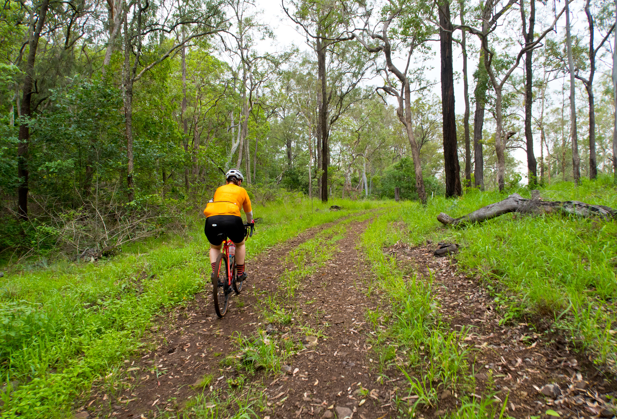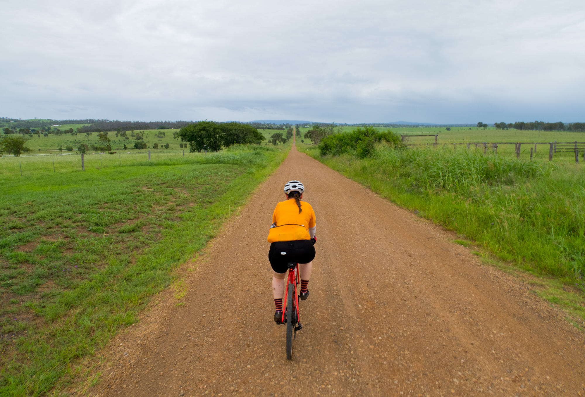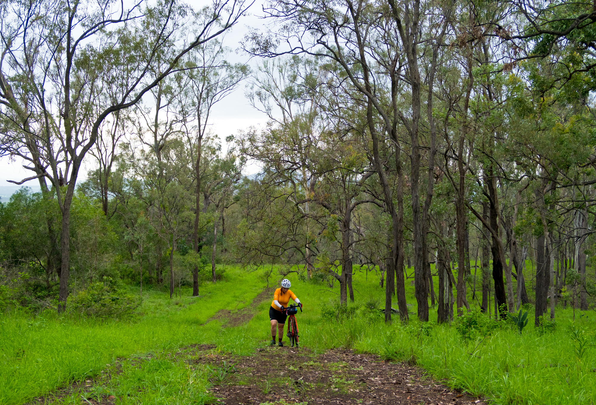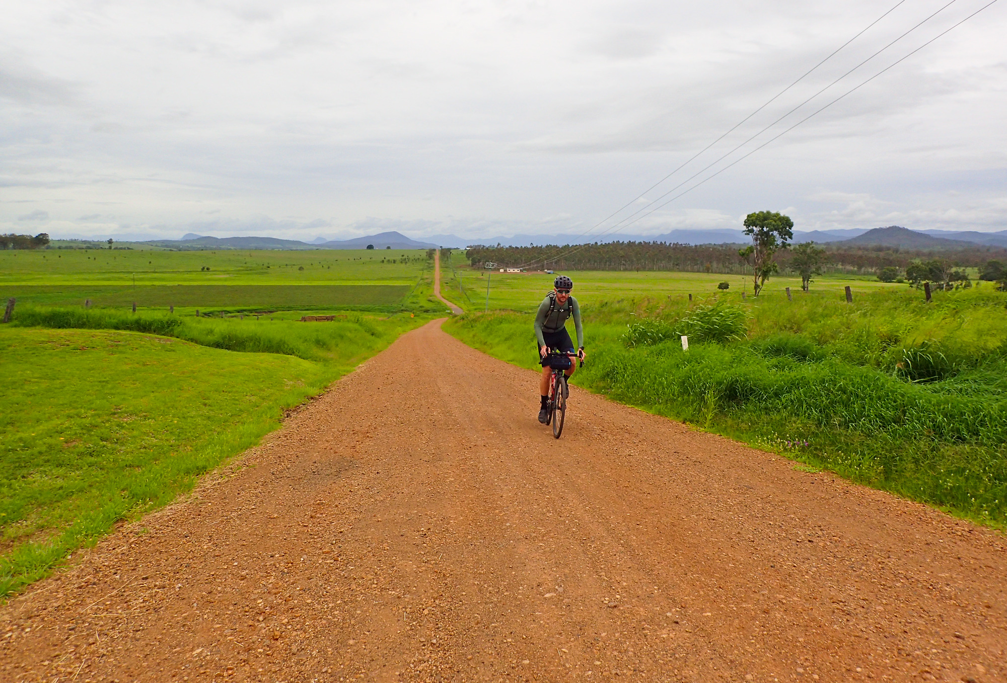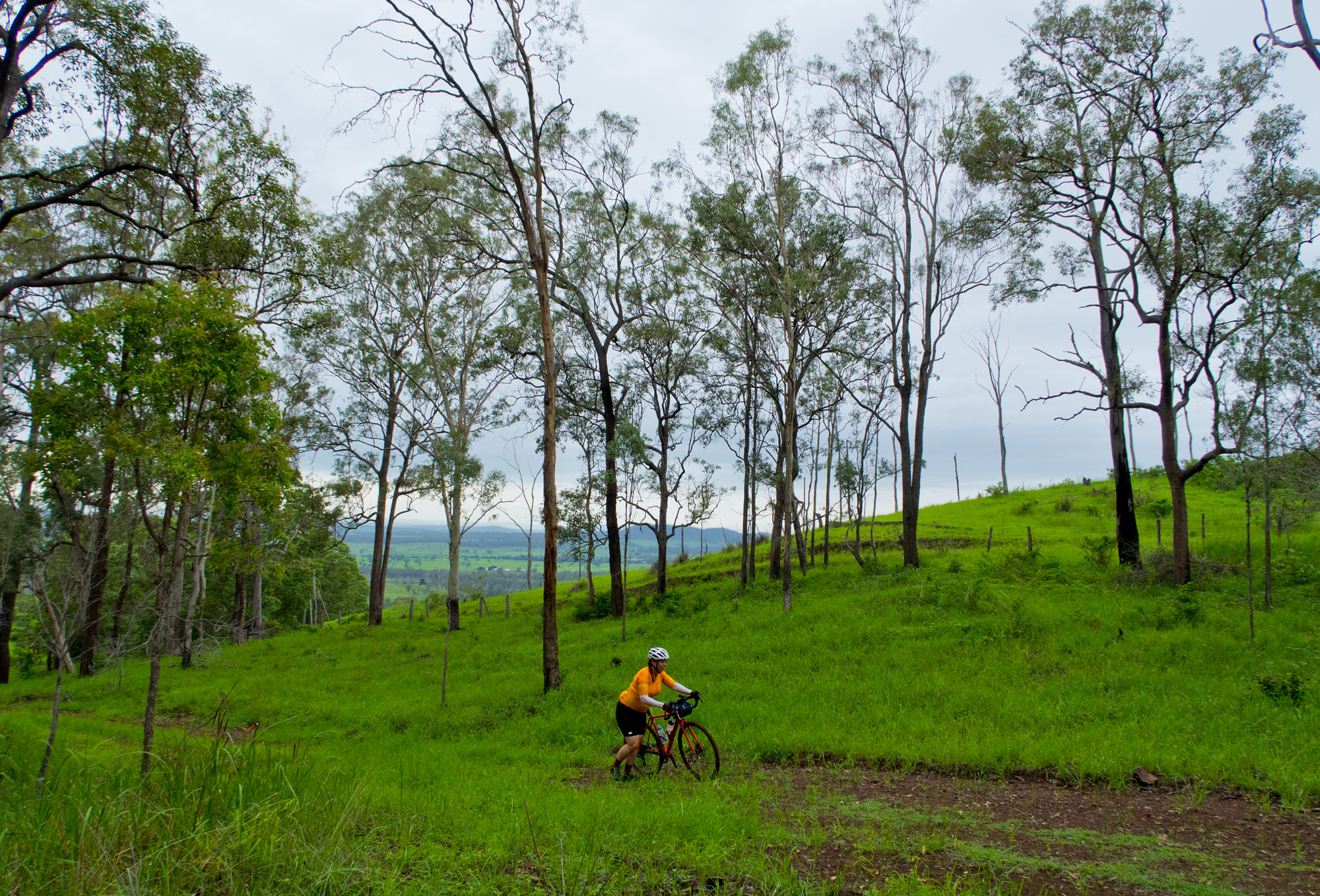 Eventually we made the way to the top of the climb. After removing the built up clay in the pedals, cleats and shoes we started out descent to the bottom of the valley. However it wasn’t to last very long. On the -10% and at times -15% gradients long ruts had formed and combined with the wet thick/tall grass made spotting them difficult which was made even worse with the slippery red clay. It wasn’t long until Bronwyn had her first couple moments shortly followed by a slow speed stack when she lost the front on some slippery clay. Luke quickly followed in a more dramatic fashion as he lost the front on one bit of slippery clay, into a long rut covered in grass, across the track into another rut and eventually losing the rear as it lost traction with the wet clay and spun around. We both decided to attempt the Mulgowie section another day when it wasn’t as wet on the steeper side. As we made our way back to Grandchester Mount Mort Road it still wasn’t stack free. One one -12% section Luke lost the bike on a soft section of clay when the front dug in and the rear slid out at low speed. Once we got back to the dirt road normal riding was resumed. The only problem we now had was avoiding eye level chunks of clay that were now being flicked off our wheels/bikes which was easily solved by grabbing a low hanging stick from a tree and scraping the clay off while riding. Once we got back onto Grandchester Mount Mort Road heading south it was 85% gravel roads over just about every single ridge line all the way back to Rosewood. You couldn’t see them all but when you got to the crest you knew there was another one just on the other side.