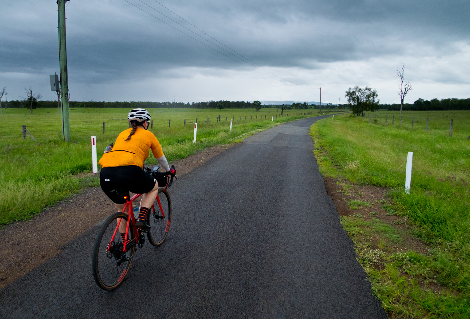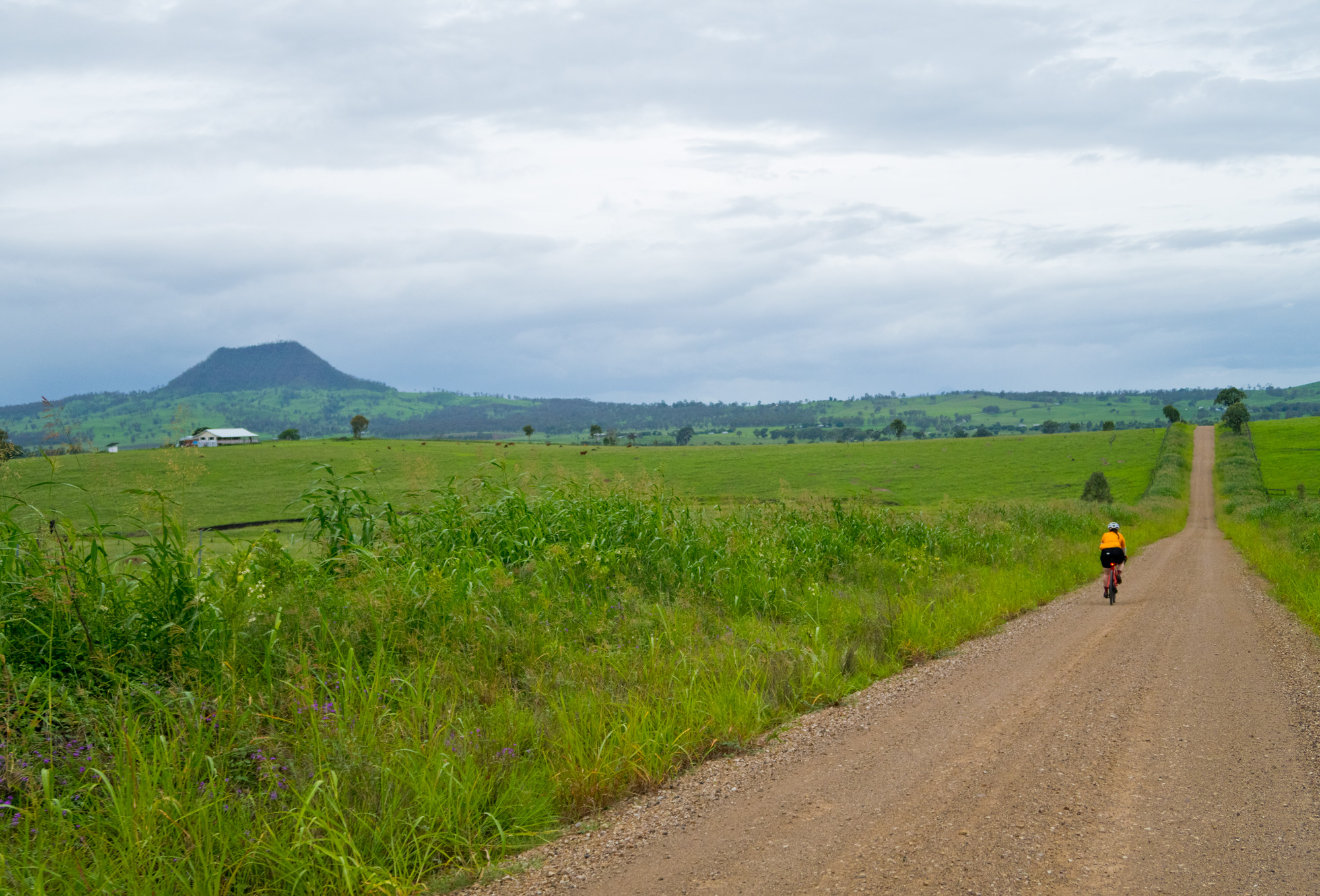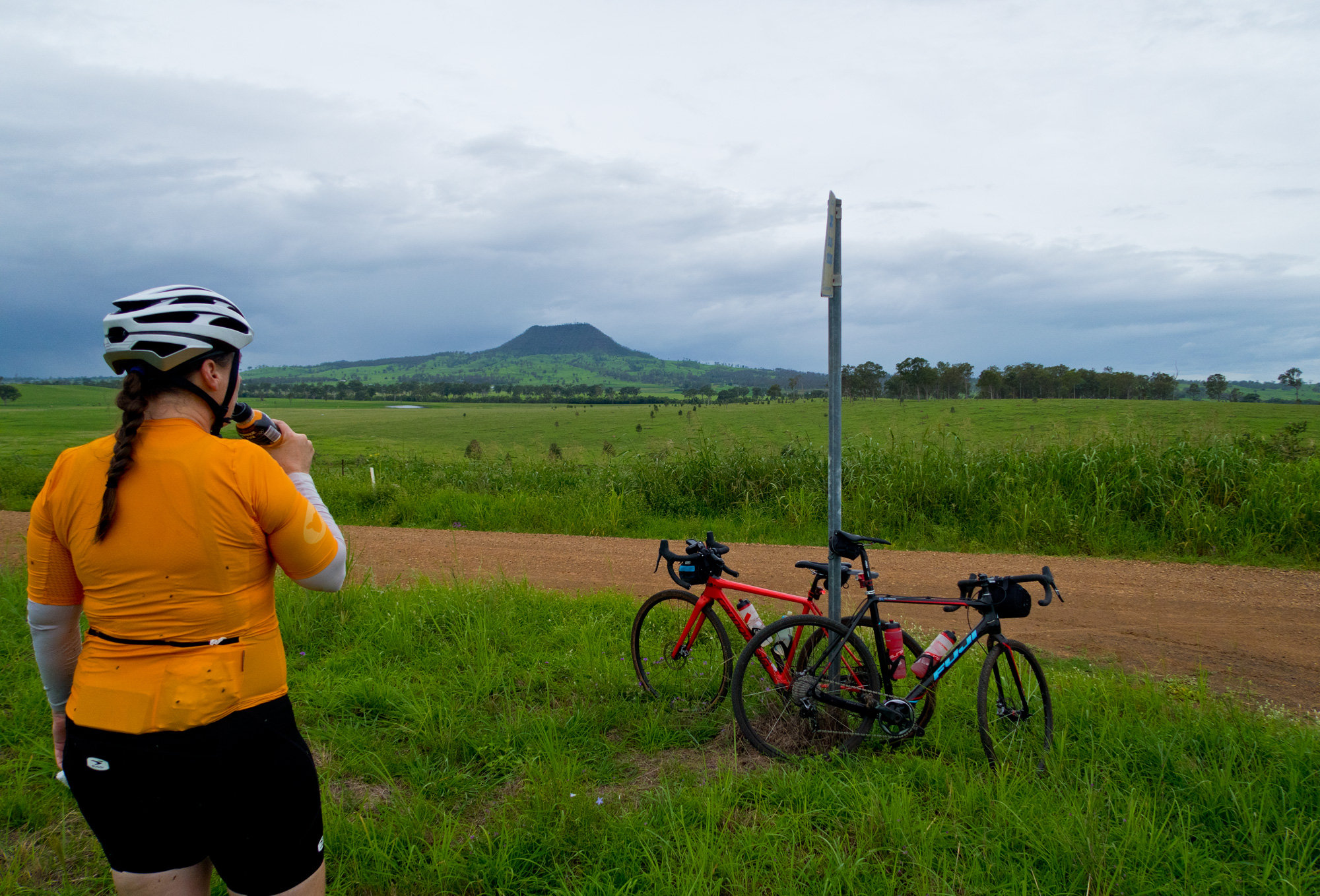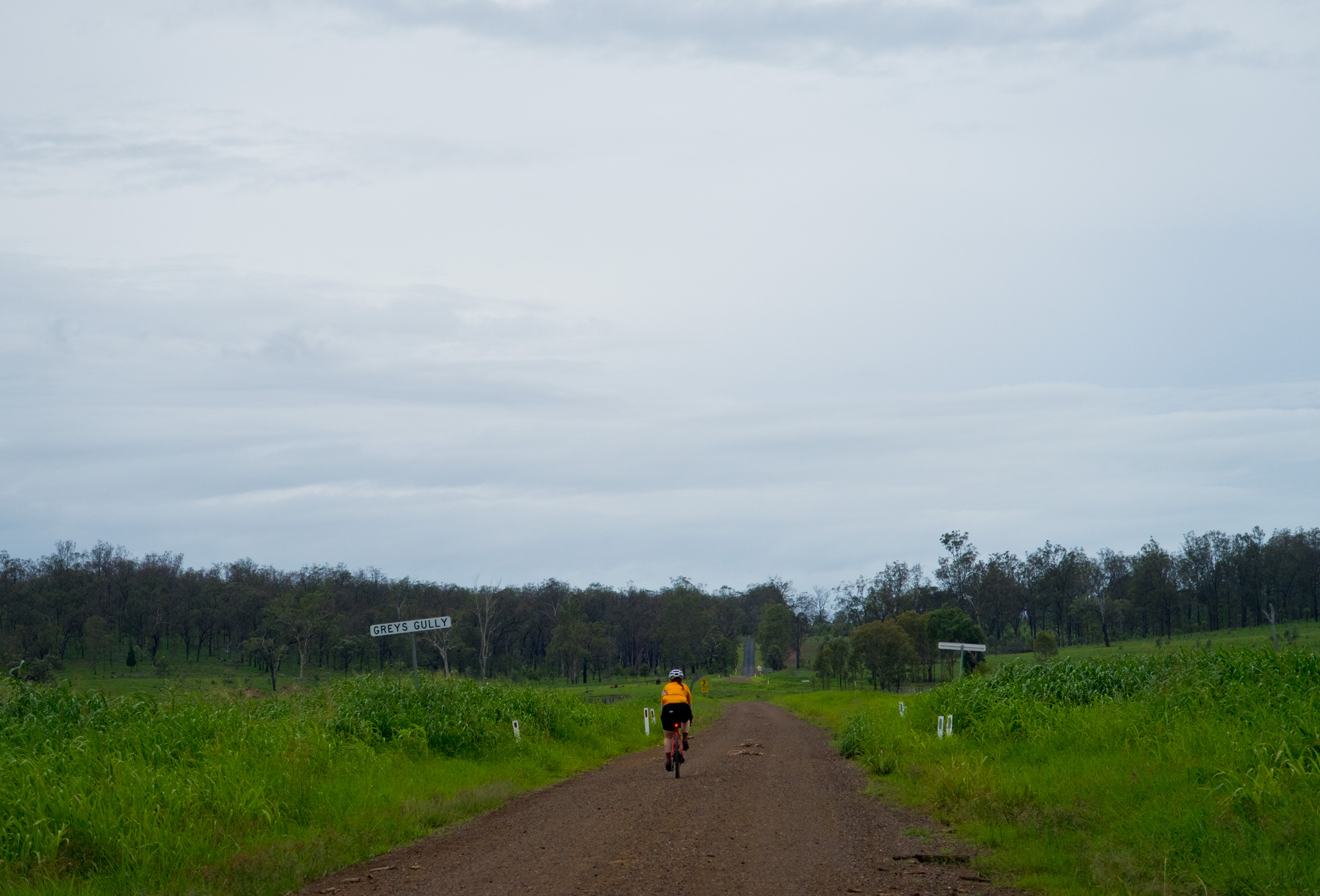 Eventually we made the way to the top of the climb. After removing the built up clay in the pedals, cleats and shoes we started out descent to the bottom of the valley. However it wasn’t to last very long. On the -10% and at times -15% gradients long ruts had formed and combined with the wet thick/tall grass made spotting them difficult which was made even worse with the slippery red clay. It wasn’t long until Bronwyn had her first couple moments shortly followed by a slow speed stack when she lost the front on some slippery clay. Luke quickly followed in a more dramatic fashion as he lost the front on one bit of slippery clay, into a long rut covered in grass, across the track into another rut and eventually losing the rear as it lost traction with the wet clay and spun around. We both decided to attempt the Mulgowie section another day when it wasn’t as wet on the steeper side. As we made our way back to Grandchester Mount Mort Road it still wasn’t stack free. One one -12% section Luke lost the bike on a soft section of clay when the front dug in and the rear slid out at low speed. Once we got back to the dirt road normal riding was resumed. The only problem we now had was avoiding eye level chunks of clay that were now being flicked off our wheels/bikes which was easily solved by grabbing a low hanging stick from a tree and scraping the clay off while riding. Once we got back onto Grandchester Mount Mort Road heading south it was 85% gravel roads over just about every single ridge line all the way back to Rosewood. You couldn’t see them all but when you got to the crest you knew there was another one just on the other side.
