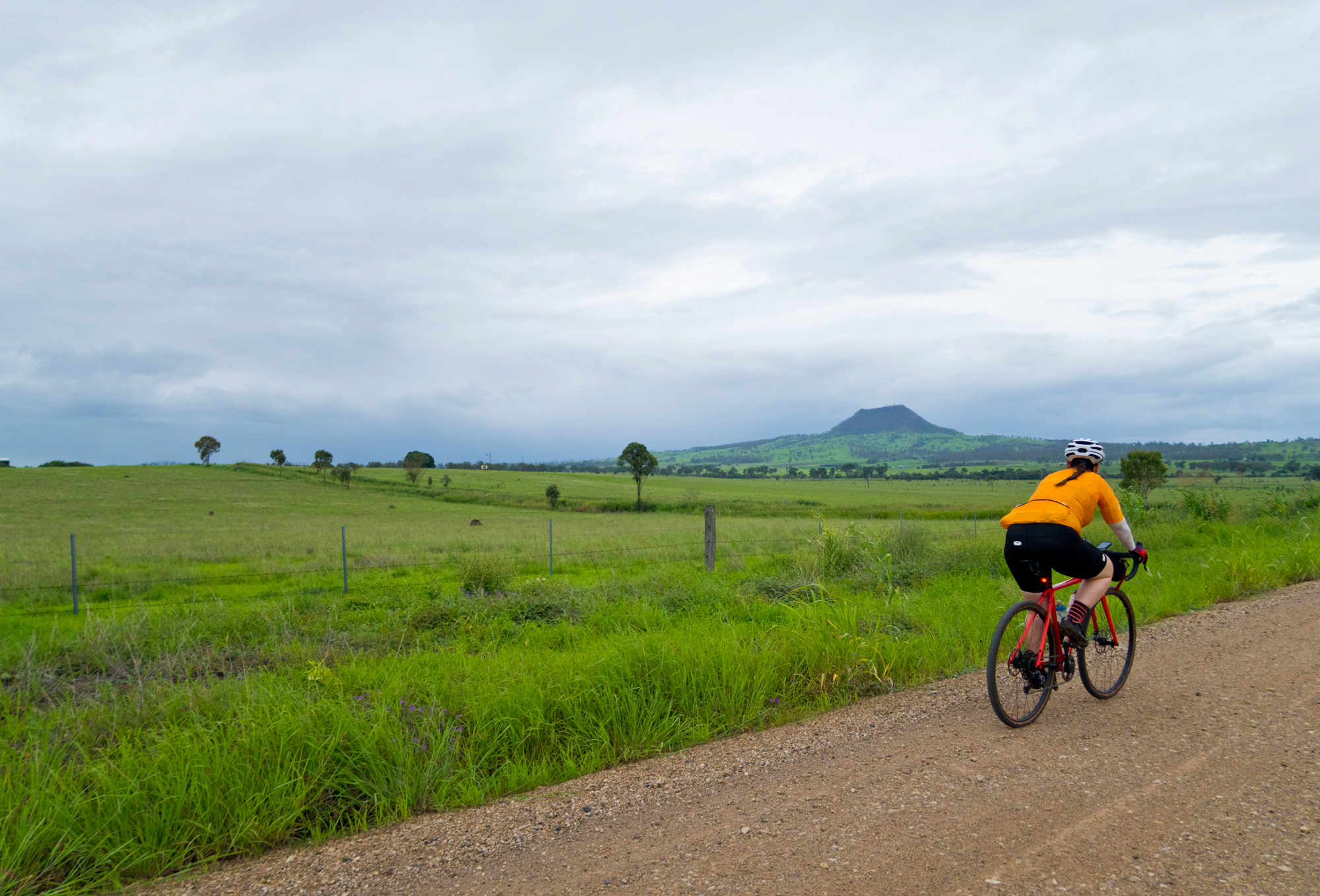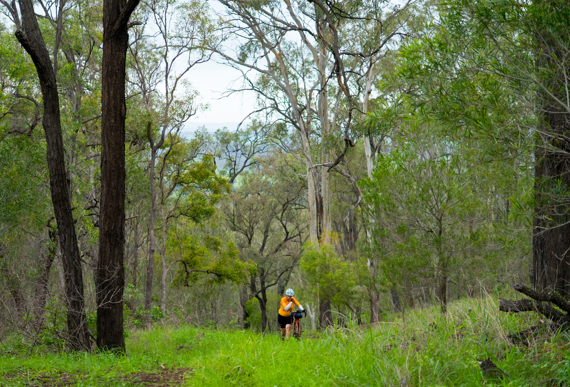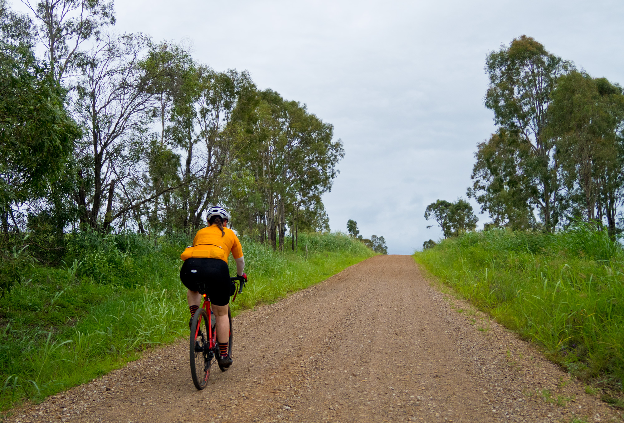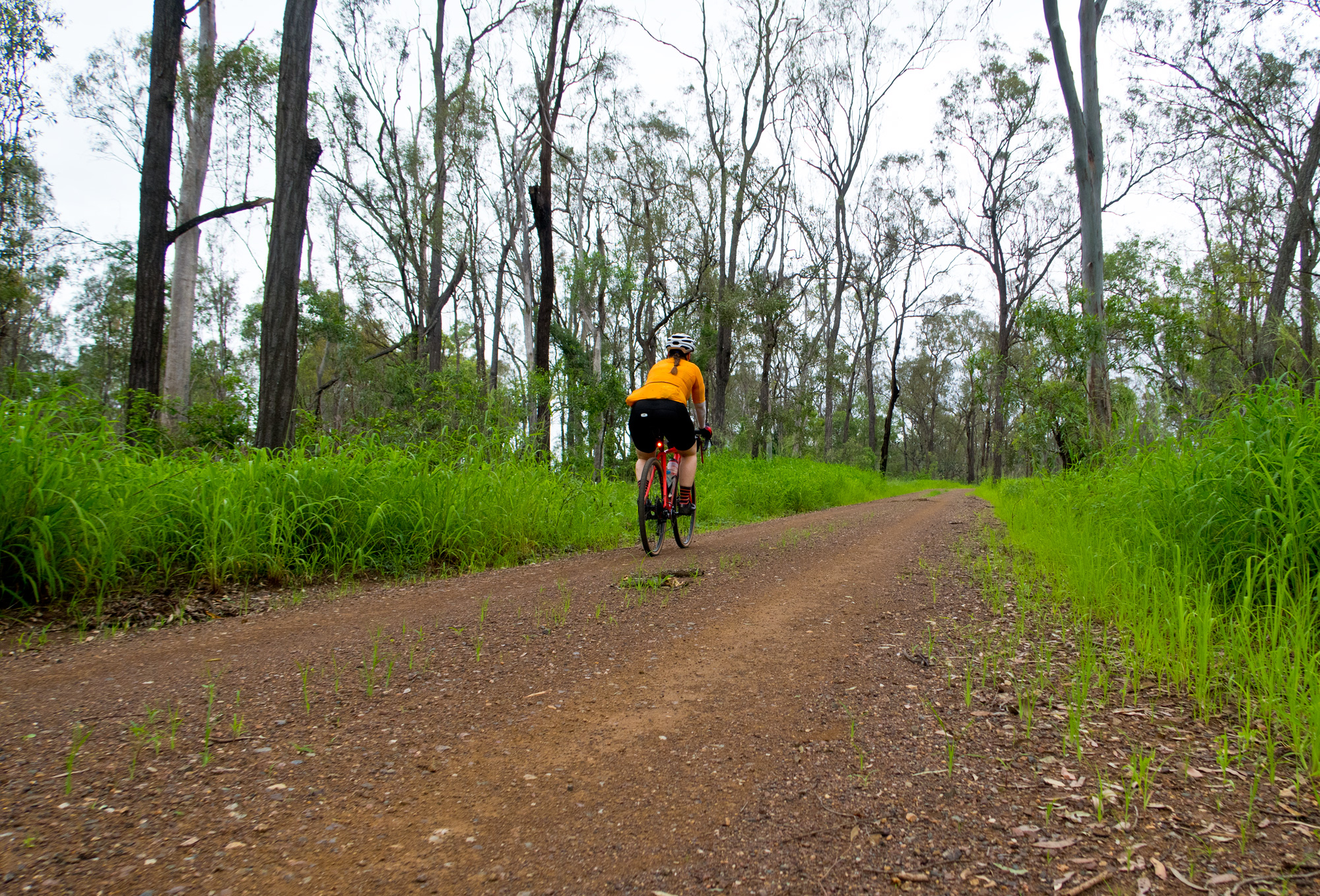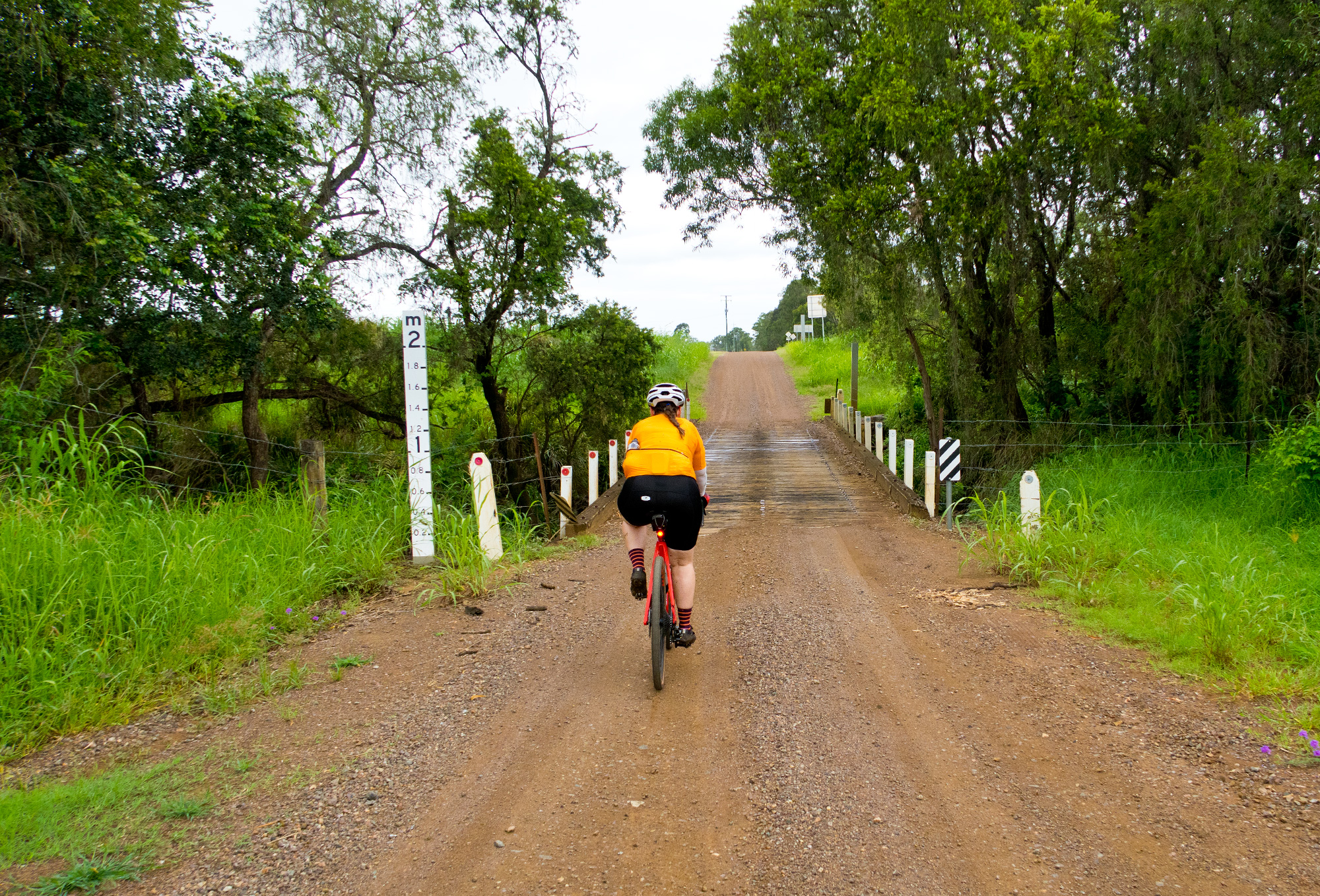 Eventually we made the way to the top of the climb. After removing the built up clay in the pedals, cleats and shoes we started out descent to the bottom of the valley. However it wasn’t to last very long. On the -10% and at times -15% gradients long ruts had formed and combined with the wet thick/tall grass made spotting them difficult which was made even worse with the slippery red clay. It wasn’t long until Bronwyn had her first couple moments shortly followed by a slow speed stack when she lost the front on some slippery clay. Luke quickly followed in a more dramatic fashion as he lost the front on one bit of slippery clay, into a long rut covered in grass, across the track into another rut and eventually losing the rear as it lost traction with the wet clay and spun around. We both decided to attempt the Mulgowie section another day when it wasn’t as wet on the steeper side. As we made our way back to Grandchester Mount Mort Road it still wasn’t stack free. One one -12% section Luke lost the bike on a soft section of clay when the front dug in and the rear slid out at low speed. Once we got back to the dirt road normal riding was resumed. The only problem we now had was avoiding eye level chunks of clay that were now being flicked off our wheels/bikes which was easily solved by grabbing a low hanging stick from a tree and scraping the clay off while riding. Once we got back onto Grandchester Mount Mort Road heading south it was 85% gravel roads over just about every single ridge line all the way back to Rosewood. You couldn’t see them all but when you got to the crest you knew there was another one just on the other side.