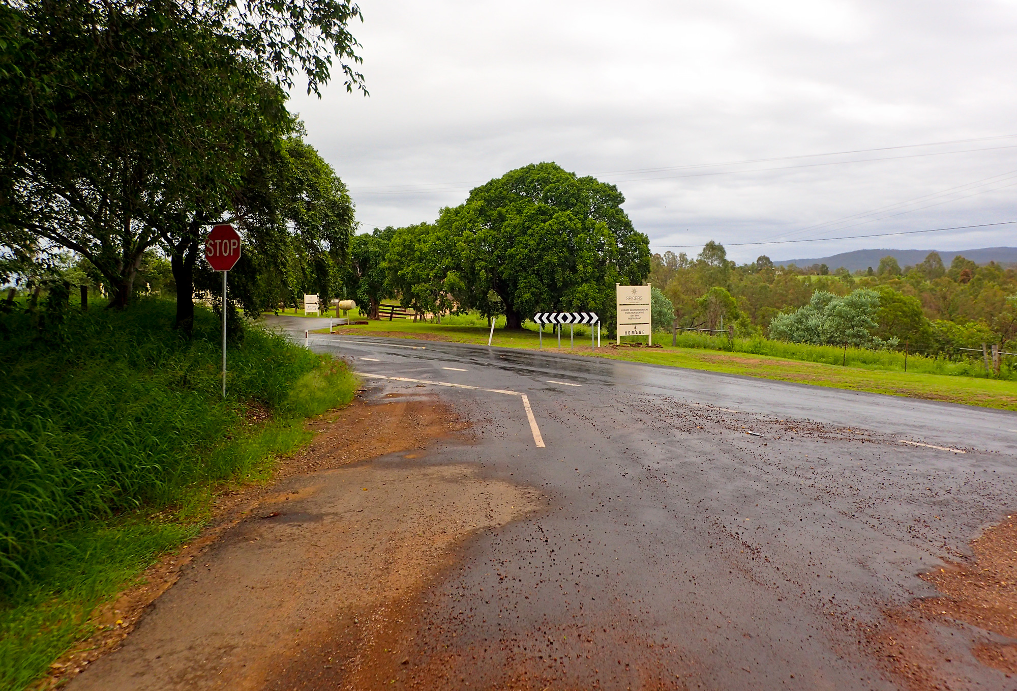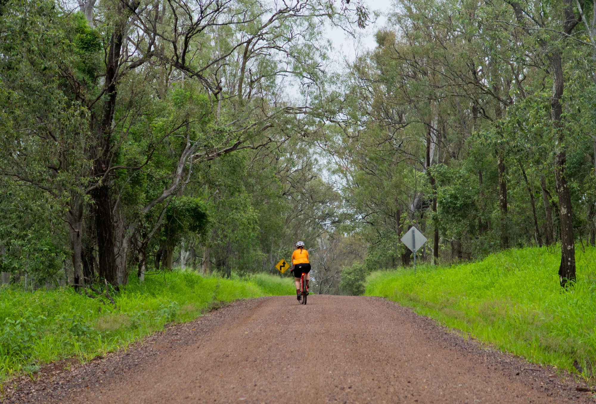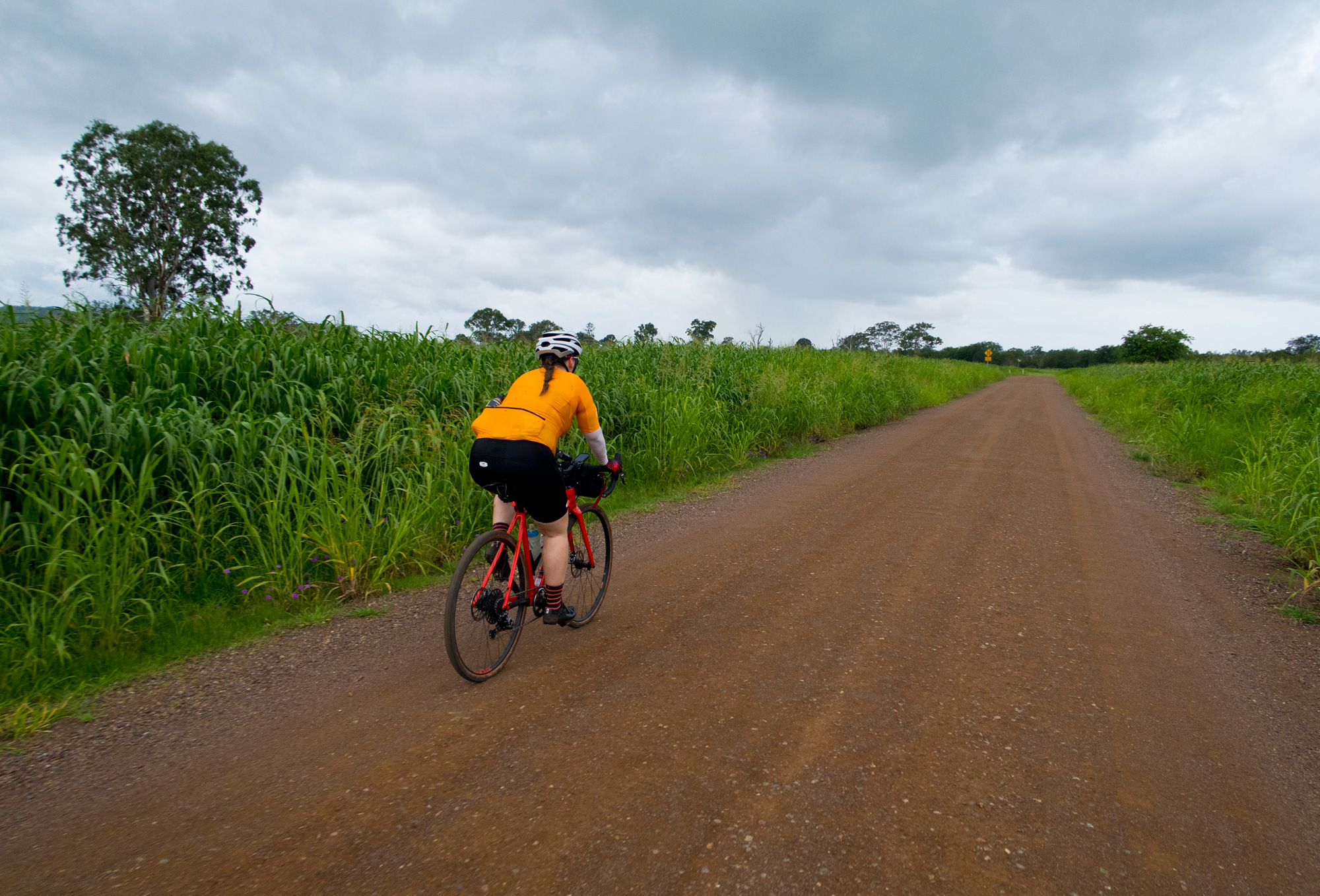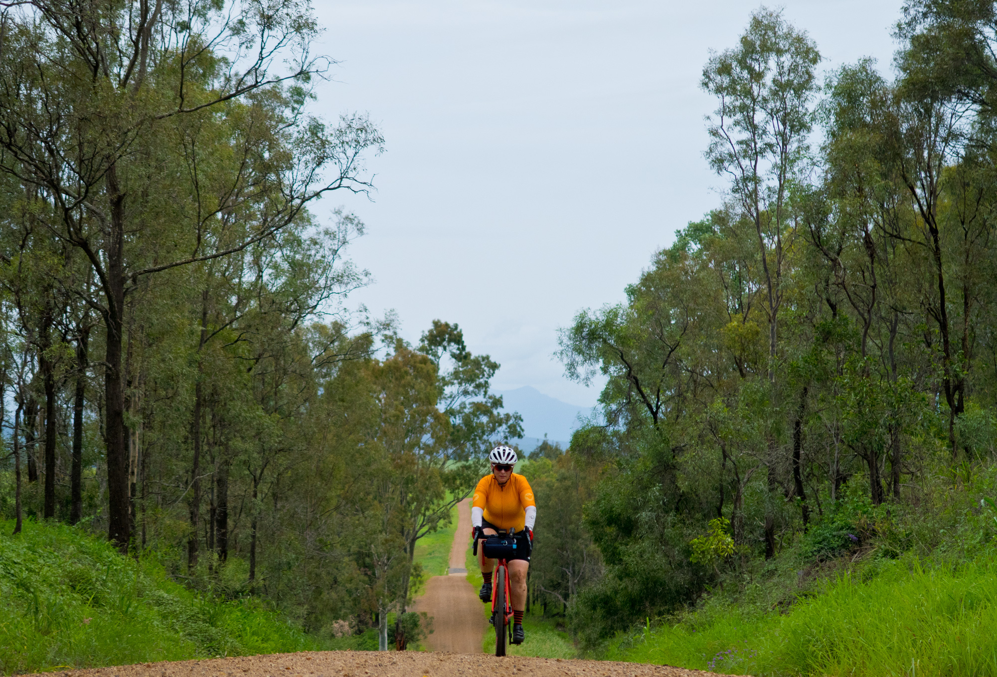 Eventually we made the way to the top of the climb. After removing the built up clay in the pedals, cleats and shoes we started out descent to the bottom of the valley. However it wasn’t to last very long. On the -10% and at times -15% gradients long ruts had formed and combined with the wet thick/tall grass made spotting them difficult which was made even worse with the slippery red clay. It wasn’t long until Bronwyn had her first couple moments shortly followed by a slow speed stack when she lost the front on some slippery clay. Luke quickly followed in a more dramatic fashion as he lost the front on one bit of slippery clay, into a long rut covered in grass, across the track into another rut and eventually losing the rear as it lost traction with the wet clay and spun around. We both decided to attempt the Mulgowie section another day when it wasn’t as wet on the steeper side. As we made our way back to Grandchester Mount Mort Road it still wasn’t stack free. One one -12% section Luke lost the bike on a soft section of clay when the front dug in and the rear slid out at low speed. Once we got back to the dirt road normal riding was resumed. The only problem we now had was avoiding eye level chunks of clay that were now being flicked off our wheels/bikes which was easily solved by grabbing a low hanging stick from a tree and scraping the clay off while riding. Once we got back onto Grandchester Mount Mort Road heading south it was 85% gravel roads over just about every single ridge line all the way back to Rosewood. You couldn’t see them all but when you got to the crest you knew there was another one just on the other side.