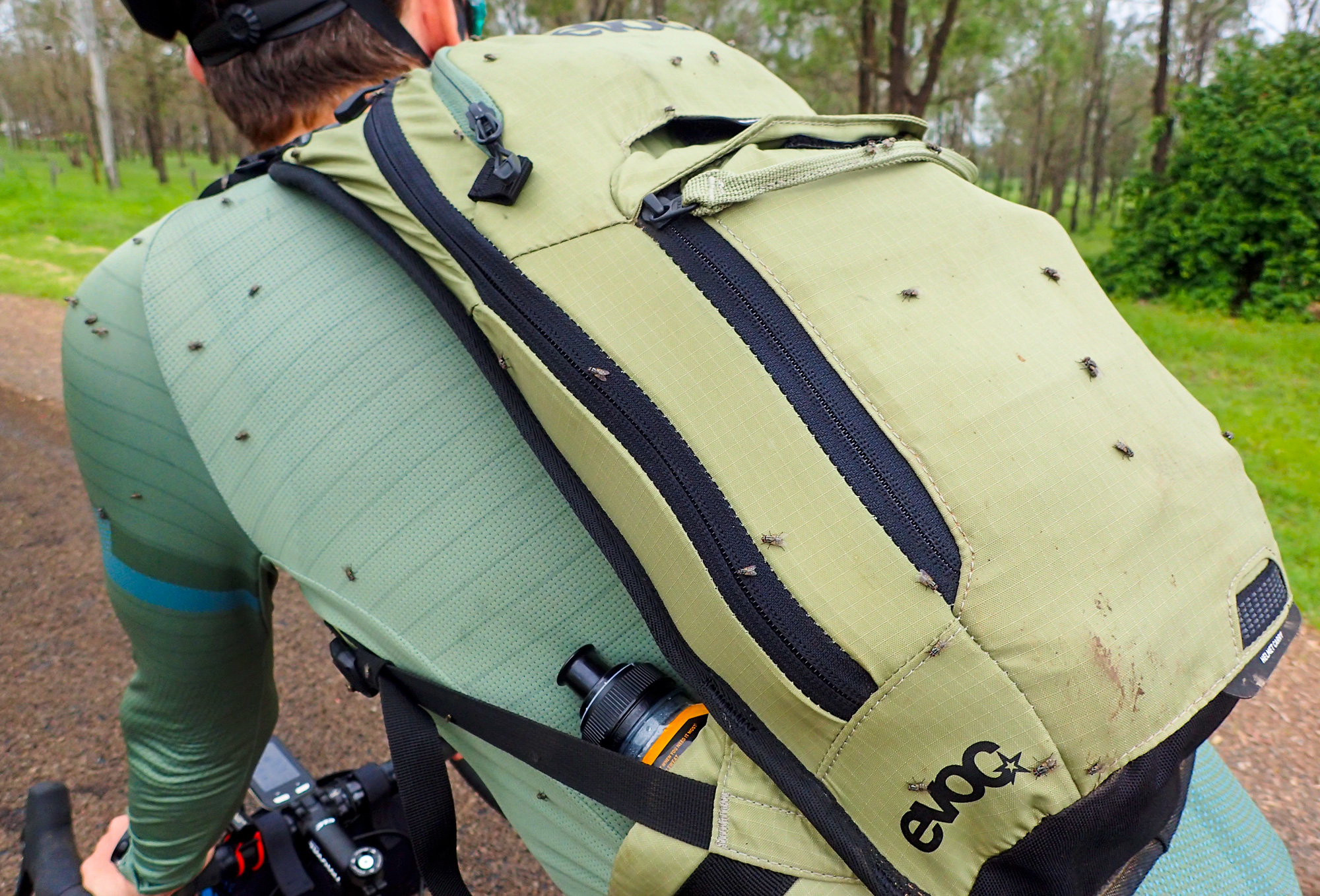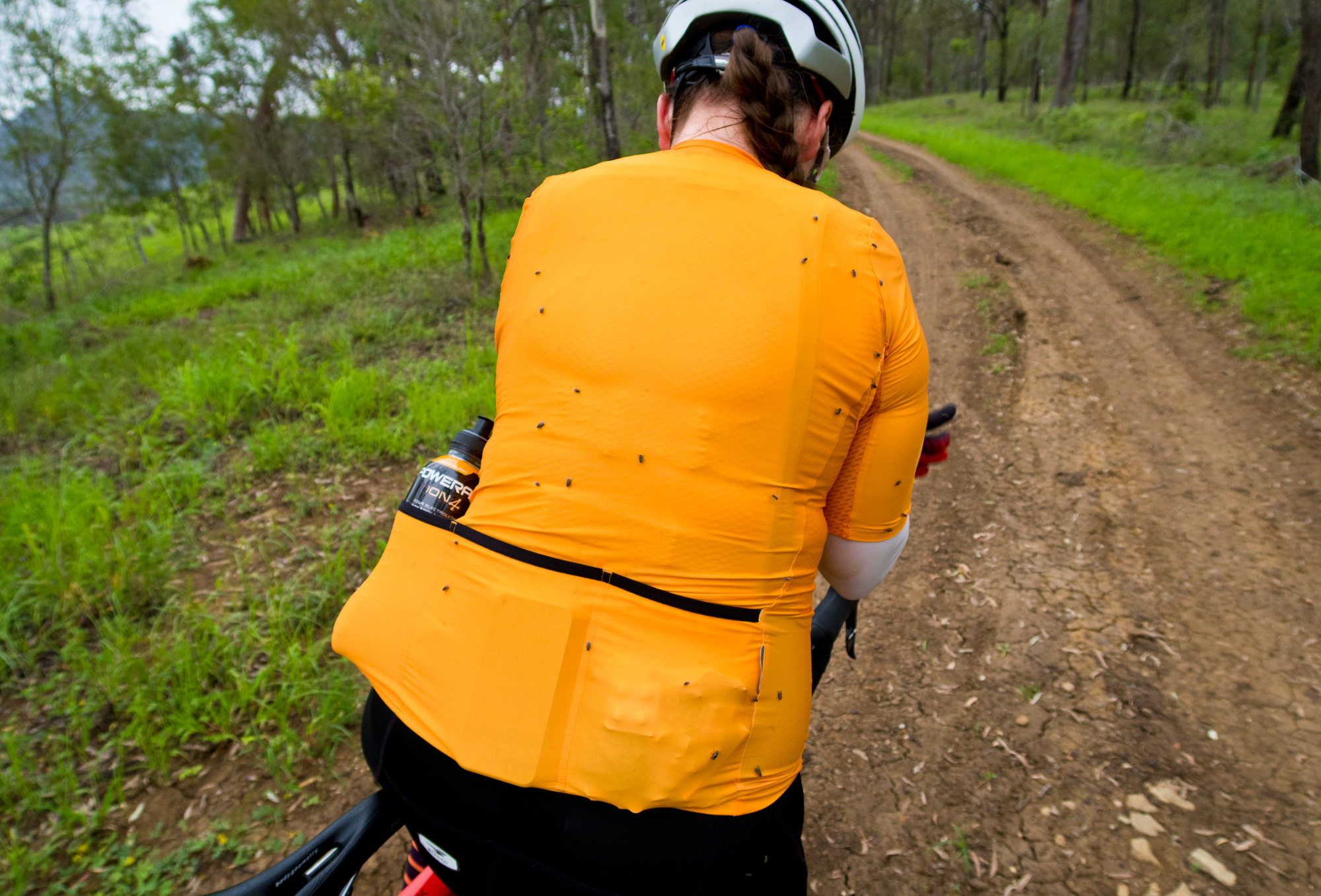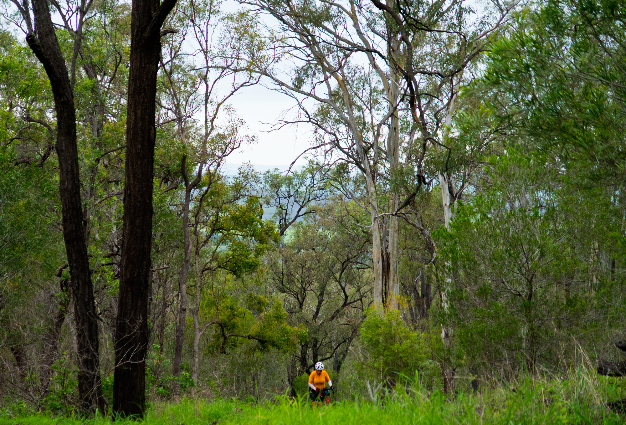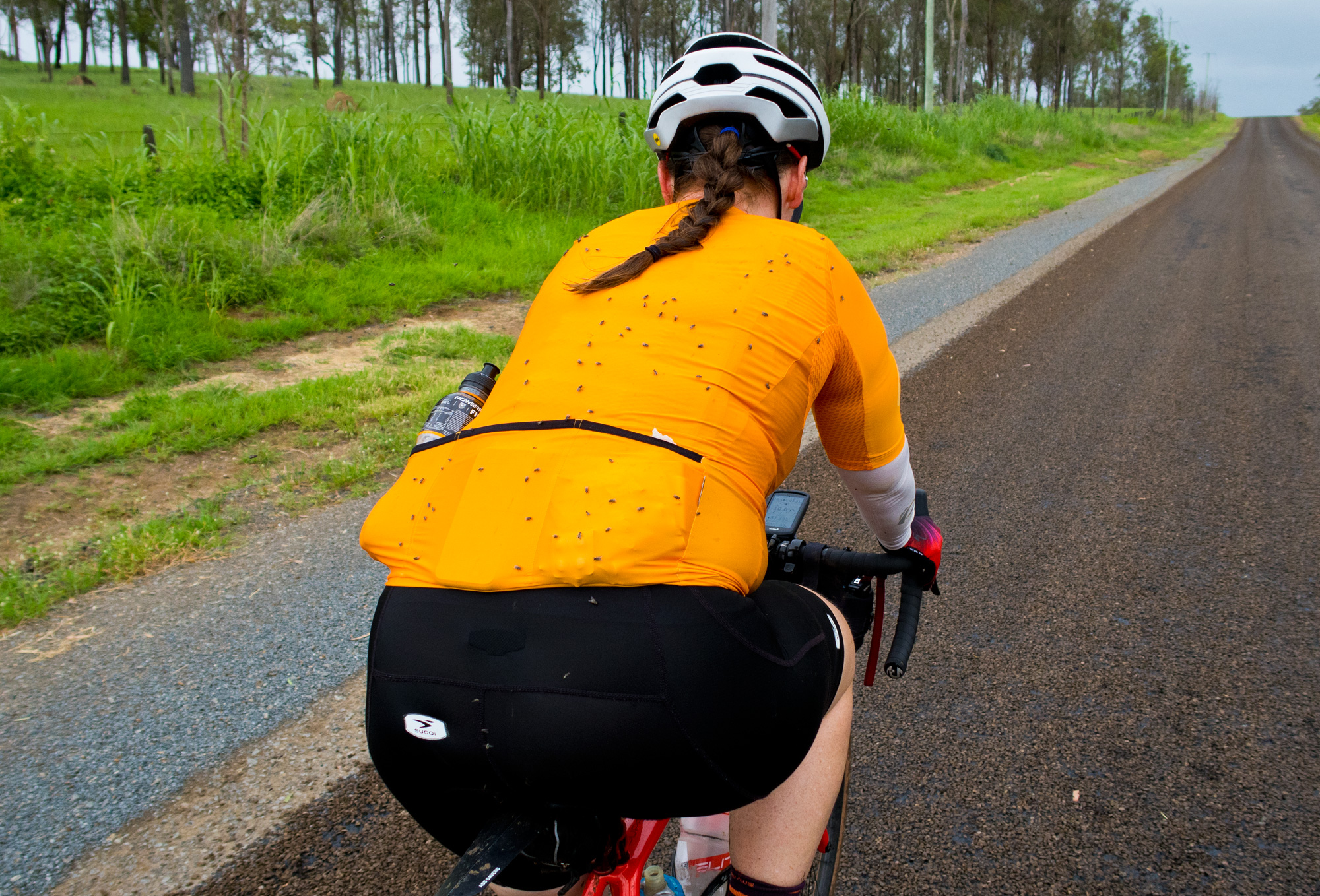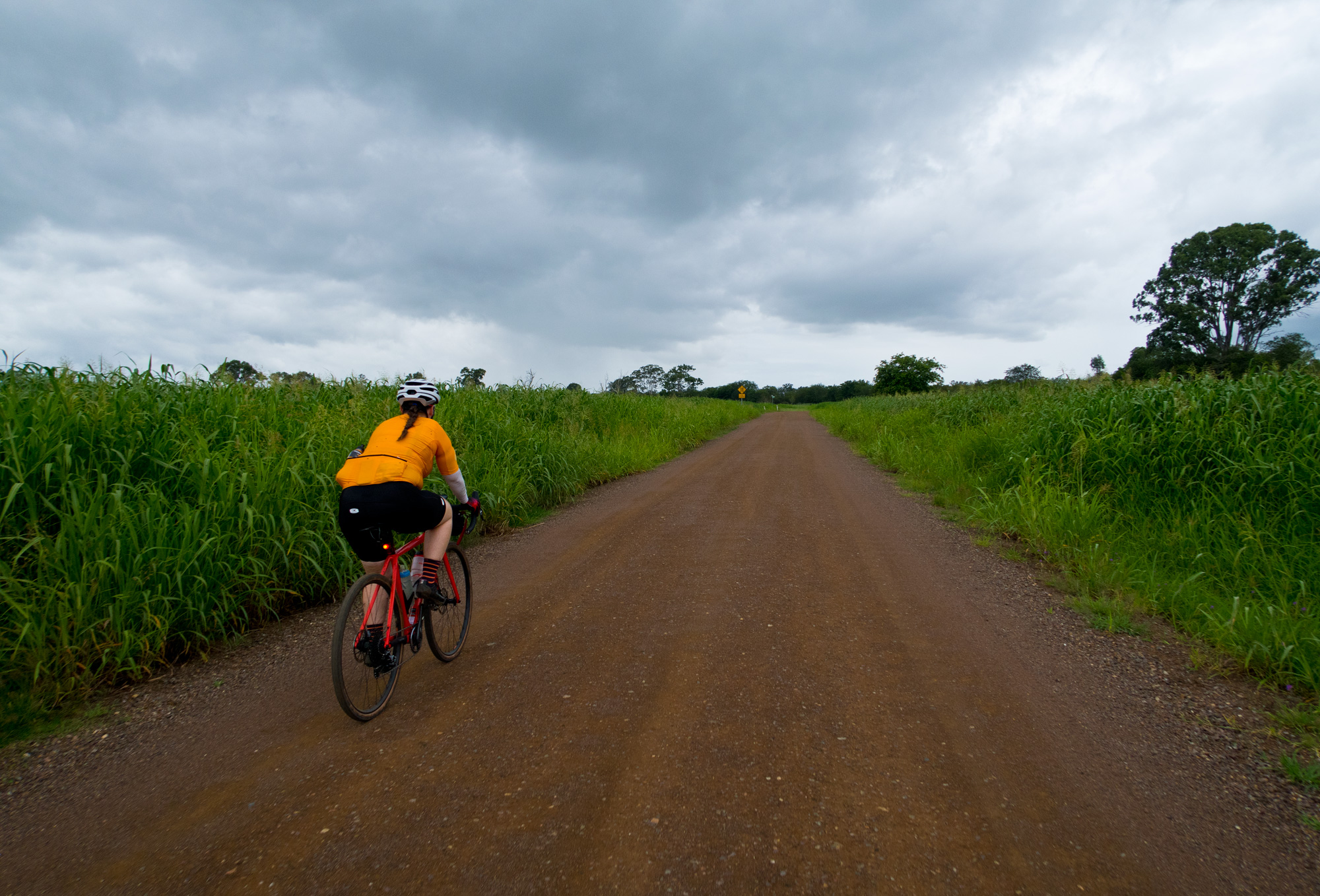 Eventually we made the way to the top of the climb. After removing the built up clay in the pedals, cleats and shoes we started out descent to the bottom of the valley. However it wasn’t to last very long. On the -10% and at times -15% gradients long ruts had formed and combined with the wet thick/tall grass made spotting them difficult which was made even worse with the slippery red clay. It wasn’t long until Bronwyn had her first couple moments shortly followed by a slow speed stack when she lost the front on some slippery clay. Luke quickly followed in a more dramatic fashion as he lost the front on one bit of slippery clay, into a long rut covered in grass, across the track into another rut and eventually losing the rear as it lost traction with the wet clay and spun around. We both decided to attempt the Mulgowie section another day when it wasn’t as wet on the steeper side. As we made our way back to Grandchester Mount Mort Road it still wasn’t stack free. One one -12% section Luke lost the bike on a soft section of clay when the front dug in and the rear slid out at low speed. Once we got back to the dirt road normal riding was resumed. The only problem we now had was avoiding eye level chunks of clay that were now being flicked off our wheels/bikes which was easily solved by grabbing a low hanging stick from a tree and scraping the clay off while riding. Once we got back onto Grandchester Mount Mort Road heading south it was 85% gravel roads over just about every single ridge line all the way back to Rosewood. You couldn’t see them all but when you got to the crest you knew there was another one just on the other side.