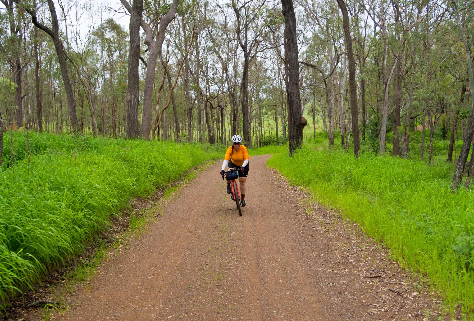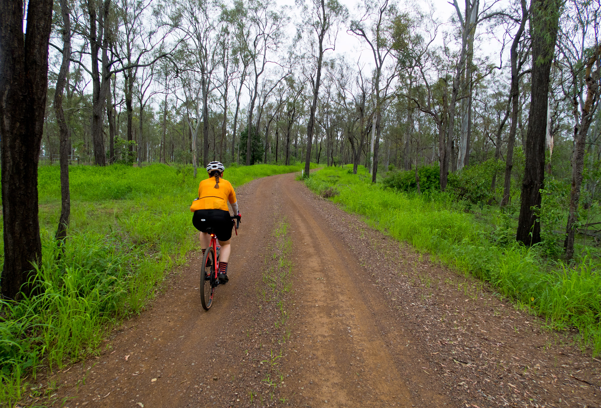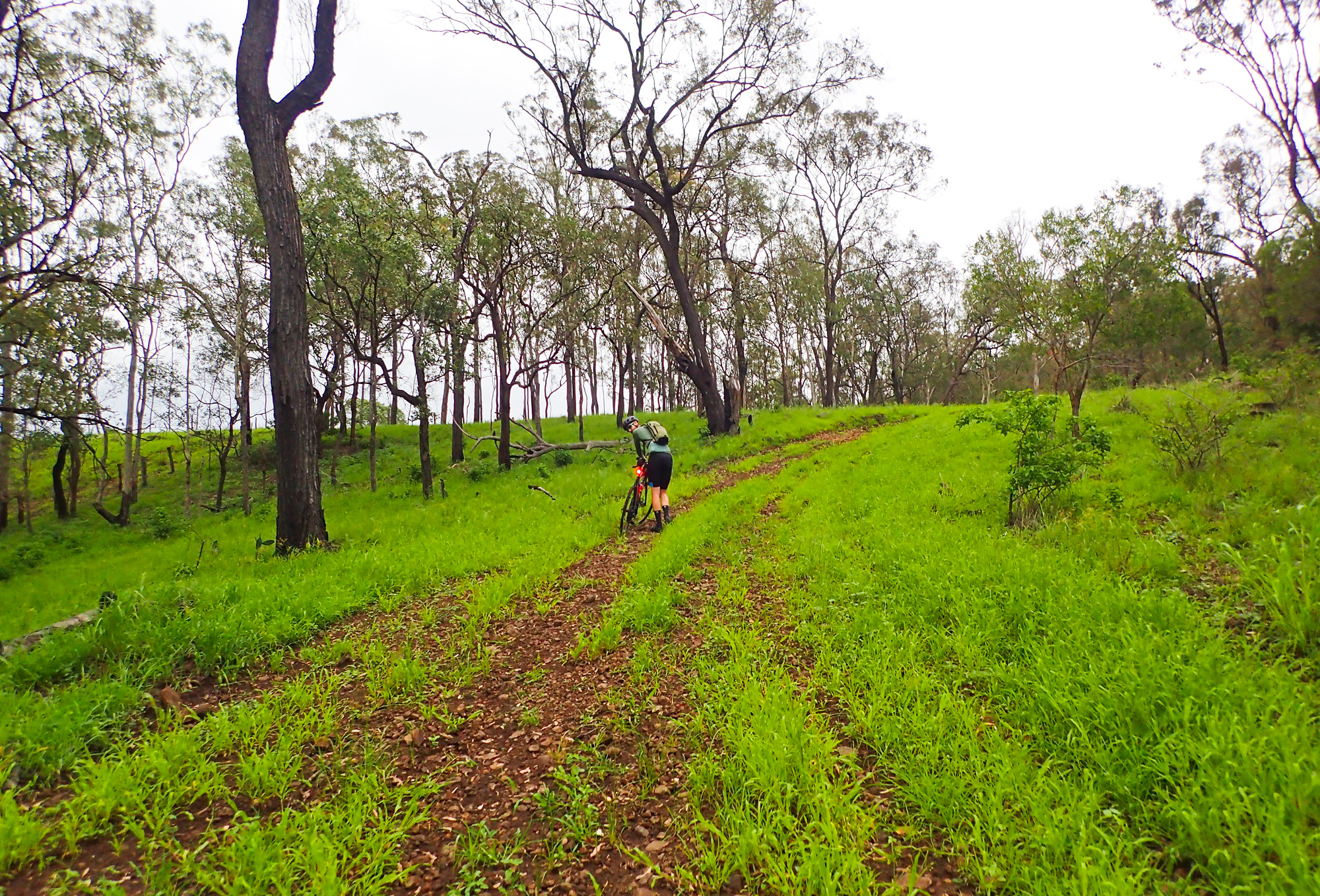 From Calvert to the start of the climb up up and over Mount Beau it was wet roads and scattered showers but the dirt roads seemed to have avoided most of the heavy rain from the morning storms. But as we got further and further along the dirt road it became obvious that it wasn’t going to be an easy ride as we transitioned from a used dirt road to unused dirt roads. The red clay road had dried out from the drought but the recent rains had allowed for the grass to grow through quite thick along with the clay being dried out on top but very loose/muddy underneath which didn’t allow for a lot of traction as it built up on the tread allowing for wheelspin and a quick dismount on 8-15% gradients.