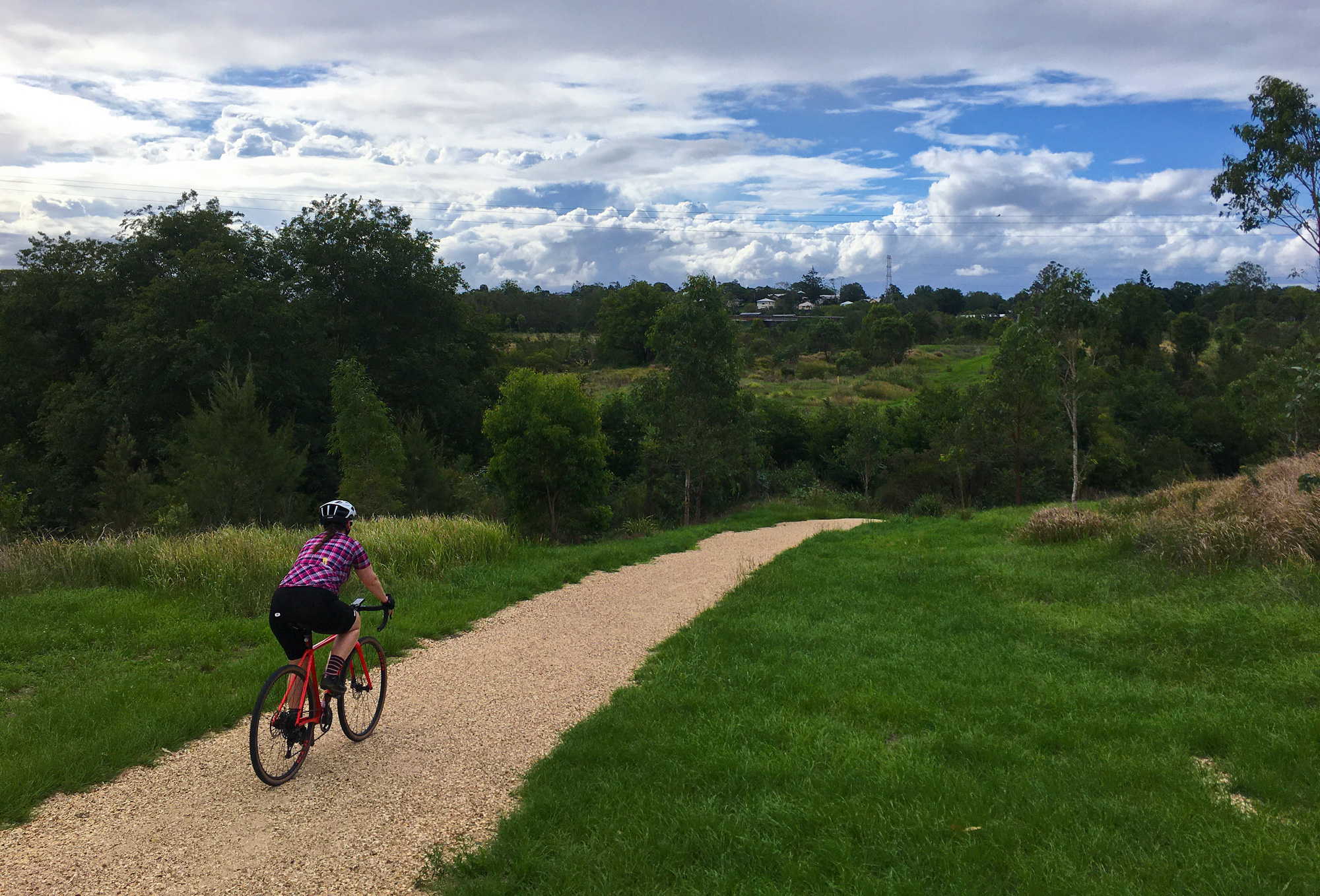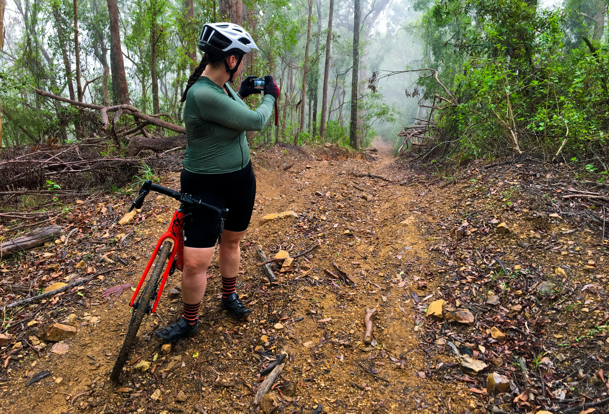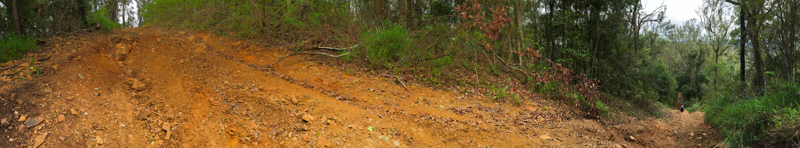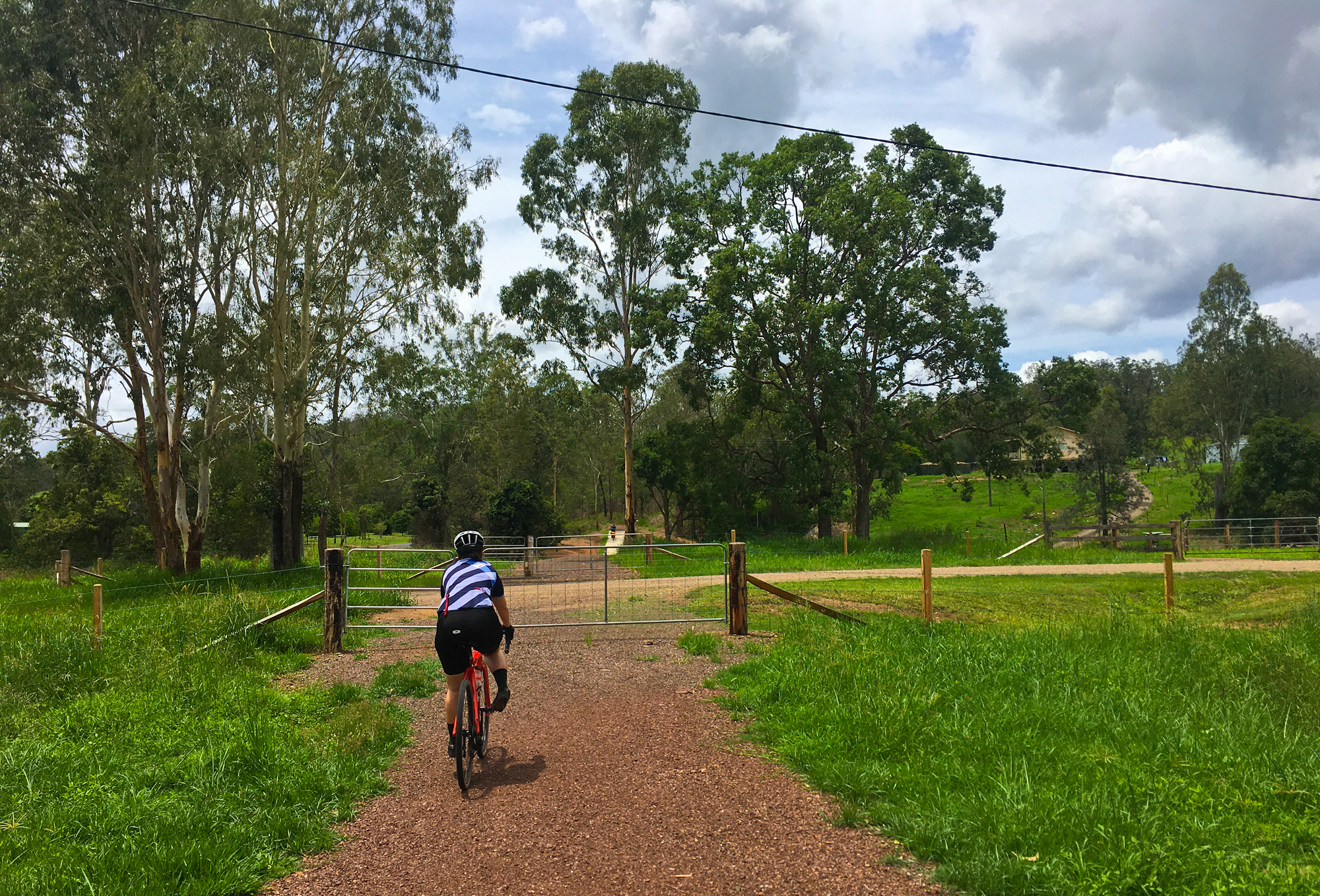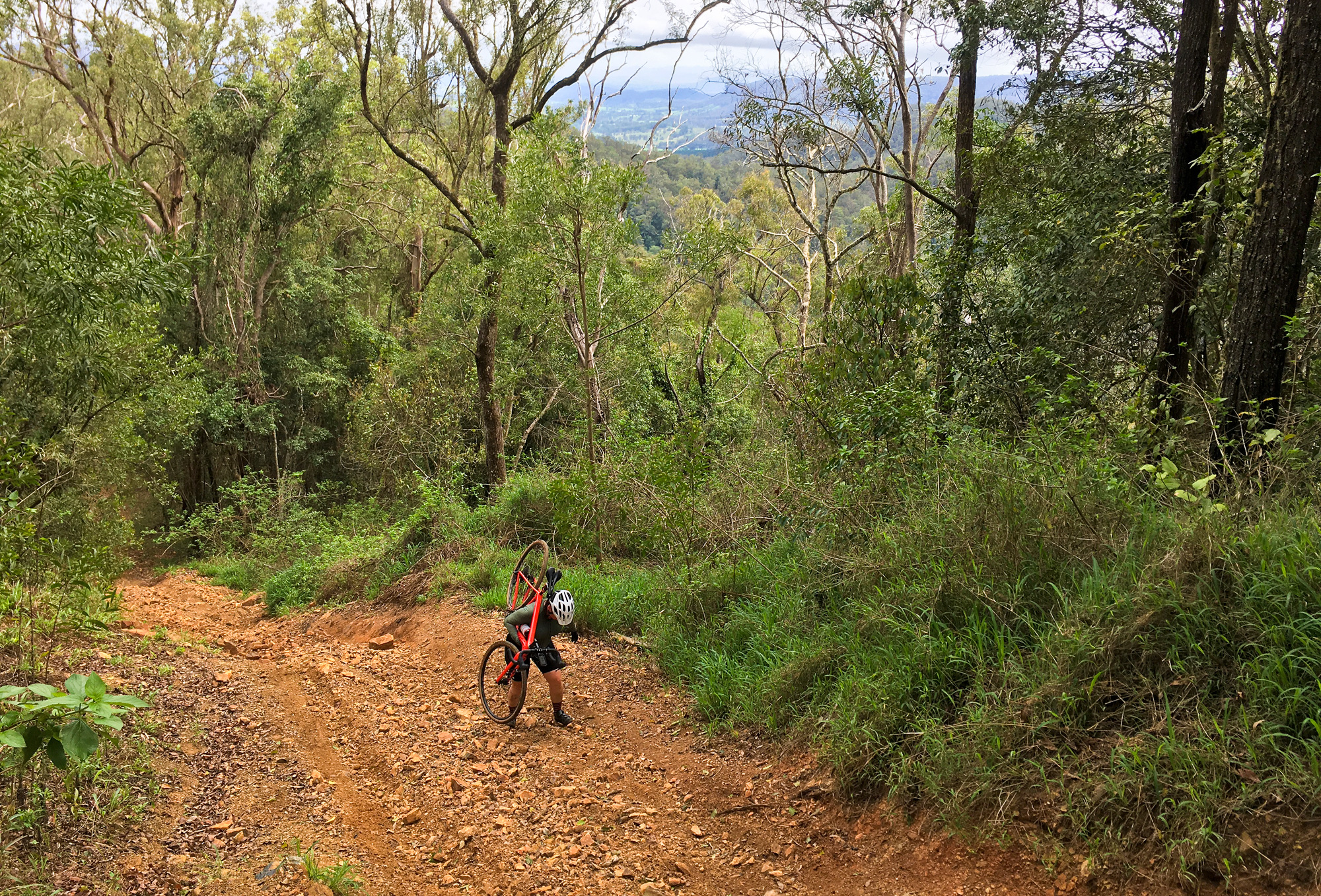 Eventually we made the way to the top of the climb. After removing the built up clay in the pedals, cleats and shoes we started out descent to the bottom of the valley. However it wasn’t to last very long. On the -10% and at times -15% gradients long ruts had formed and combined with the wet thick/tall grass made spotting them difficult which was made even worse with the slippery red clay. It wasn’t long until Bronwyn had her first couple moments shortly followed by a slow speed stack when she lost the front on some slippery clay. Luke quickly followed in a more dramatic fashion as he lost the front on one bit of slippery clay, into a long rut covered in grass, across the track into another rut and eventually losing the rear as it lost traction with the wet clay and spun around. We both decided to attempt the Mulgowie section another day when it wasn’t as wet on the steeper side. As we made our way back to Grandchester Mount Mort Road it still wasn’t stack free. One one -12% section Luke lost the bike on a soft section of clay when the front dug in and the rear slid out at low speed. Once we got back to the dirt road normal riding was resumed. The only problem we now had was avoiding eye level chunks of clay that were now being flicked off our wheels/bikes which was easily solved by grabbing a low hanging stick from a tree and scraping the clay off while riding. Once we got back onto Grandchester Mount Mort Road heading south it was 85% gravel roads over just about every single ridge line all the way back to Rosewood. You couldn’t see them all but when you got to the crest you knew there was another one just on the other side.