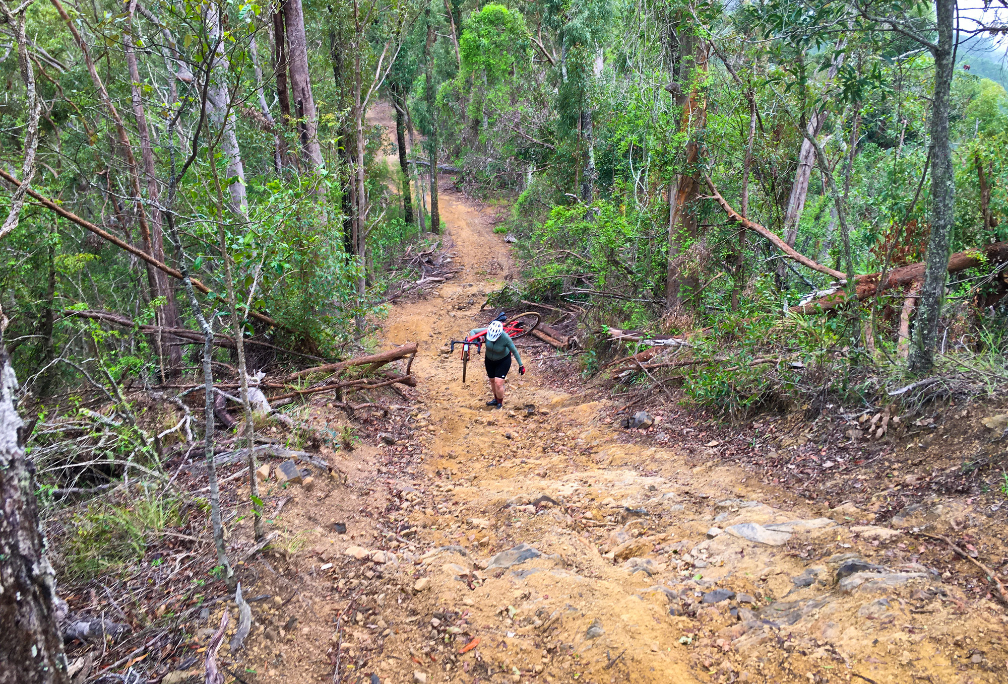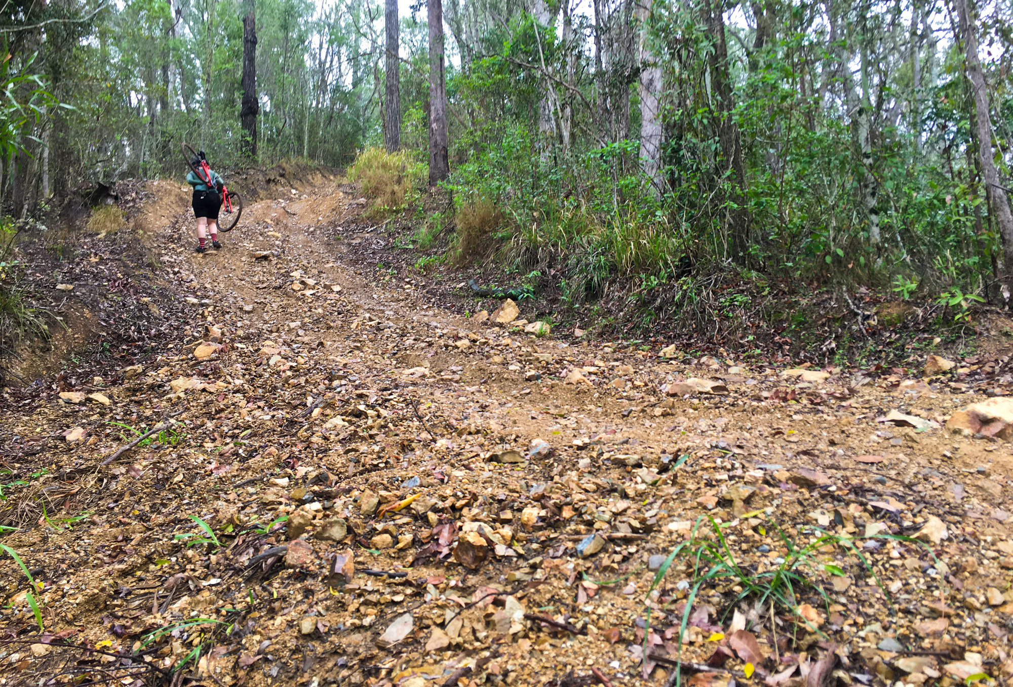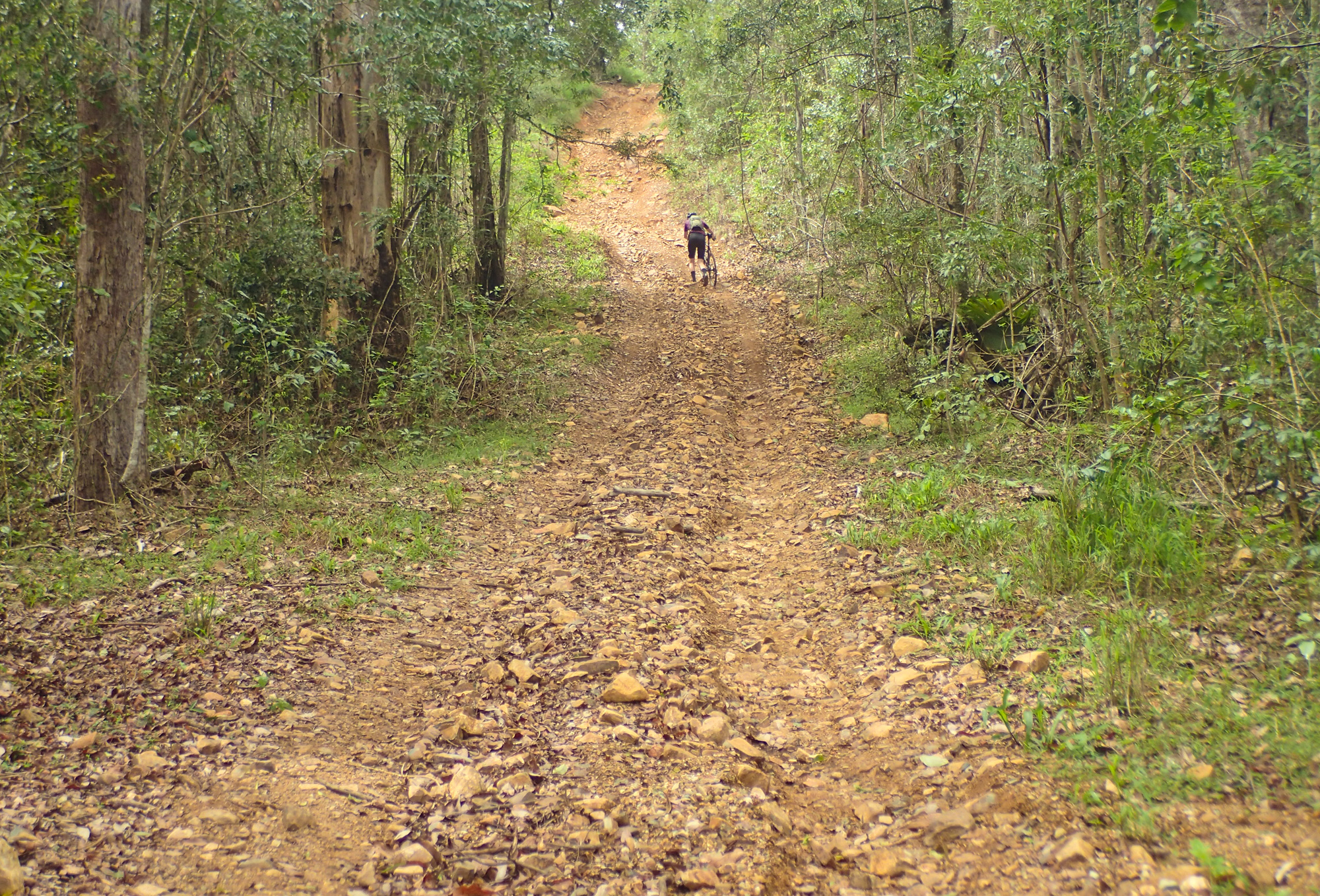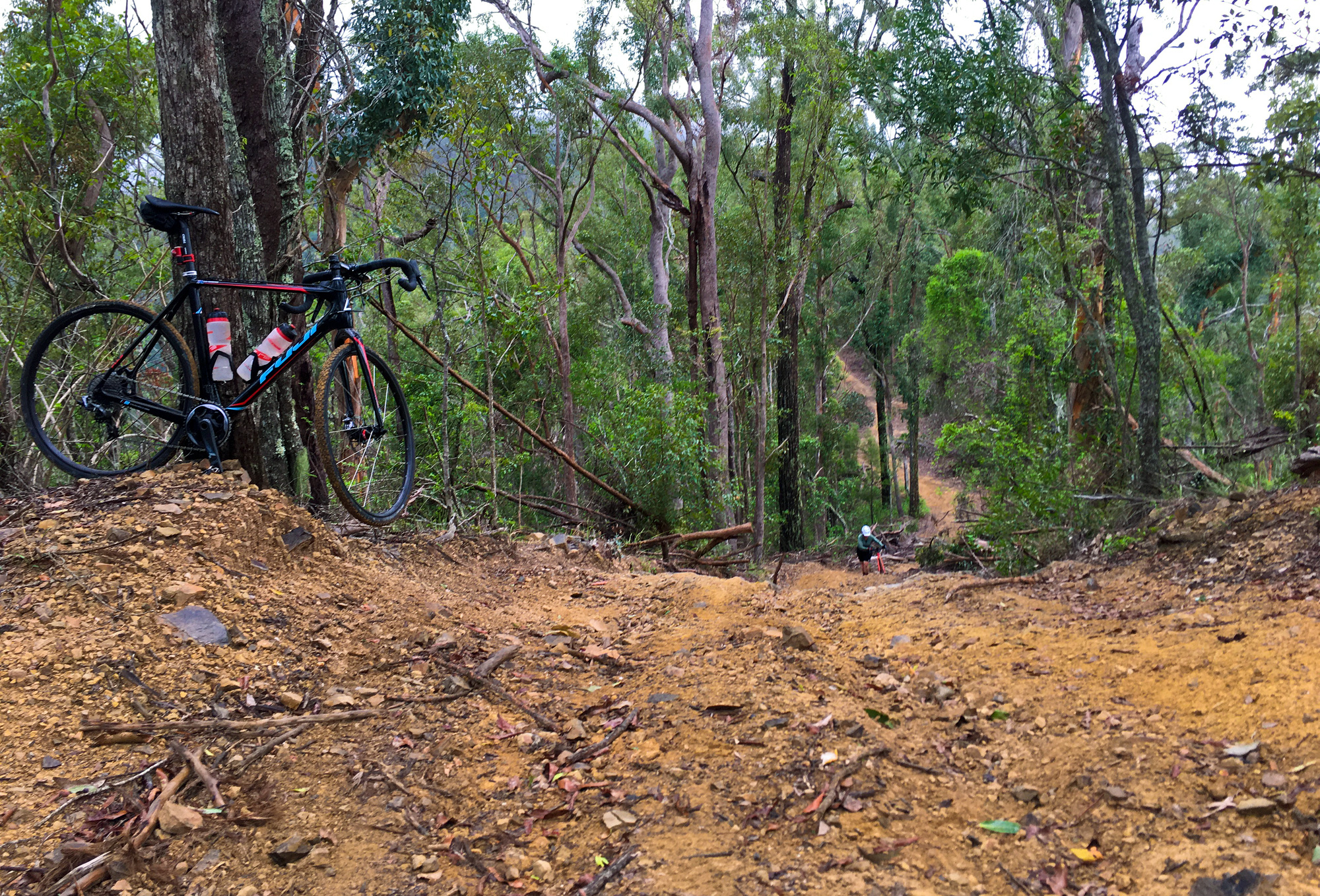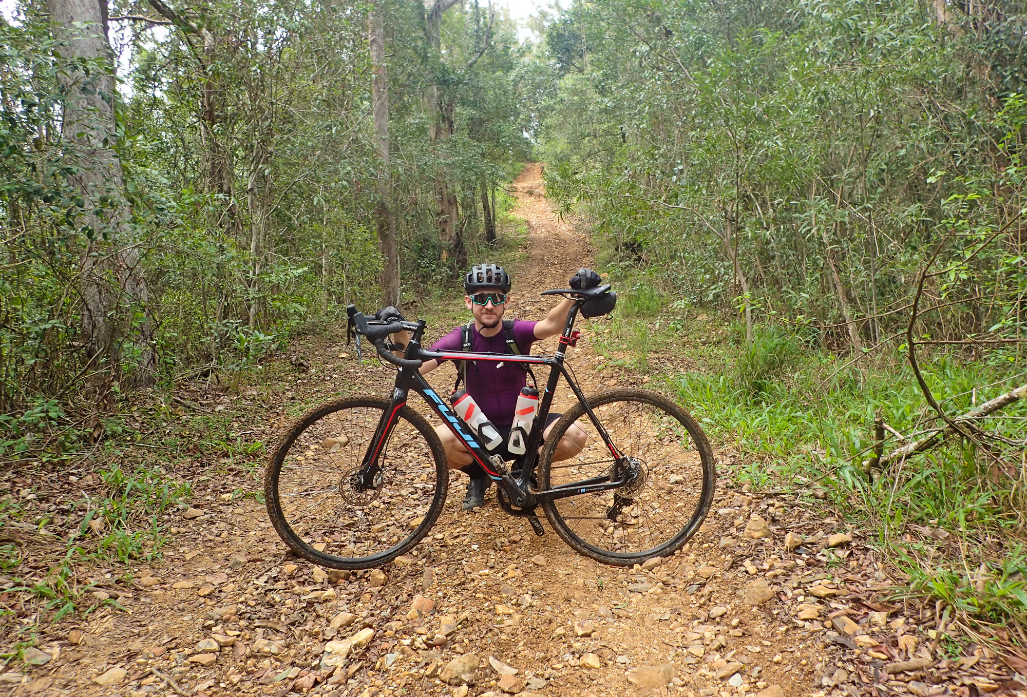 Eventually we made the way to the top of the climb. After removing the built up clay in the pedals, cleats and shoes we started out descent to the bottom of the valley. However it wasn’t to last very long. On the -10% and at times -15% gradients long ruts had formed and combined with the wet thick/tall grass made spotting them difficult which was made even worse with the slippery red clay. It wasn’t long until Bronwyn had her first couple moments shortly followed by a slow speed stack when she lost the front on some slippery clay. Luke quickly followed in a more dramatic fashion as he lost the front on one bit of slippery clay, into a long rut covered in grass, across the track into another rut and eventually losing the rear as it lost traction with the wet clay and spun around. We both decided to attempt the Mulgowie section another day when it wasn’t as wet on the steeper side. As we made our way back to Grandchester Mount Mort Road it still wasn’t stack free. One one -12% section Luke lost the bike on a soft section of clay when the front dug in and the rear slid out at low speed. Once we got back to the dirt road normal riding was resumed. The only problem we now had was avoiding eye level chunks of clay that were now being flicked off our wheels/bikes which was easily solved by grabbing a low hanging stick from a tree and scraping the clay off while riding. Once we got back onto Grandchester Mount Mort Road heading south it was 85% gravel roads over just about every single ridge line all the way back to Rosewood. You couldn’t see them all but when you got to the crest you knew there was another one just on the other side.