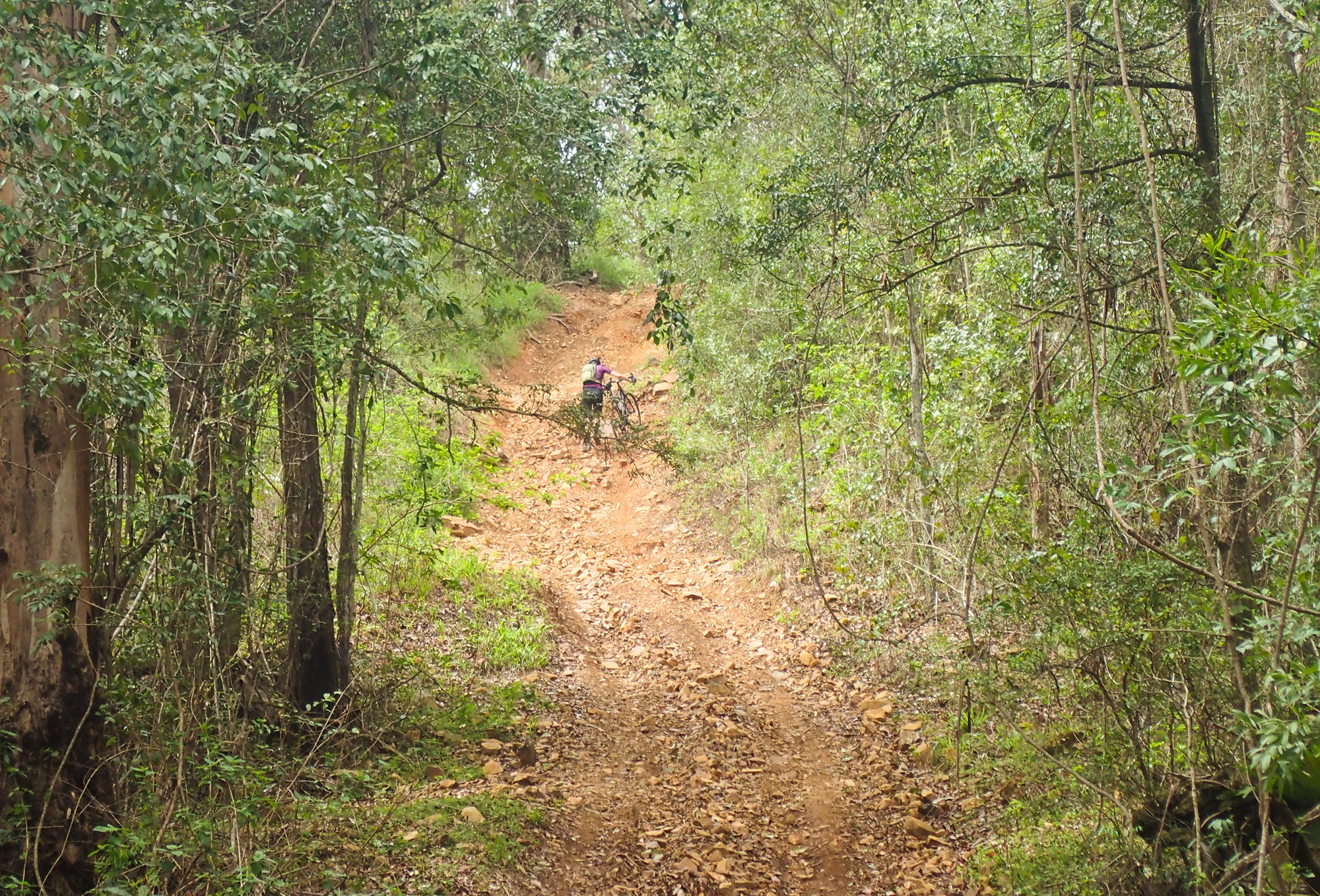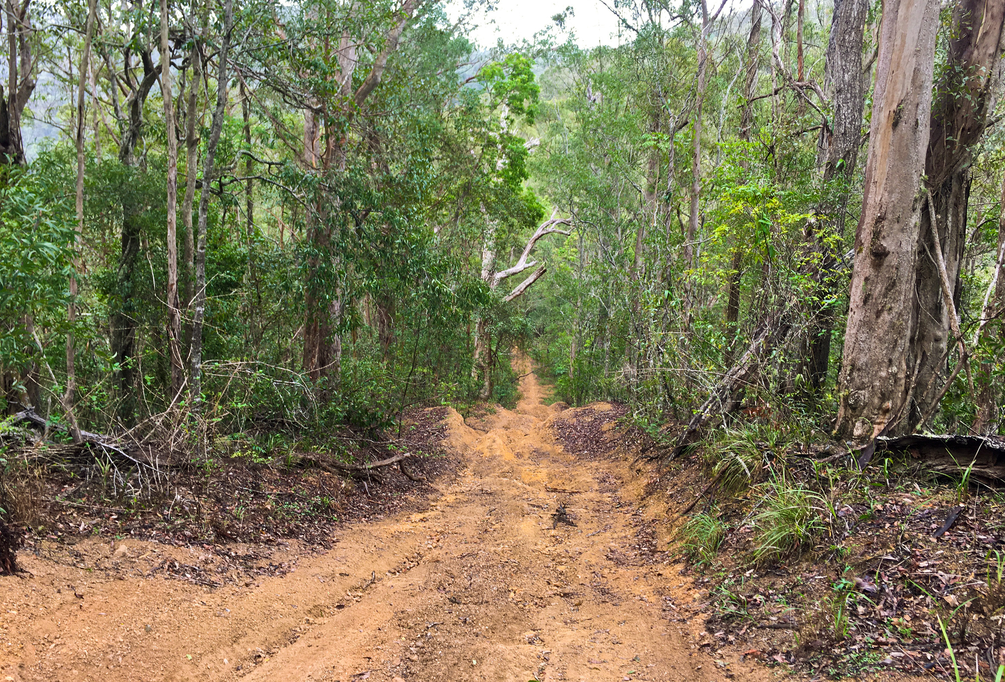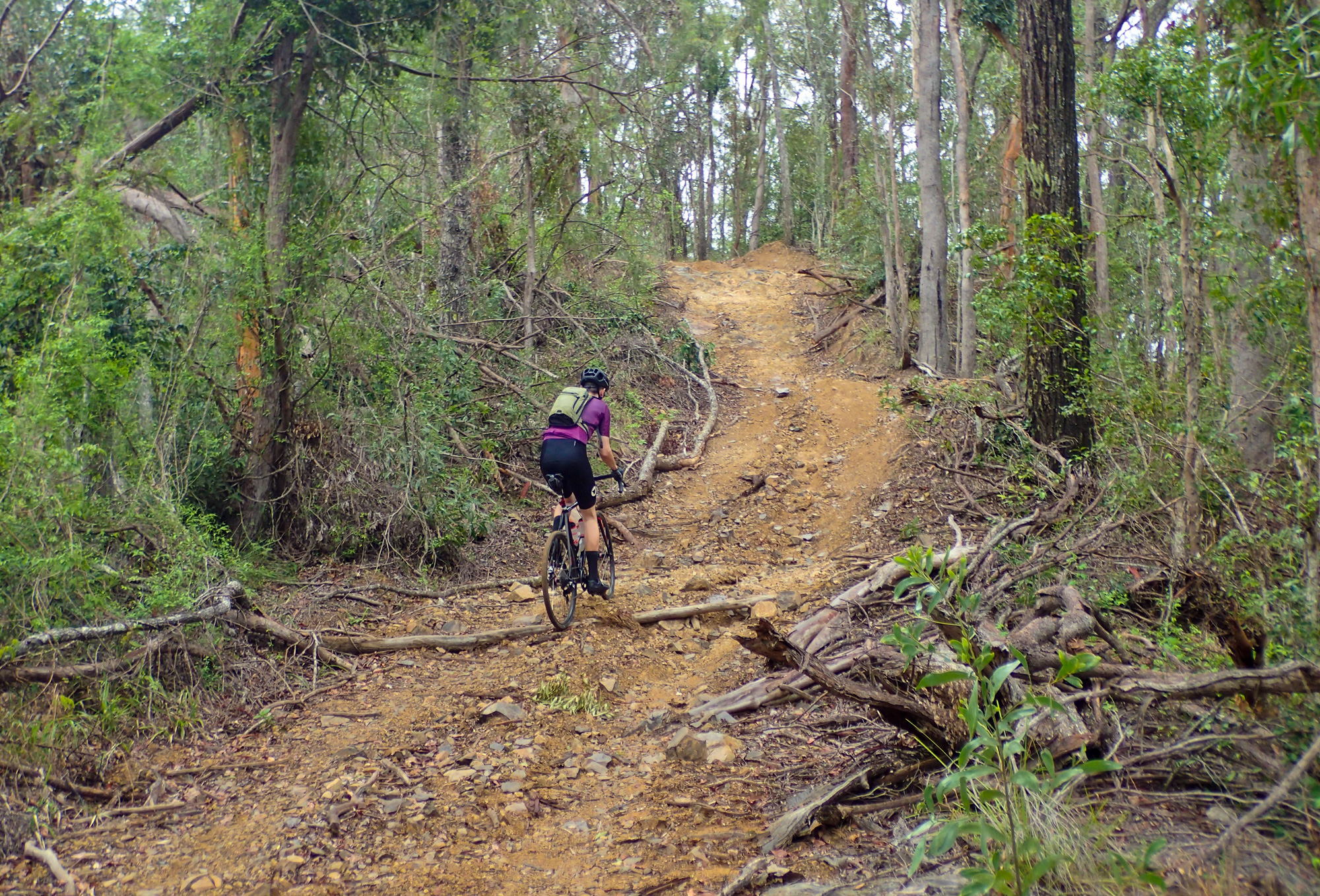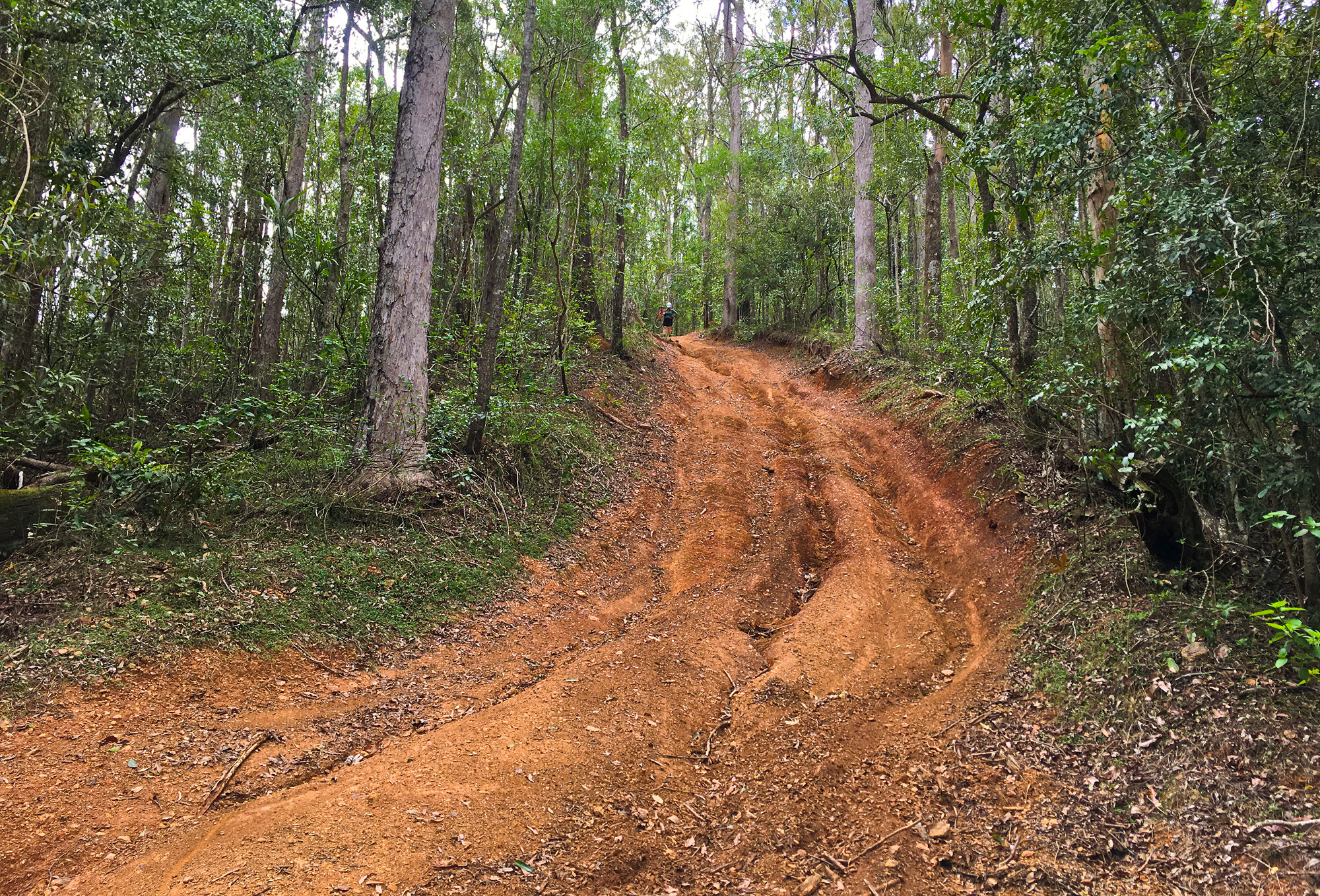 Eventually we made the way to the top of the climb. After removing the built up clay in the pedals, cleats and shoes we started out descent to the bottom of the valley. However it wasn’t to last very long. On the -10% and at times -15% gradients long ruts had formed and combined with the wet thick/tall grass made spotting them difficult which was made even worse with the slippery red clay. It wasn’t long until Bronwyn had her first couple moments shortly followed by a slow speed stack when she lost the front on some slippery clay. Luke quickly followed in a more dramatic fashion as he lost the front on one bit of slippery clay, into a long rut covered in grass, across the track into another rut and eventually losing the rear as it lost traction with the wet clay and spun around. We both decided to attempt the Mulgowie section another day when it wasn’t as wet on the steeper side. As we made our way back to Grandchester Mount Mort Road it still wasn’t stack free. One one -12% section Luke lost the bike on a soft section of clay when the front dug in and the rear slid out at low speed. Once we got back to the dirt road normal riding was resumed. The only problem we now had was avoiding eye level chunks of clay that were now being flicked off our wheels/bikes which was easily solved by grabbing a low hanging stick from a tree and scraping the clay off while riding. Once we got back onto Grandchester Mount Mort Road heading south it was 85% gravel roads over just about every single ridge line all the way back to Rosewood. You couldn’t see them all but when you got to the crest you knew there was another one just on the other side.