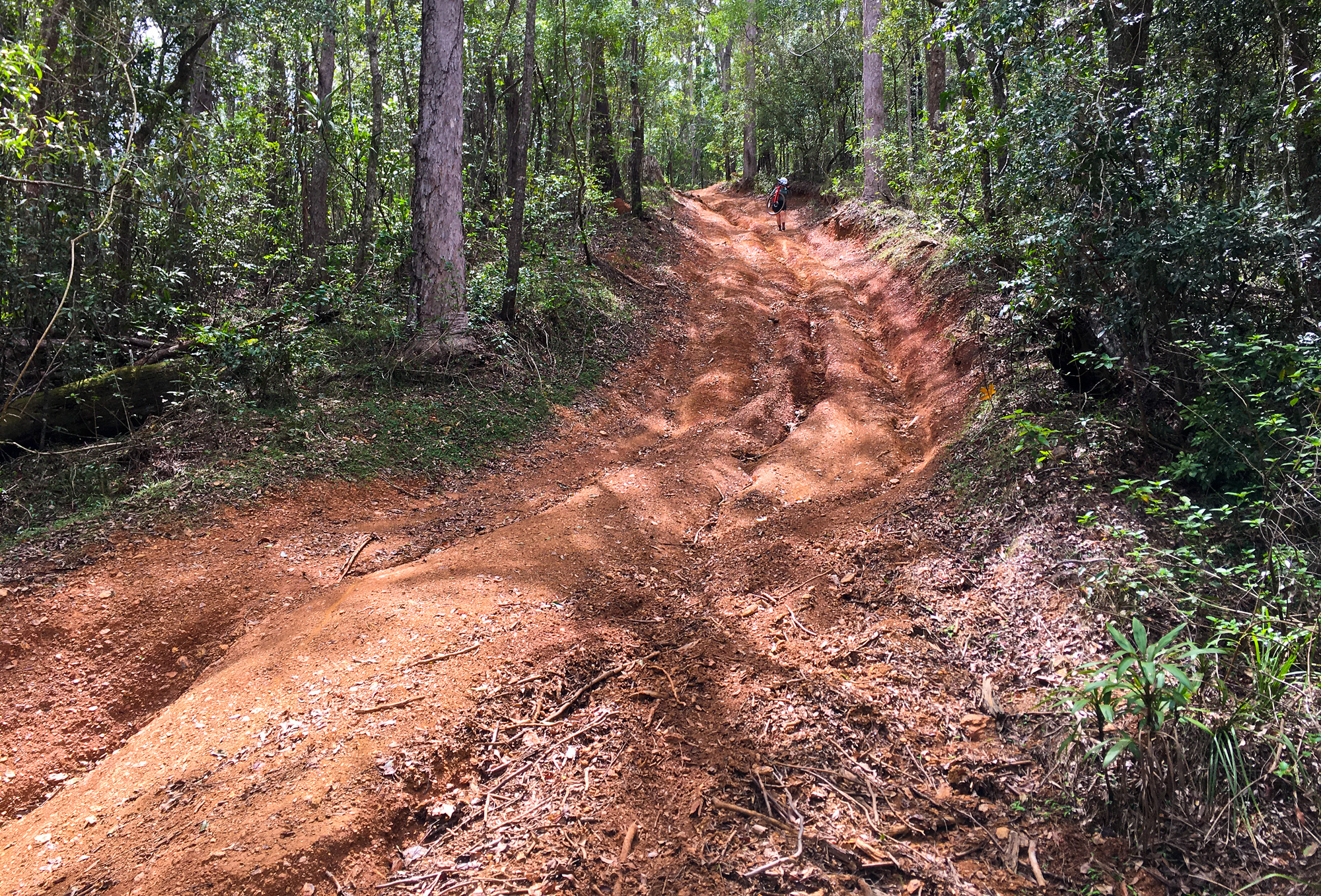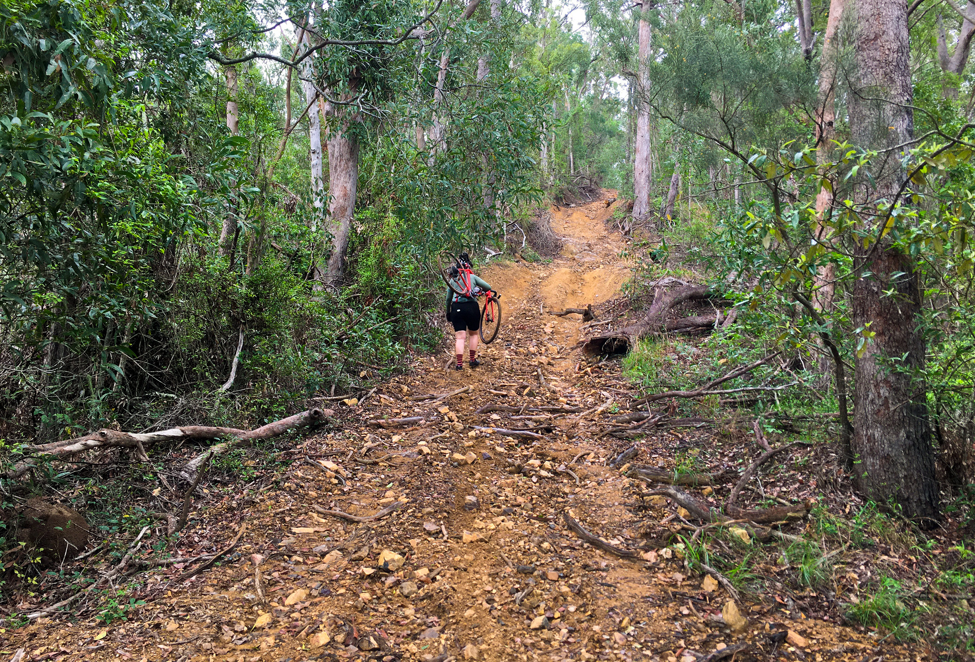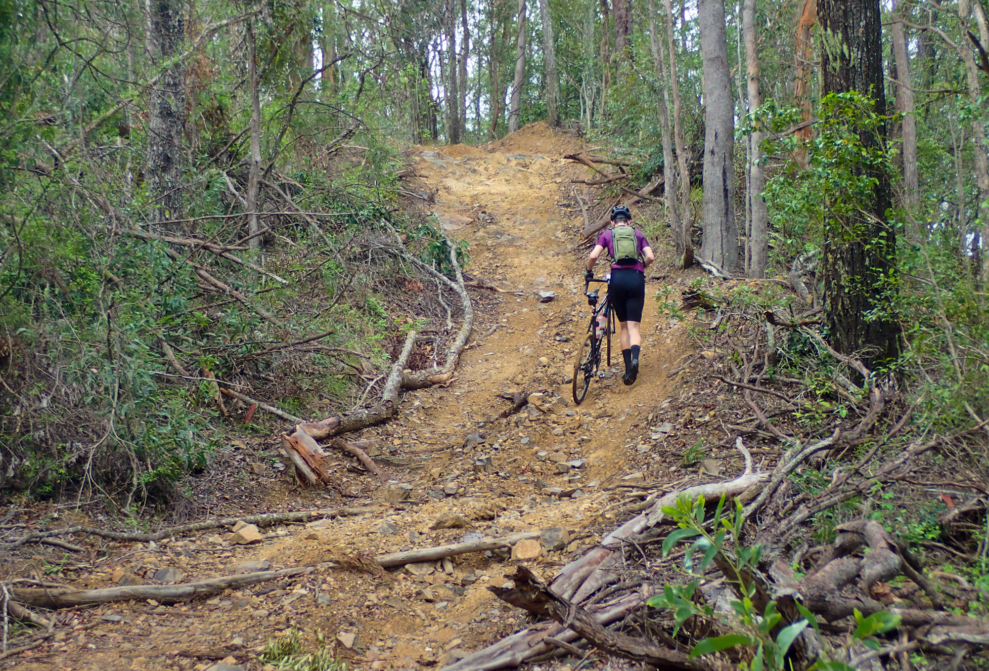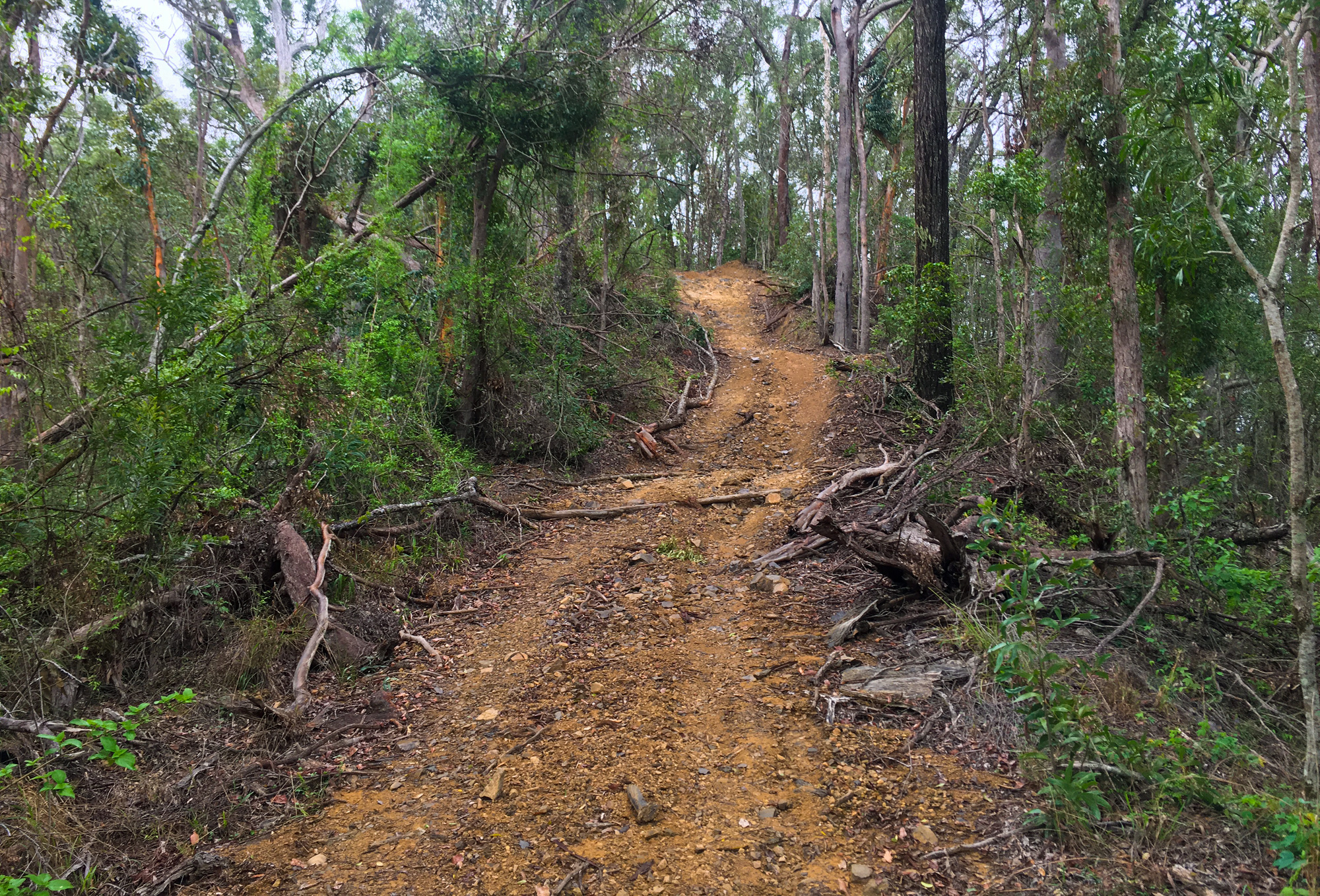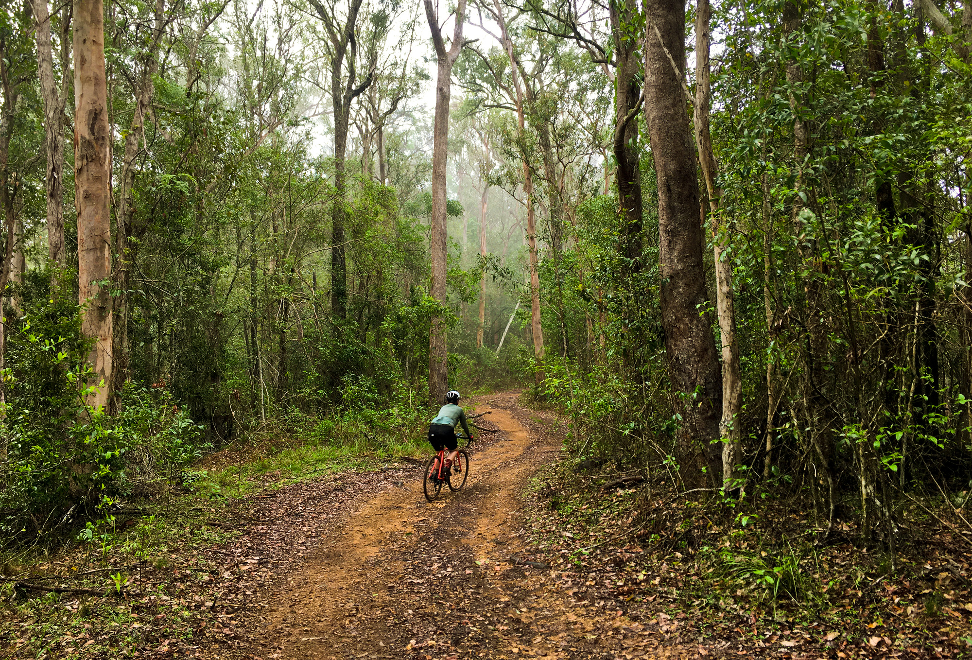 Eventually we made the way to the top of the climb. After removing the built up clay in the pedals, cleats and shoes we started out descent to the bottom of the valley. However it wasn’t to last very long. On the -10% and at times -15% gradients long ruts had formed and combined with the wet thick/tall grass made spotting them difficult which was made even worse with the slippery red clay. It wasn’t long until Bronwyn had her first couple moments shortly followed by a slow speed stack when she lost the front on some slippery clay. Luke quickly followed in a more dramatic fashion as he lost the front on one bit of slippery clay, into a long rut covered in grass, across the track into another rut and eventually losing the rear as it lost traction with the wet clay and spun around. We both decided to attempt the Mulgowie section another day when it wasn’t as wet on the steeper side. As we made our way back to Grandchester Mount Mort Road it still wasn’t stack free. One one -12% section Luke lost the bike on a soft section of clay when the front dug in and the rear slid out at low speed. Once we got back to the dirt road normal riding was resumed. The only problem we now had was avoiding eye level chunks of clay that were now being flicked off our wheels/bikes which was easily solved by grabbing a low hanging stick from a tree and scraping the clay off while riding. Once we got back onto Grandchester Mount Mort Road heading south it was 85% gravel roads over just about every single ridge line all the way back to Rosewood. You couldn’t see them all but when you got to the crest you knew there was another one just on the other side.