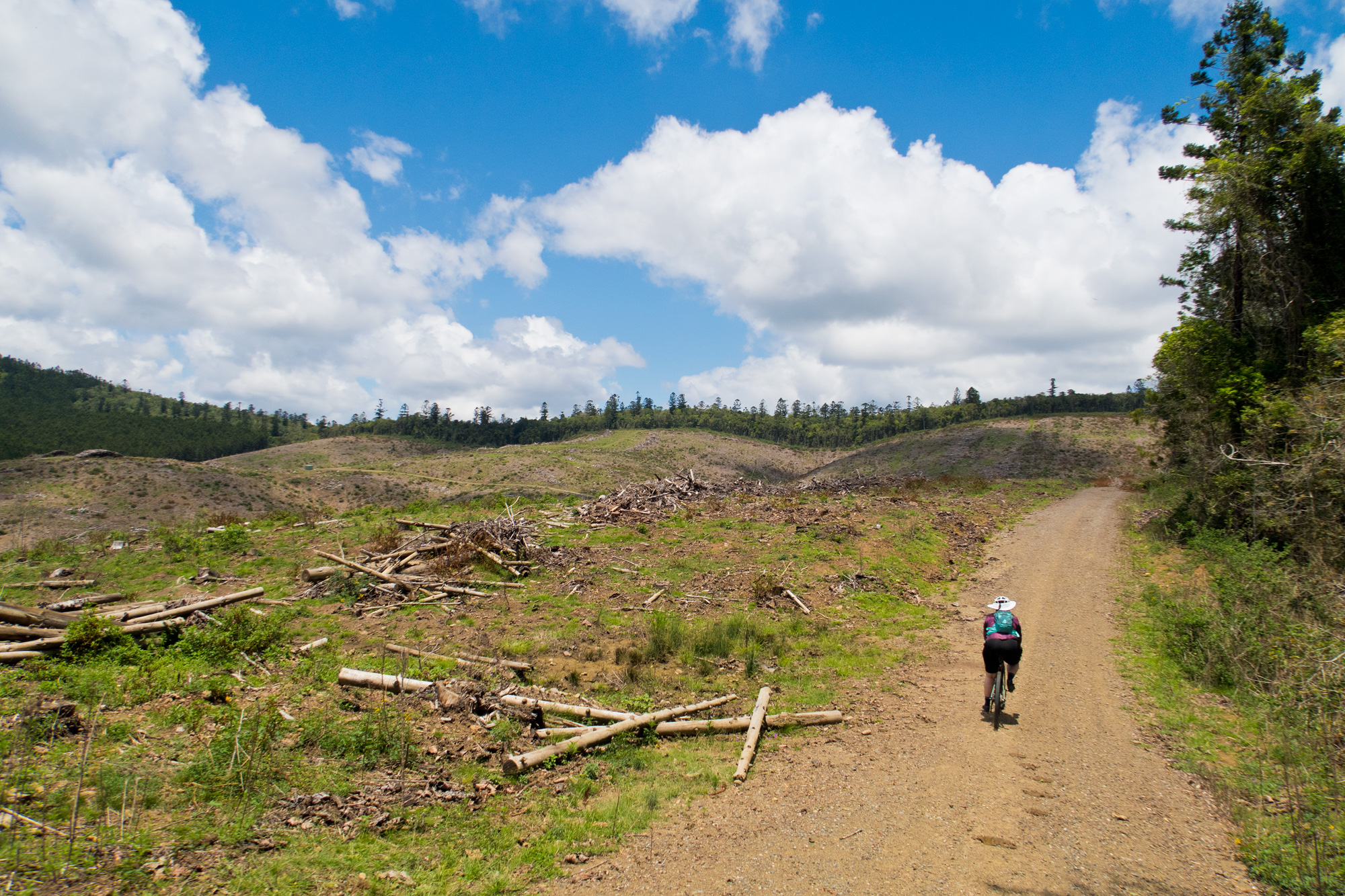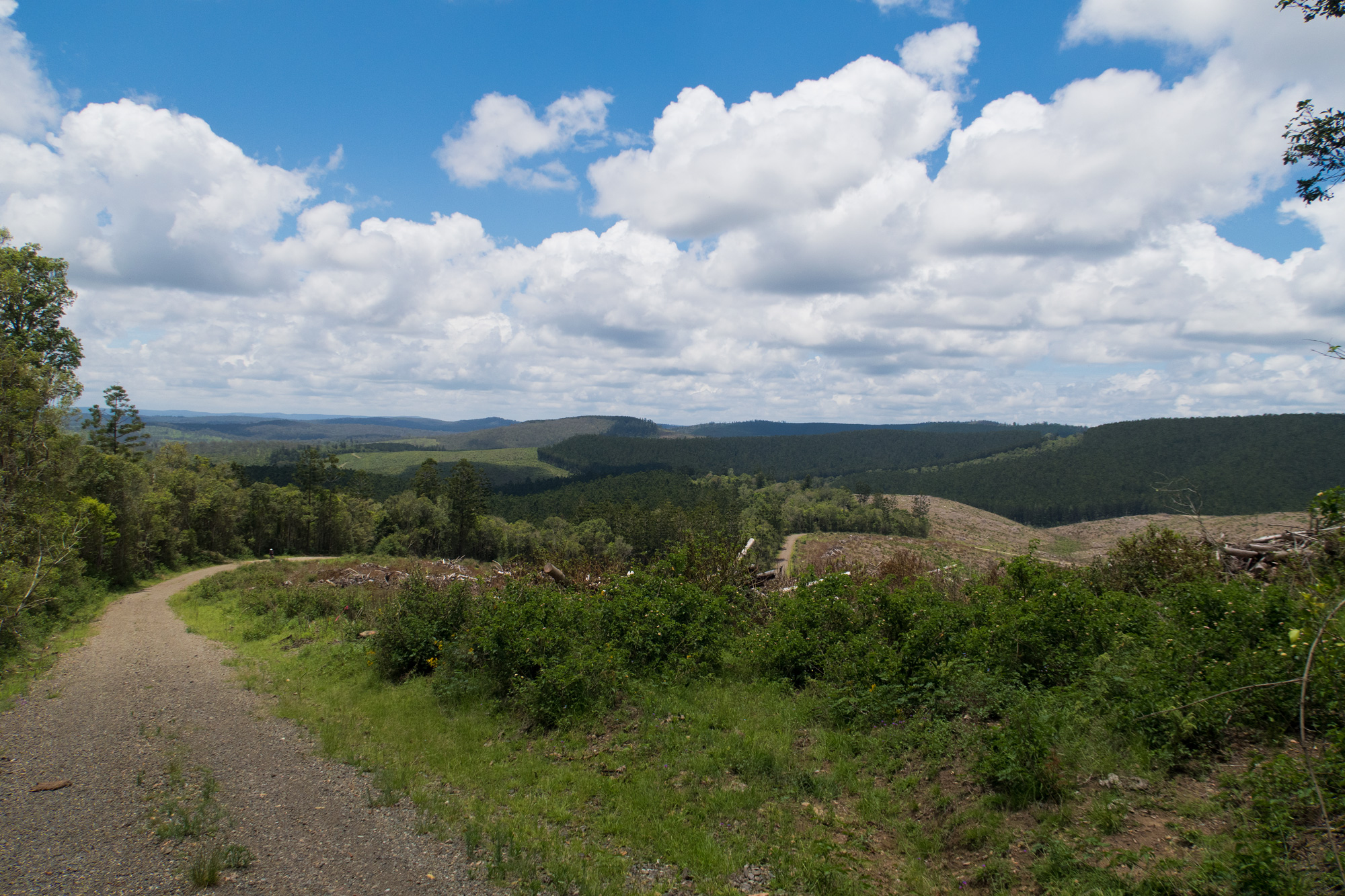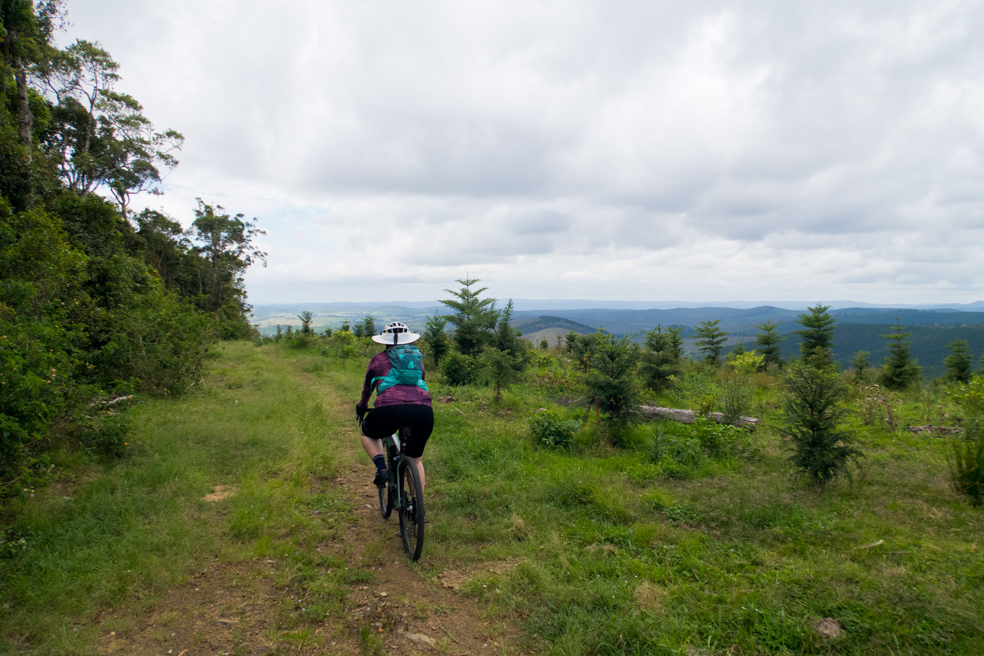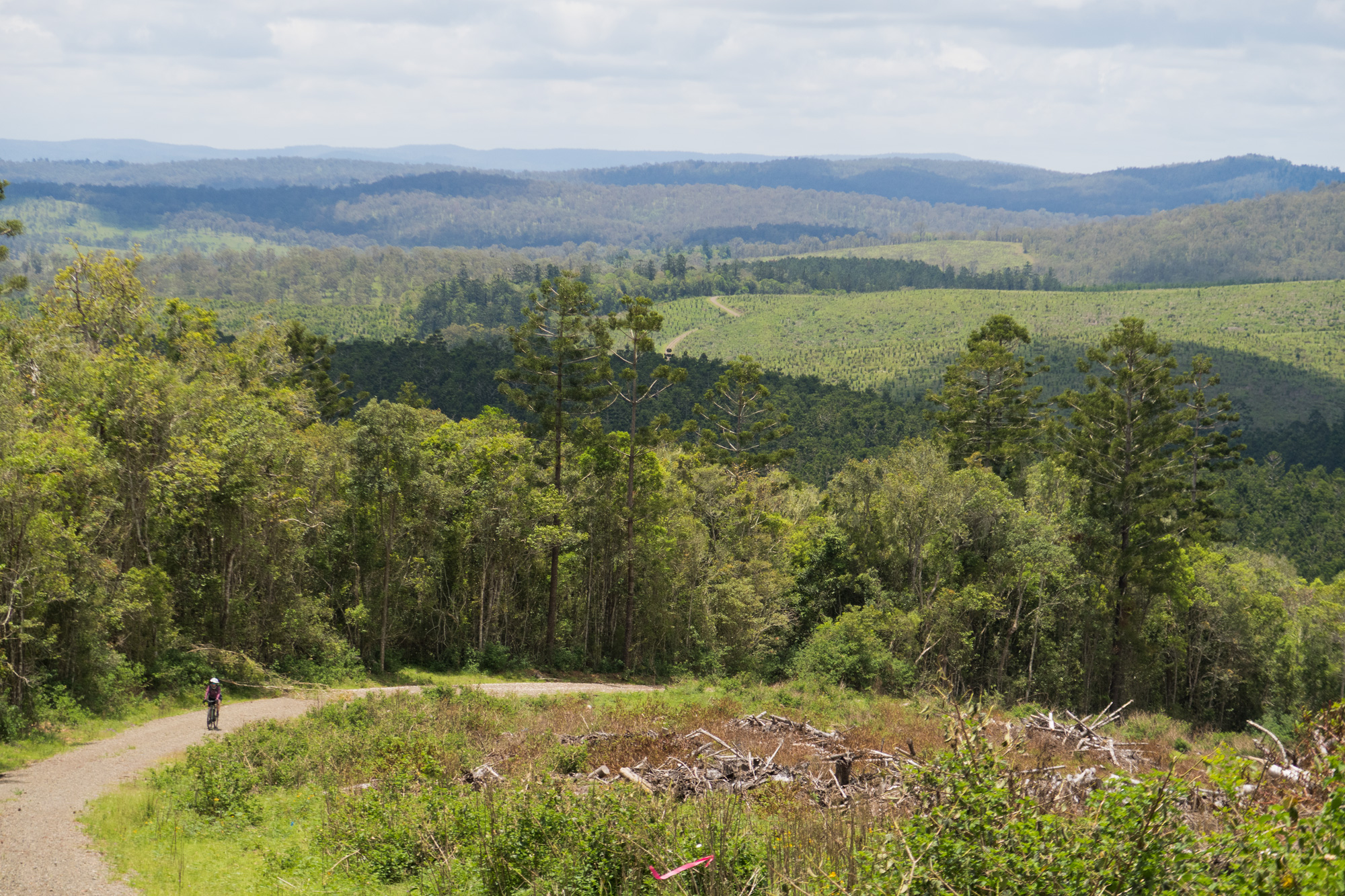 While we were having our pre prepared chicken sandwich brunch at the lookout we further checked our maps for possible alternative routes to get back to the Western Branch road without going via Elgin Vale or back along the track we just came. As we’d have to back track if it wasn’t passable we decided to cut off the loops to the east and instead check out some of the loops to the west. One route linked up to the Western Branch Road however it was the same track that was earlier covered in Lantana and weeds. As it was starting to get a bit warm now we headed off. The descent was a little steeper and rougher than last time as the logging track had lost all its road base since we had last ridden it. On the way down we past a large black dog (actually a cow) that just stared at us before running off. Eventually we got to the bottom and started our way west. This is where we first started seeing that the area had been somewhat recently logged so we had good expectations that the tracks should be passable and as we came out into an open area we could see the track go up and over the ridges so it was looking promising. But by now the heat had really started to build and since there was no longer any pine plantation it was hot, open and exposed. So we made the decision to cut the loops off and make a straight run back into the cooler temperature pine forests much to Bronwyns delight as she was starting to struggle just before the turn to head west.