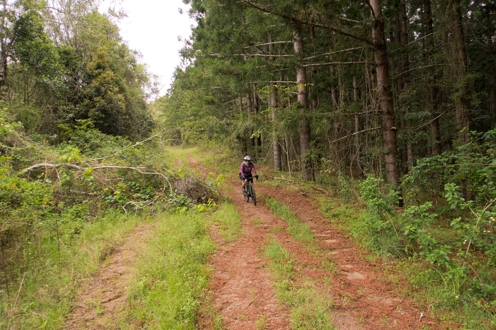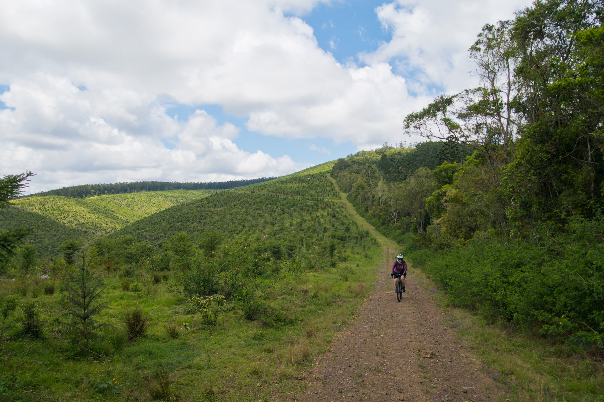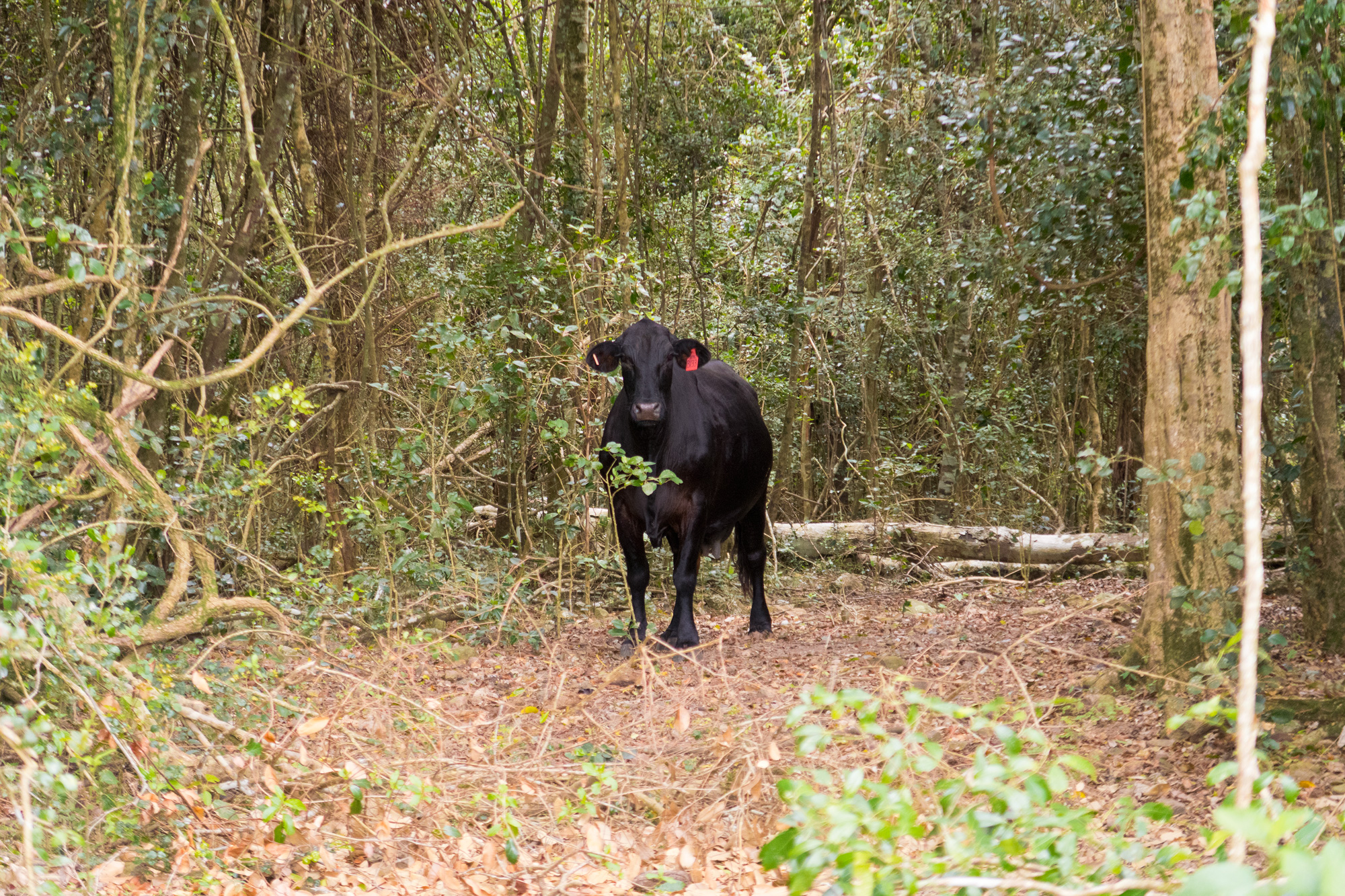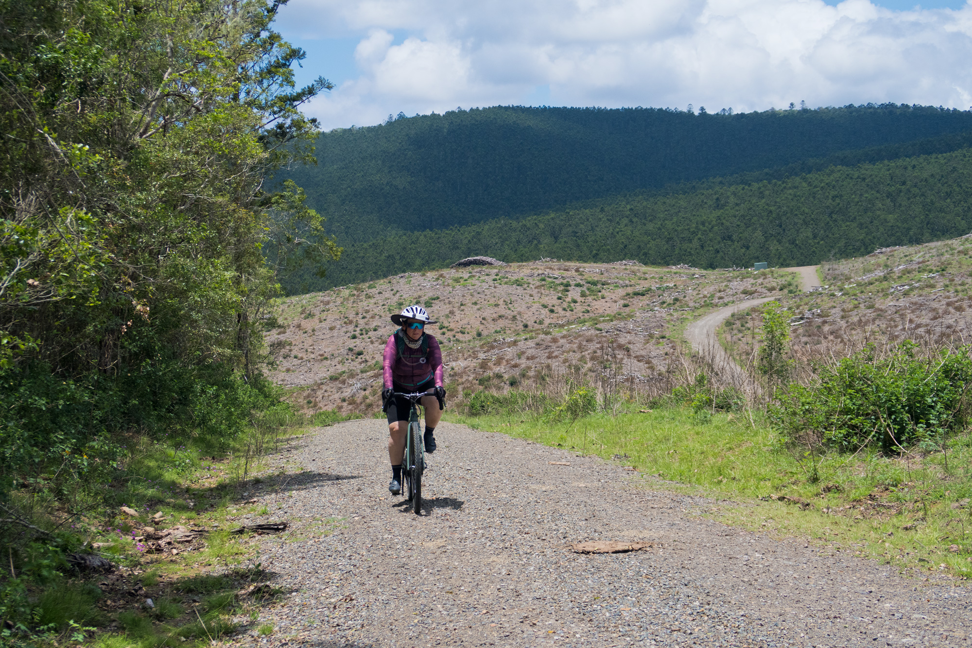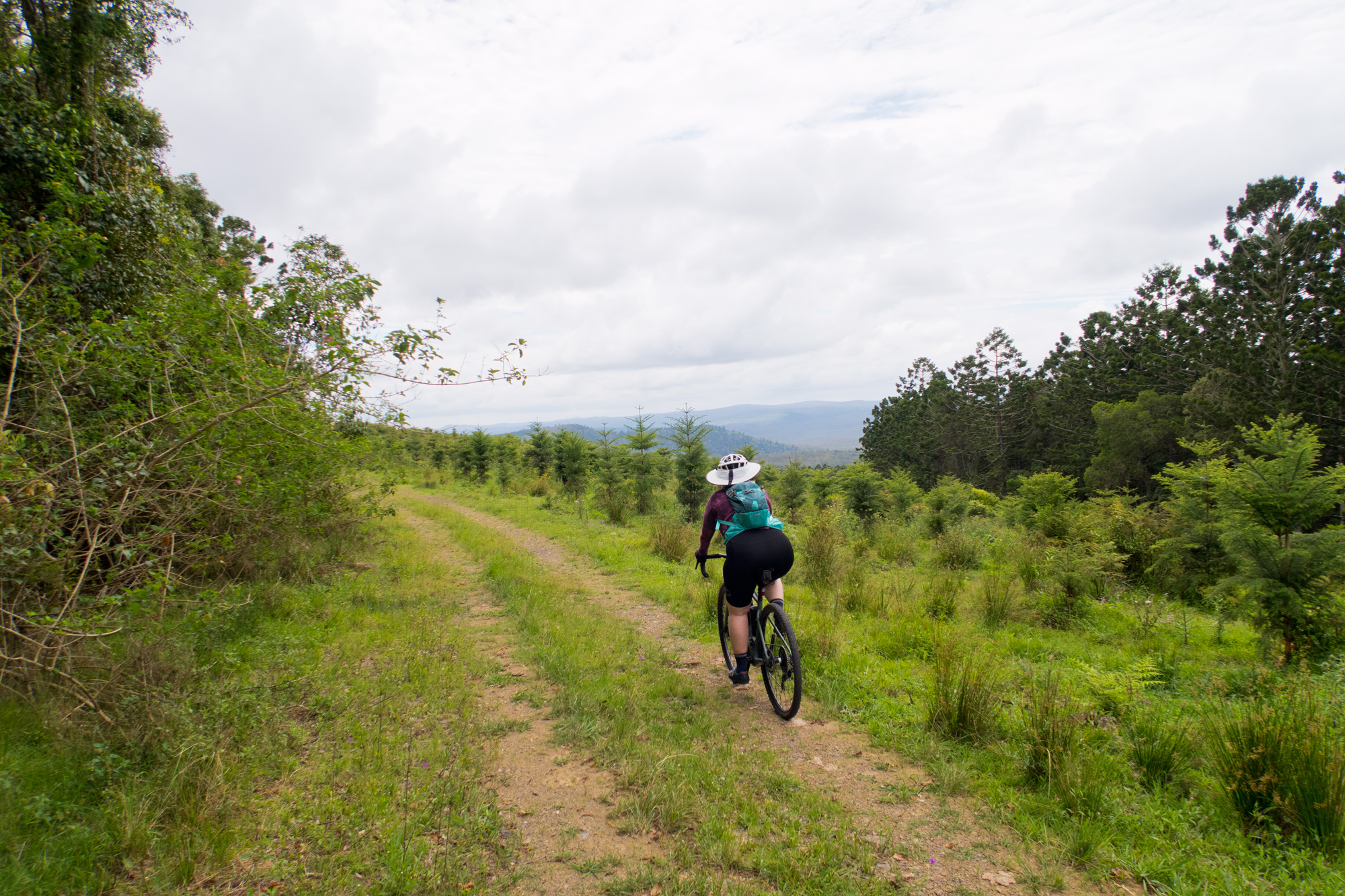 While we were having our pre prepared chicken sandwich brunch at the lookout we further checked our maps for possible alternative routes to get back to the Western Branch road without going via Elgin Vale or back along the track we just came. As we’d have to back track if it wasn’t passable we decided to cut off the loops to the east and instead check out some of the loops to the west. One route linked up to the Western Branch Road however it was the same track that was earlier covered in Lantana and weeds. As it was starting to get a bit warm now we headed off. The descent was a little steeper and rougher than last time as the logging track had lost all its road base since we had last ridden it. On the way down we past a large black dog (actually a cow) that just stared at us before running off. Eventually we got to the bottom and started our way west. This is where we first started seeing that the area had been somewhat recently logged so we had good expectations that the tracks should be passable and as we came out into an open area we could see the track go up and over the ridges so it was looking promising. But by now the heat had really started to build and since there was no longer any pine plantation it was hot, open and exposed. So we made the decision to cut the loops off and make a straight run back into the cooler temperature pine forests much to Bronwyns delight as she was starting to struggle just before the turn to head west.
