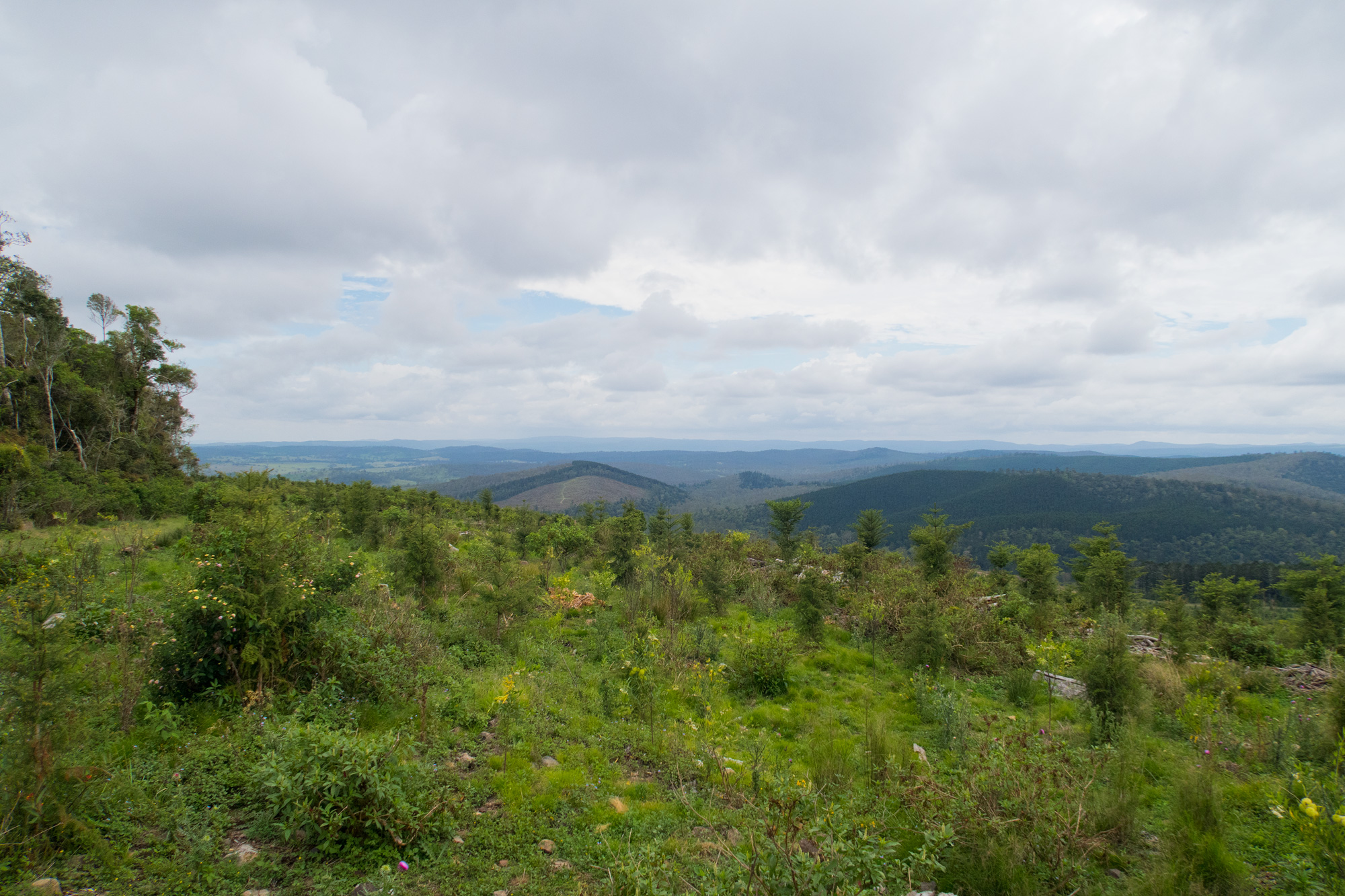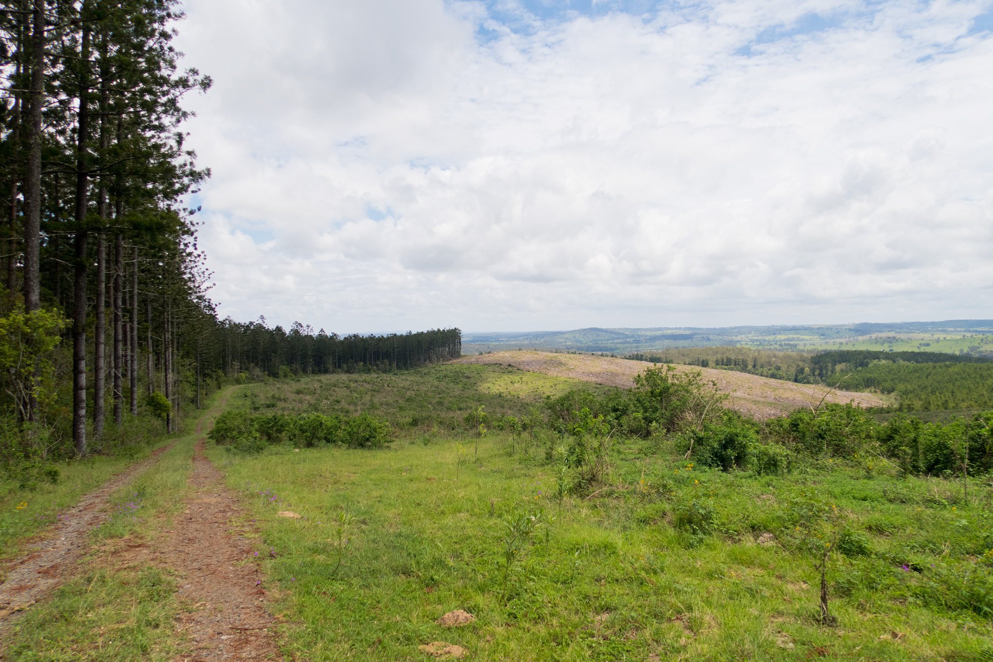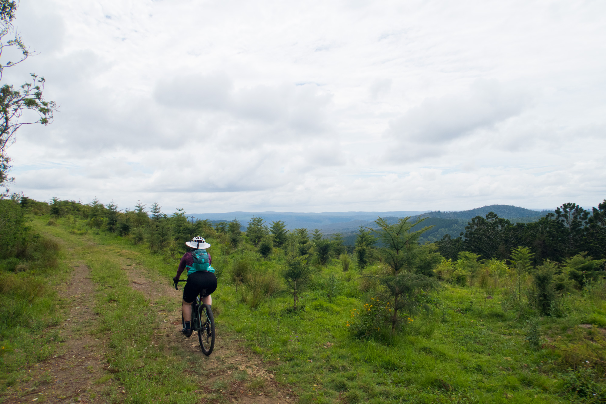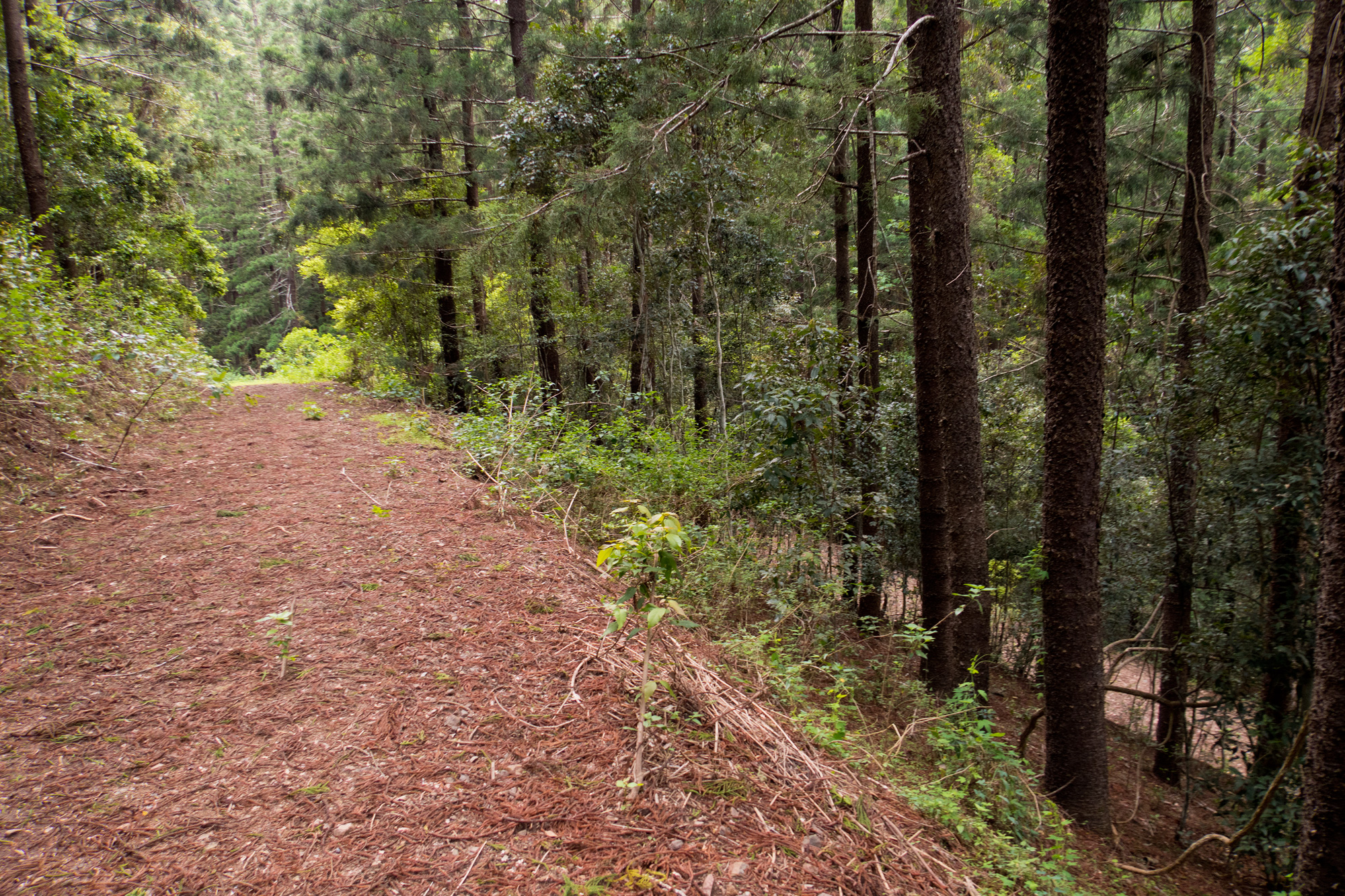 While we were having our pre prepared chicken sandwich brunch at the lookout we further checked our maps for possible alternative routes to get back to the Western Branch road without going via Elgin Vale or back along the track we just came. As we’d have to back track if it wasn’t passable we decided to cut off the loops to the east and instead check out some of the loops to the west. One route linked up to the Western Branch Road however it was the same track that was earlier covered in Lantana and weeds. As it was starting to get a bit warm now we headed off. The descent was a little steeper and rougher than last time as the logging track had lost all its road base since we had last ridden it. On the way down we past a large black dog (actually a cow) that just stared at us before running off. Eventually we got to the bottom and started our way west. This is where we first started seeing that the area had been somewhat recently logged so we had good expectations that the tracks should be passable and as we came out into an open area we could see the track go up and over the ridges so it was looking promising. But by now the heat had really started to build and since there was no longer any pine plantation it was hot, open and exposed. So we made the decision to cut the loops off and make a straight run back into the cooler temperature pine forests much to Bronwyns delight as she was starting to struggle just before the turn to head west.