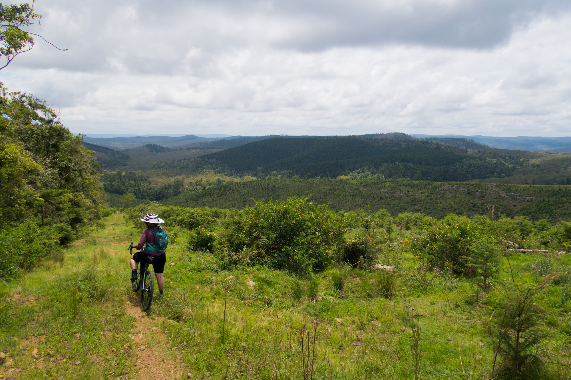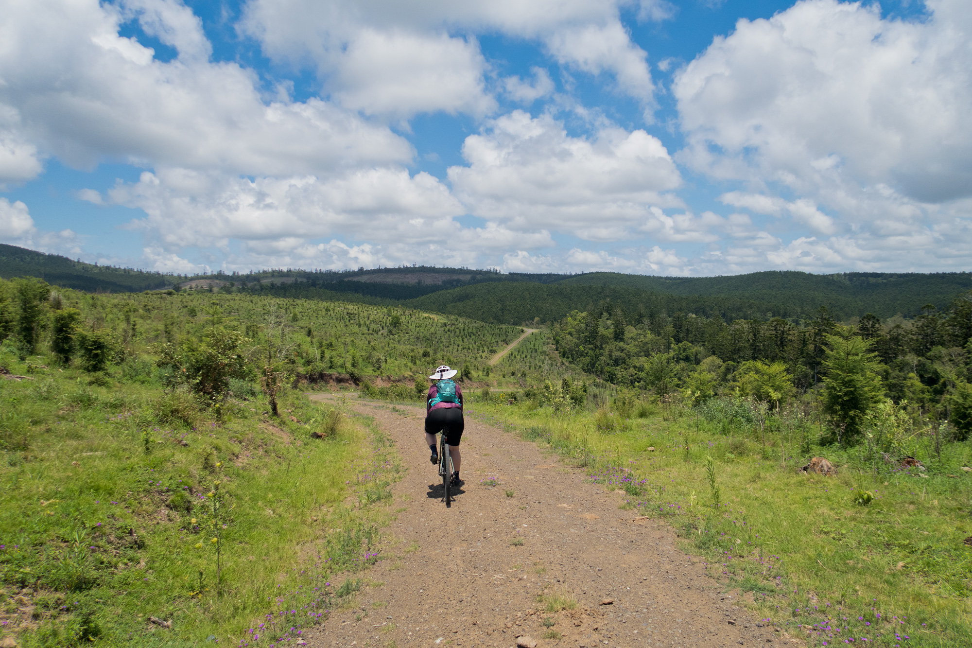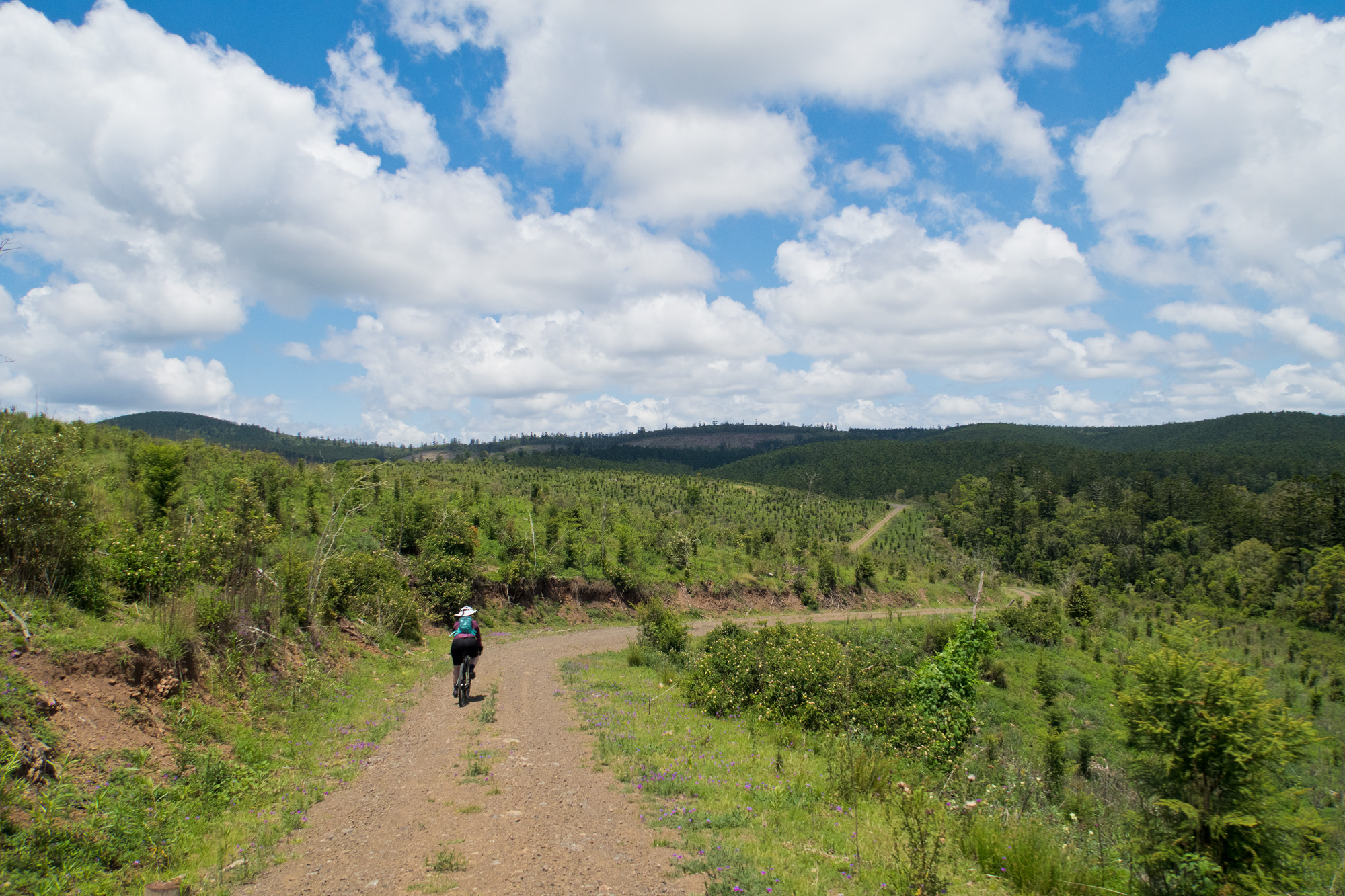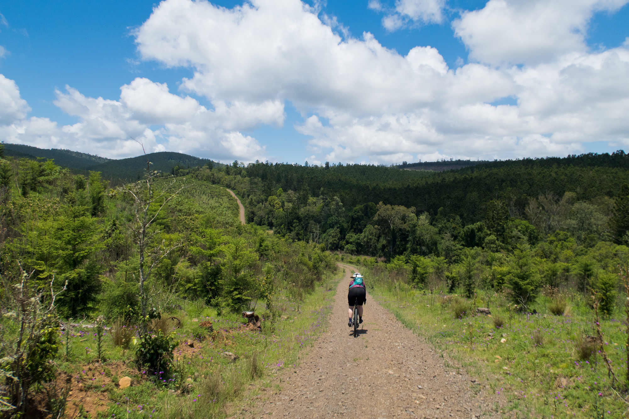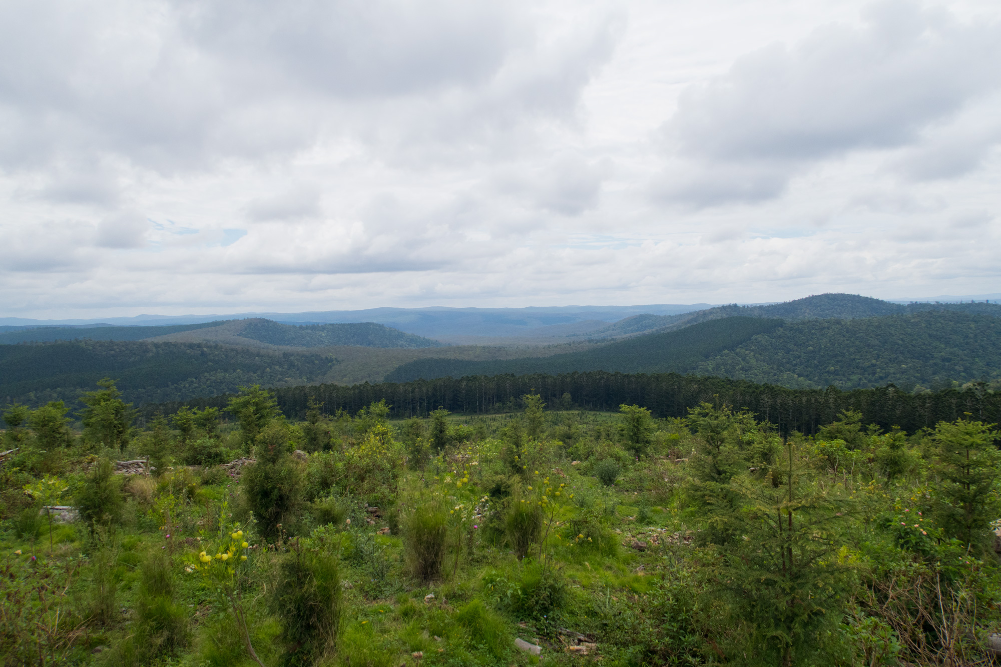 While we were having our pre prepared chicken sandwich brunch at the lookout we further checked our maps for possible alternative routes to get back to the Western Branch road without going via Elgin Vale or back along the track we just came. As we’d have to back track if it wasn’t passable we decided to cut off the loops to the east and instead check out some of the loops to the west. One route linked up to the Western Branch Road however it was the same track that was earlier covered in Lantana and weeds. As it was starting to get a bit warm now we headed off. The descent was a little steeper and rougher than last time as the logging track had lost all its road base since we had last ridden it. On the way down we past a large black dog (actually a cow) that just stared at us before running off. Eventually we got to the bottom and started our way west. This is where we first started seeing that the area had been somewhat recently logged so we had good expectations that the tracks should be passable and as we came out into an open area we could see the track go up and over the ridges so it was looking promising. But by now the heat had really started to build and since there was no longer any pine plantation it was hot, open and exposed. So we made the decision to cut the loops off and make a straight run back into the cooler temperature pine forests much to Bronwyns delight as she was starting to struggle just before the turn to head west.