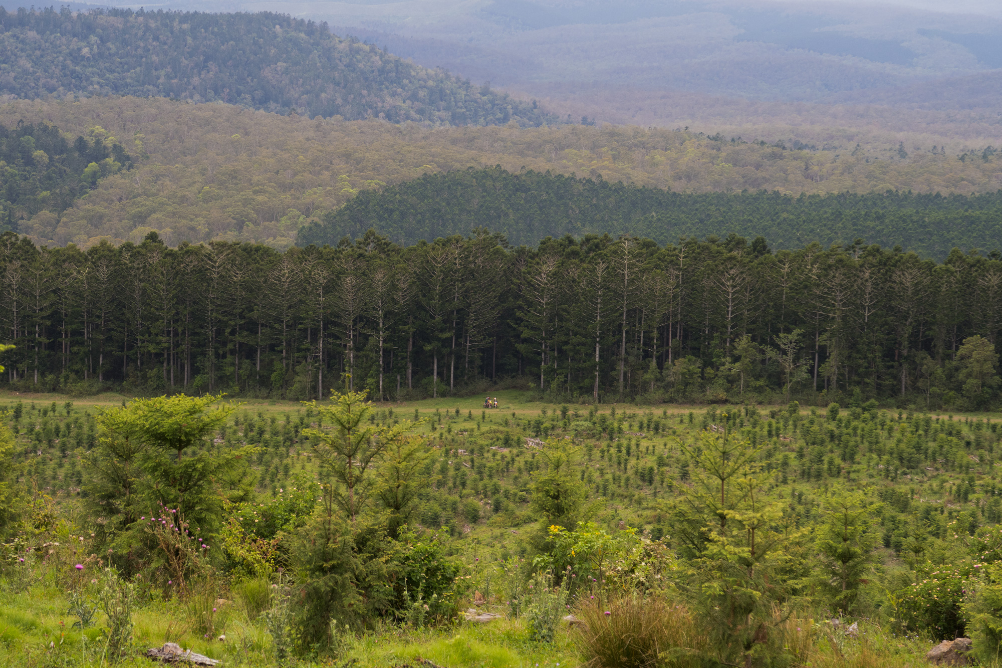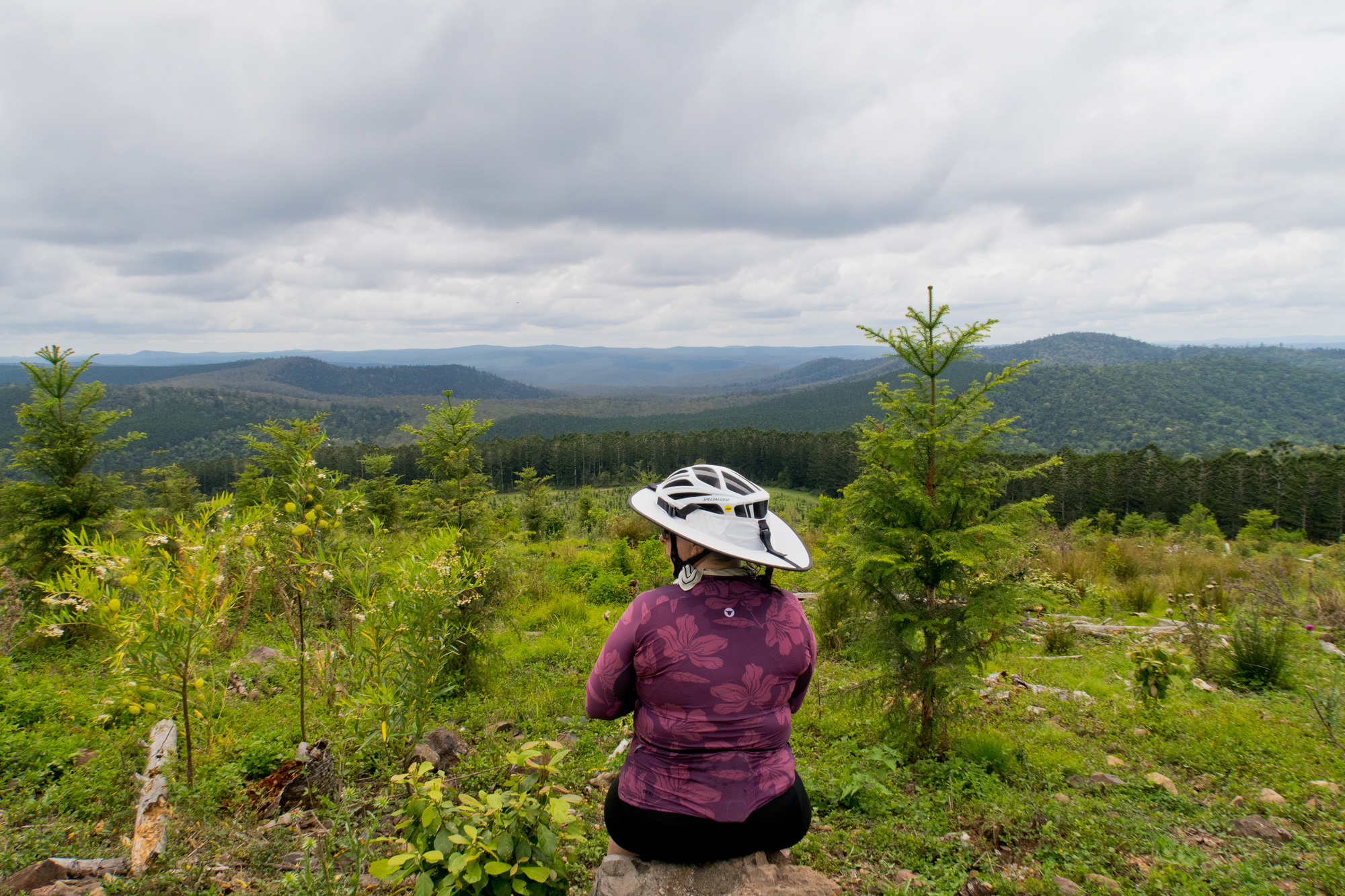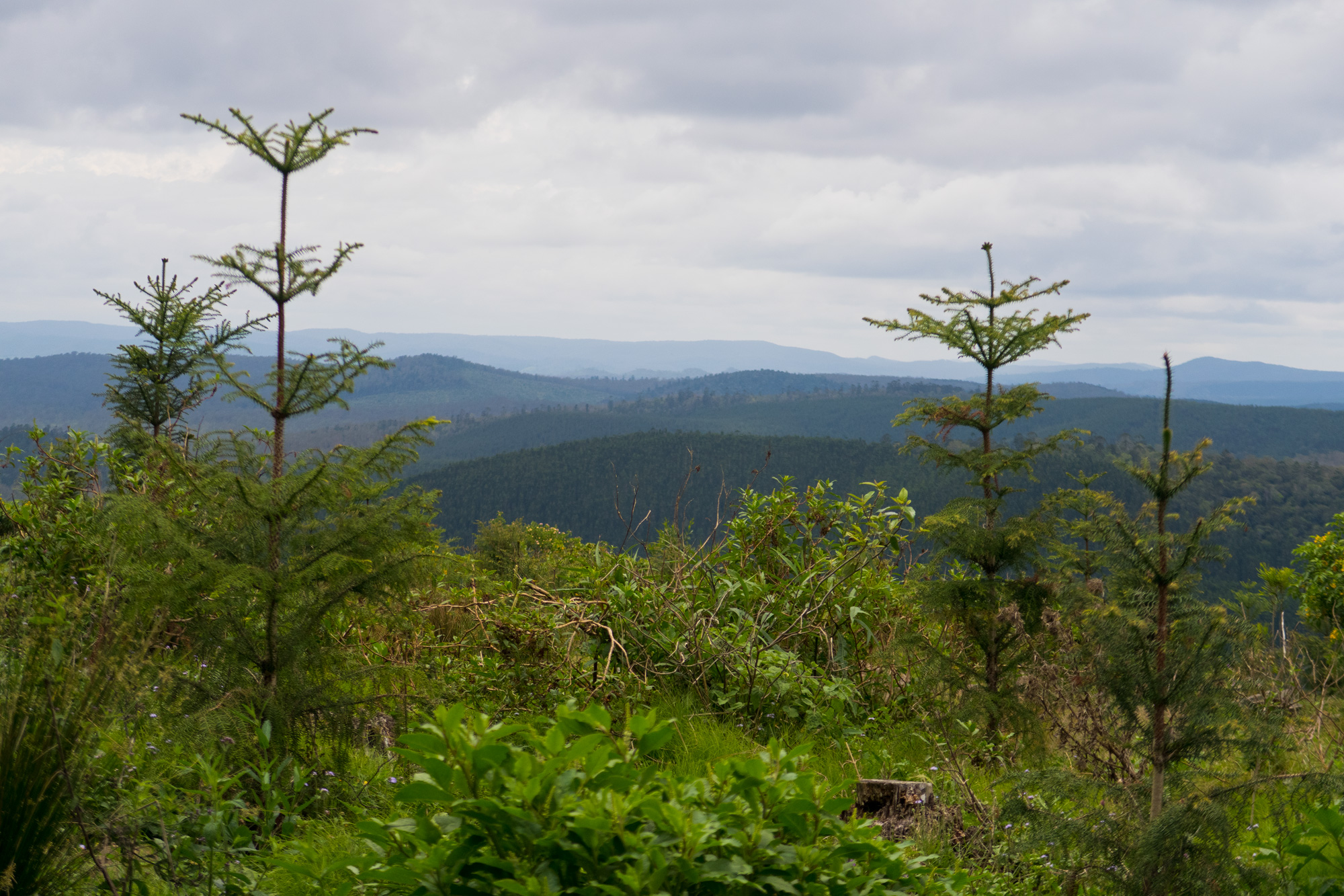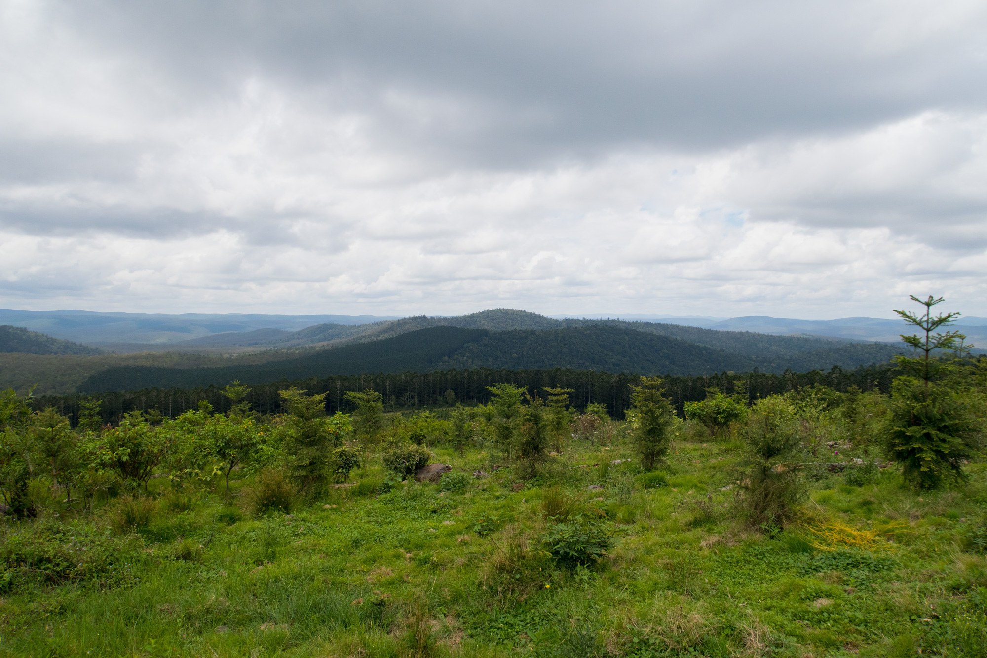 While we were having our pre prepared chicken sandwich brunch at the lookout we further checked our maps for possible alternative routes to get back to the Western Branch road without going via Elgin Vale or back along the track we just came. As we’d have to back track if it wasn’t passable we decided to cut off the loops to the east and instead check out some of the loops to the west. One route linked up to the Western Branch Road however it was the same track that was earlier covered in Lantana and weeds. As it was starting to get a bit warm now we headed off. The descent was a little steeper and rougher than last time as the logging track had lost all its road base since we had last ridden it. On the way down we past a large black dog (actually a cow) that just stared at us before running off. Eventually we got to the bottom and started our way west. This is where we first started seeing that the area had been somewhat recently logged so we had good expectations that the tracks should be passable and as we came out into an open area we could see the track go up and over the ridges so it was looking promising. But by now the heat had really started to build and since there was no longer any pine plantation it was hot, open and exposed. So we made the decision to cut the loops off and make a straight run back into the cooler temperature pine forests much to Bronwyns delight as she was starting to struggle just before the turn to head west.